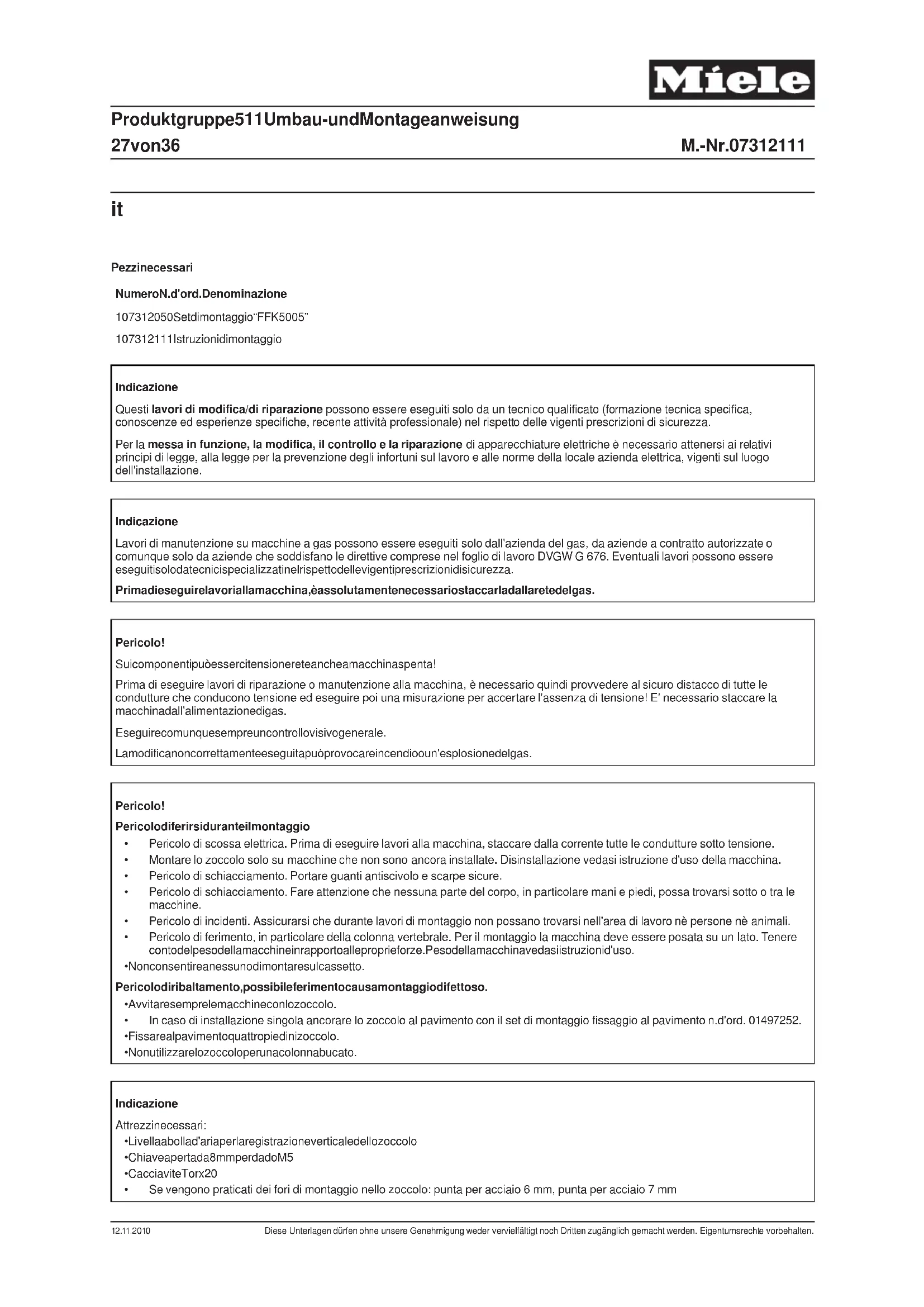 Sigla Spiegazione AV Versione macchina con valvola scarico AW Allacciamento scarico DN 70 Tubo (scarico), diametro nominale 70 mm EL Allacciamento elettrico FFK Cassetto filtro KW Allacciamento acqua fredda (dolce) UM Zoccolo Miele WW Allacciamento acqua calda (dolce) tabella 1: Legenda sezione piano d'installazione – All'occorrenza chiudere l'allacciamento gas. – Staccare la macchina dalla corrente e, all'occorrenza, dal gas e assicurarla contro il reinserimento. Il lato anteriore dello zoccolo è dotato di due fori con Ø 6 mm nella lamiera di copertura, vedasi fig. 1. Il lato posteriore è dotato di due fori Ø 7 mm nella lamiera di copertura e di un foro per ognuno del Ø 7 m nei due piedini posteriori, vedasi fig. 2. – Per uno zoccolo non preparato oppure più vecchio sul lato anteriore, vedasi fig. 1, e sul lato posteriore della lamiera di copertura, vedasi fig. 2, devono essere praticati due fori e inoltre un foro nei piedini posteriori. – Applicare la cassetta allacciamenti fig. 3, Pos. 1 dietro sullo zoccolo. – Infilare la lamiera di scarico fig. 3, Pos. 3 con la guida fig. 3, Pos. 2 con 4 viti cilindriche M5 (momento torcente 3,8 Nm). – Infilare la guida fig. 3, Pos. 2 con la lamiera di scarico montata sul retro sui perni filettati della cassetta allacciamenti. L'angolo di battuta nella lamiera di scarico è rivolto verso il lato anteriore. Vedasi fig. 3, Pos. 4. Produktgruppe 511 Umbau- und Montageanweisung 28 von 36 M.-Nr. 07312111 12.11.2010 Diese Unterlagen dürfen ohne unsere Genehmigung weder vervielfältigt noch Dritten zugänglich gemacht werden. Eigentumsrechte vorbehalten.x