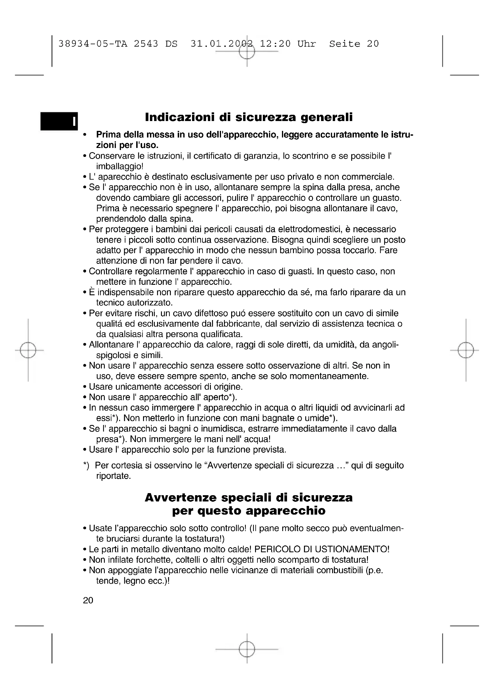 38934-05-TA 2543 DS 31.01.2002 12:20 Uhr Seite 21Garanzia A partire dalla data di acquisto, questo prodotto è garantito dal produttore per un periodo di 24 mesi (scontrino). Durante la durata della garanzia, il produttore eliminerà gratuitamente difetti dell'- apparecchio dovuti a imperfezioni di produzione o di materiale, eventualmente cam- biando l' unità oppure procedendo con le dovute riparazioni. La garanzia è valida solo con lo scontrino. Senza l' esibizione dello scontrino non è possibile fare svolgere le riparazioni gratuitamente. In caso di riparazioni con garanzia, è necessario ritornare al produttore l' appa- recchio intero, nell'imballaggio originale, accompagnato dallo scontrino. In caso di rottura di vetro e difetti agli accessori, i pezzi necessari verranno spediti in cambio gratuitamente. In questo caso è necessario di non spedire l' intero appa- recchio, ma ordinare solo l' accessorio difettoso! Pulizia, manutenzione e scambio non fanno parte della garanzia e sono perciò sono soggetti a spese. La garanzia perde la sua validità se l'apparecchio è sottomesso all' intervento di terzi. Dopo la garanzia Quando la garanzia è scaduta, le riparazioni devono essere effettuate da un nego- zio od un servizio specializzato, contro pagamento.