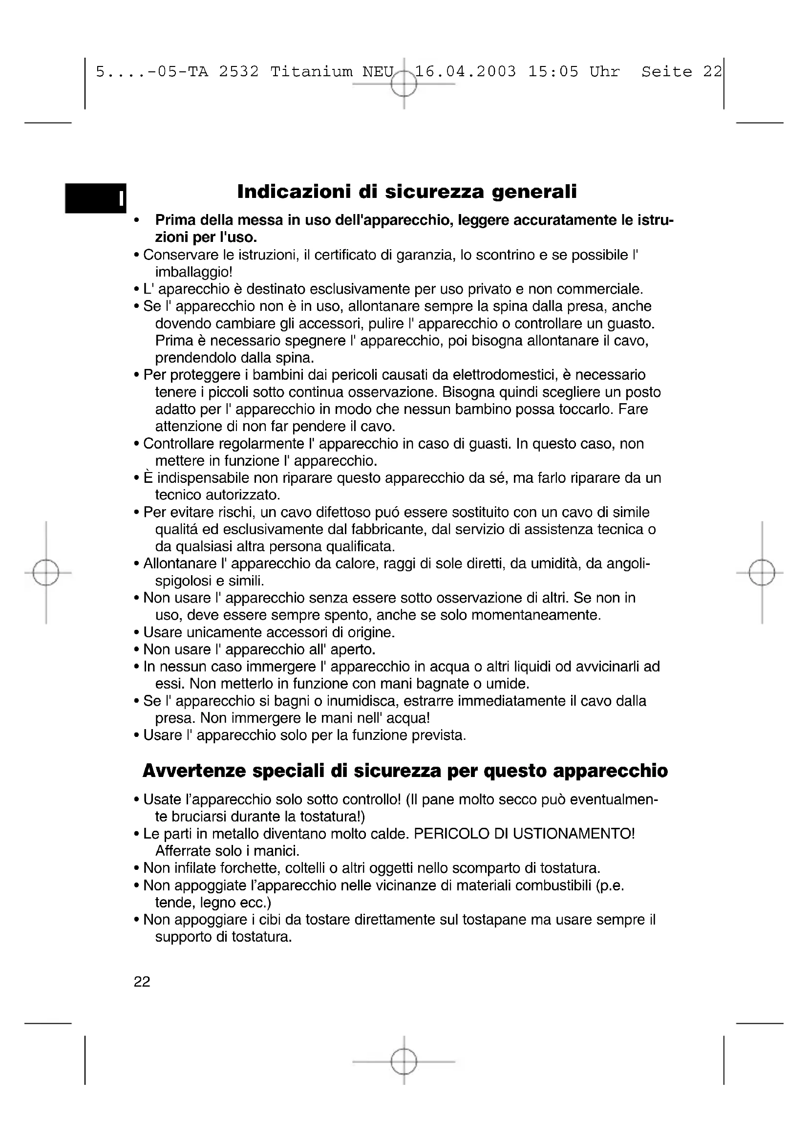 5....-05-TA 2532 Titanium NEU 16.04.2003 15:05 Uhr Seite 23Questo apparecchio corrisponde alle norme CE per i disturbi radio e la sicurezza contro le correnti a basso voltaggio ed è stato costruito in base alle più recenti norme tecniche di sicurezza. Con riserva di apportare modifiche tecniche. Garanzia A partire dalla data di acquisto, questo prodotto è garantito dal produttore per un periodo di 24 mesi (scontrino). Durante la durata della garanzia, il produttore eliminerà gratuitamente difetti dell'- apparecchio dovuti a imperfezioni di produzione o di materiale, eventualmente cam- biando l' unità oppure procedendo con le dovute riparazioni. La garanzia è valida solo con lo scontrino. Senza l' esibizione dello scontrino non è possibile fare svolgere le riparazioni gratuitamente. In caso di riparazioni con garanzia, è necessario ritornare al produttore l' appa- recchio intero, nell'imballaggio originale, accompagnato dallo scontrino. In caso di rottura di vetro e difetti agli accessori, i pezzi necessari verranno spediti in cambio gratuitamente. In questo caso è necessario di non spedire l' intero appa- recchio, ma ordinare solo l' accessorio difettoso! Pulizia, manutenzione e scambio non fanno parte della garanzia e sono perciò sono soggetti a spese. La garanzia perde la sua validità se l'apparecchio è sottomesso all' intervento di terzi. Dopo la garanzia Quando la garanzia è scaduta, le riparazioni devono essere effettuate da un nego- zio od un servizio specializzato, contro pagamento.