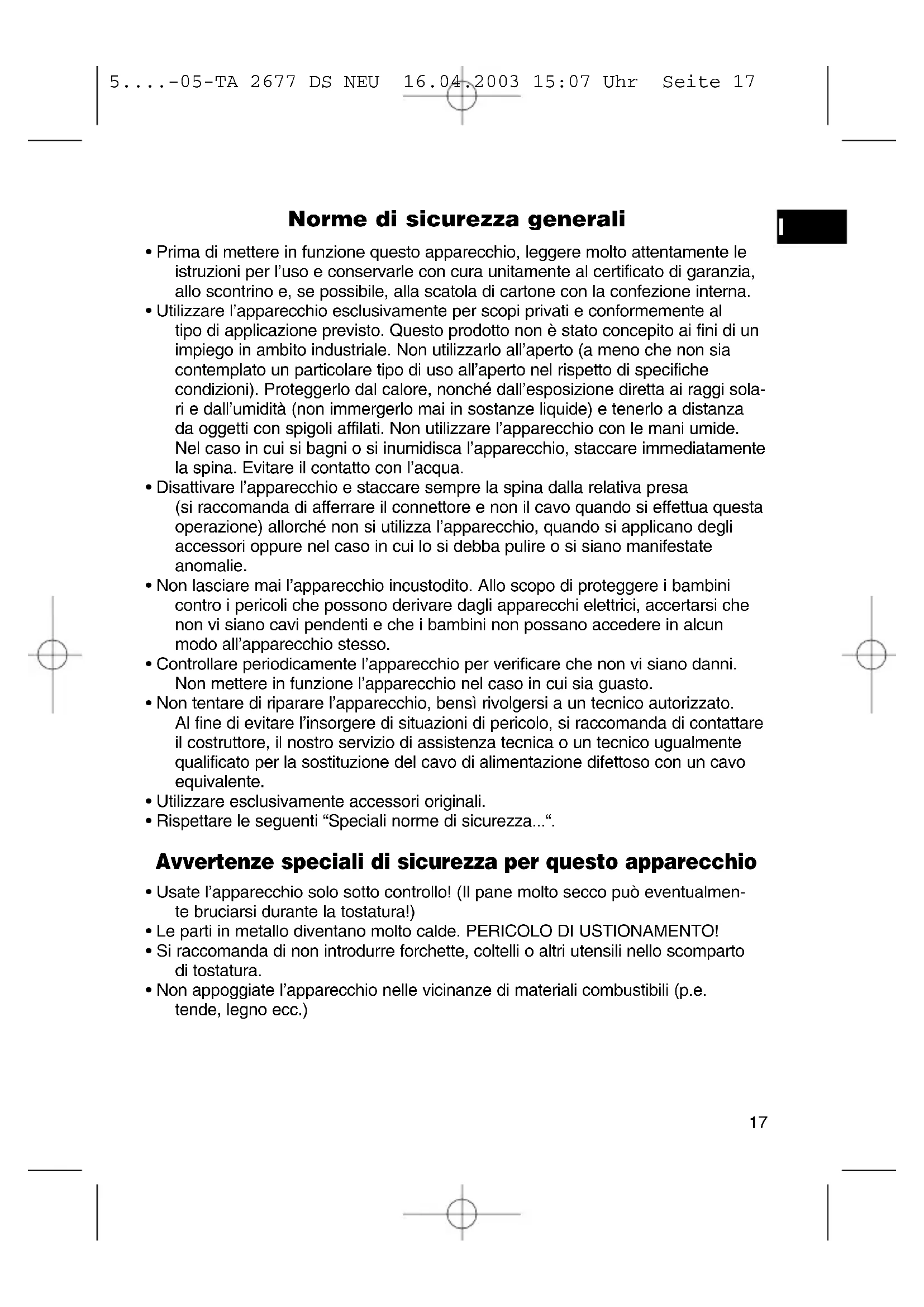 5....-05-TA 2677 DS NEU 16.04.2003 15:07 Uhr Seite 17Prima del primo uso Per togliere lo strato di protezione dalla spirale, sarebbe meglio attivare l’ appa- recchio ca. tre volte senza contenuto. Sciegliere il livello di doratura desiderato. Facendo questo è possibile che si formi un leggero fumo e odore. Arieggiare sufficientemente. Uso