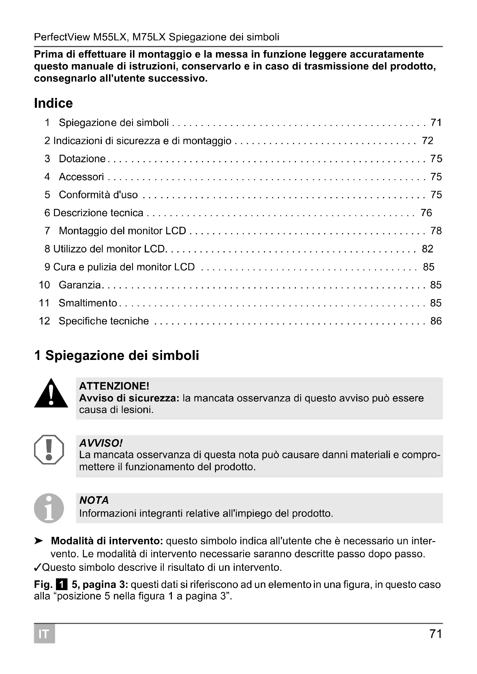 ➤ Modalità di intervento: questo simbolo indica all'utente che è necessario un inter- vento. Le modalità di intervento necessarie saranno descritte passo dopo passo. ✓ Questo simbolo descrive il risultato di un intervento. Fig. 1 5, pagina 3: questi dati si riferiscono ad un elemento in una figura, in questo caso alla “posizione 5 nella figura 1 a pagina 3”. ATTENZIONE! Avviso di sicurezza: la mancata osservanza di questo avviso può essere causa di lesioni. AVVISO! La mancata osservanza di questa nota può causare danni materiali e compro- mettere il funzionamento del prodotto. NOTA Informazioni integranti relative all'impiego del prodotto.Indicazioni di sicurezza e di montaggio PerfectView M55LX, M75LX