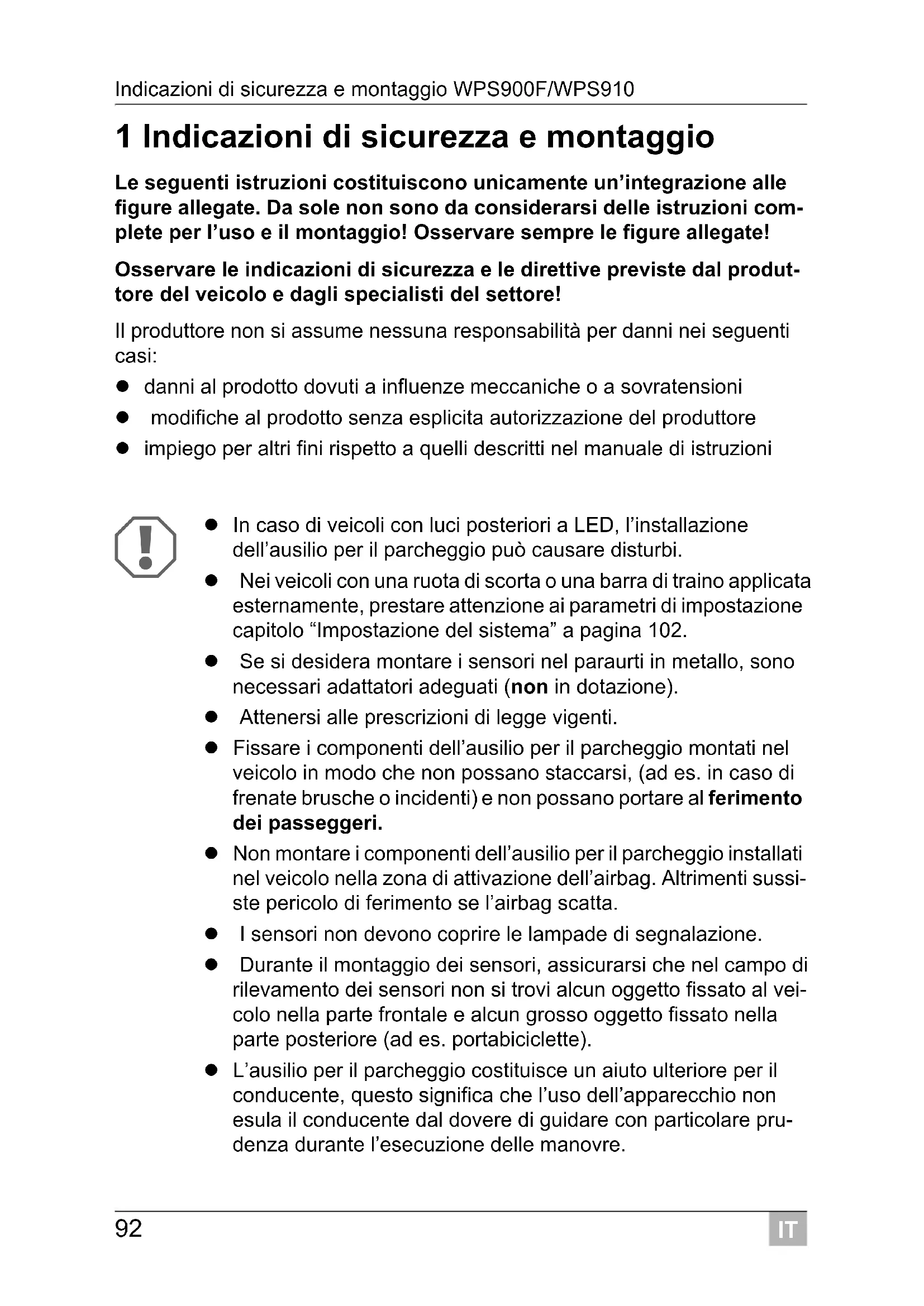 In caso di veicoli con luci posteriori a LED, l’installazione dell’ausilio per il parcheggio può causare disturbi. Nei veicoli con una ruota di scorta o una barra di traino applicata esternamente, prestare attenzione ai parametri di impostazione capitolo “Impostazione del sistema” a pagina 102. Se si desidera montare i sensori nel paraurti in metallo, sono necessari adattatori adeguati (non in dotazione). Attenersi alle prescrizioni di legge vigenti. Fissare i componenti dell’ausilio per il parcheggio montati nel veicolo in modo che non possano staccarsi, (ad es. in caso di frenate brusche o incidenti) e non possano portare al ferimento dei passeggeri. Non montare i componenti dell’ausilio per il parcheggio installati nel veicolo nella zona di attivazione dell’airbag. Altrimenti sussi- ste pericolo di ferimento se l’airbag scatta. I sensori non devono coprire le lampade di segnalazione. Durante il montaggio dei sensori, assicurarsi che nel campo di rilevamento dei sensori non si trovi alcun oggetto fissato al vei- colo nella parte frontale e alcun grosso oggetto fissato nella parte posteriore (ad es. portabiciclette). L’ausilio per il parcheggio costituisce un aiuto ulteriore per il conducente, questo significa che l’uso dell’apparecchio non esula il conducente dal dovere di guidare con particolare pru- denza durante l’esecuzione delle manovre.IT WPS900F/WPS910 Volume di consegna