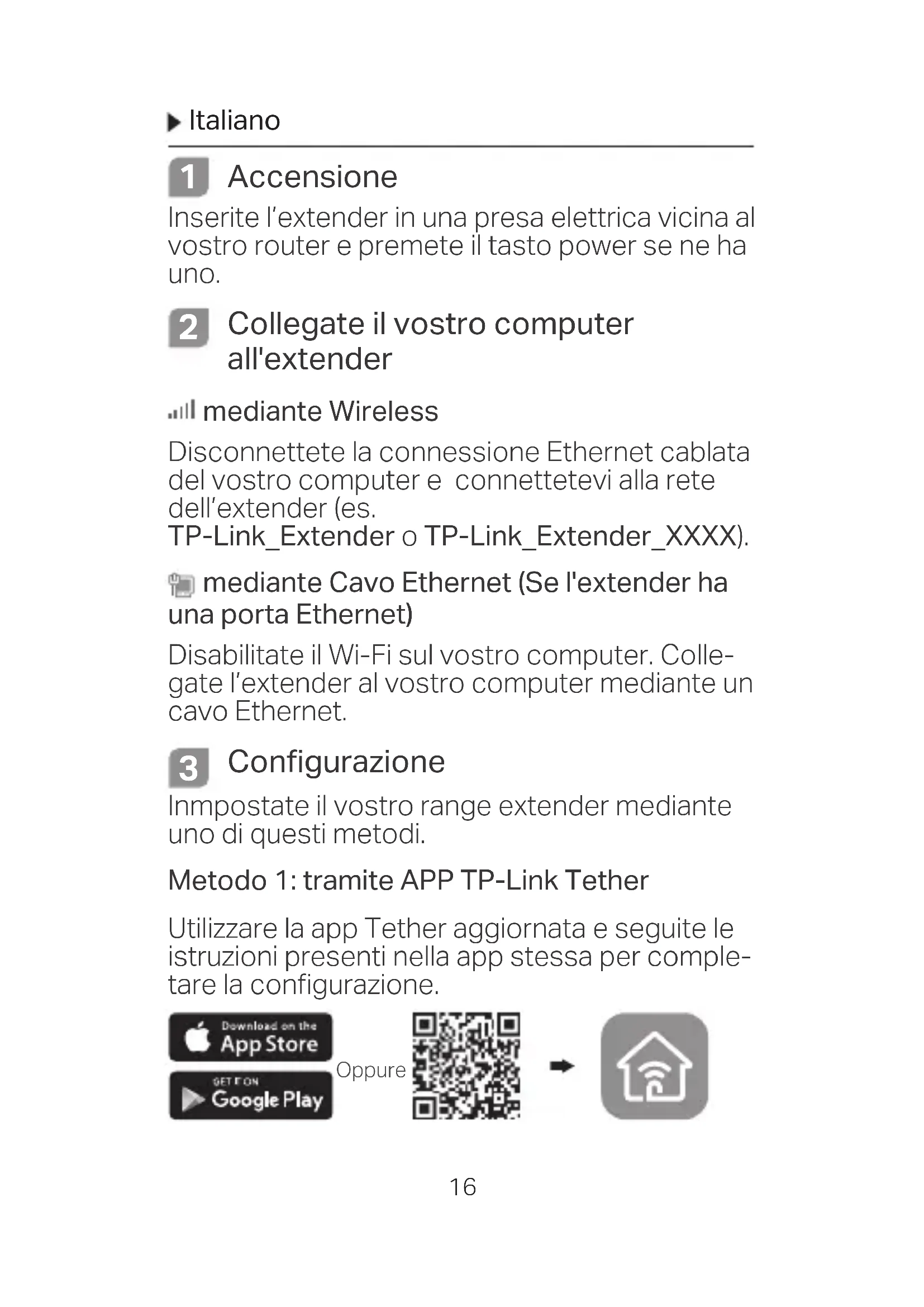 Configurazione Inmpostate il vostro range extender mediante uno di questi metodi. Metodo 1: tramite APP TP-Link Tether Utilizzare la app Tether aggiornata e seguite le istruzioni presenti nella app stessa per comple- tare la configurazione. OppureItaliano