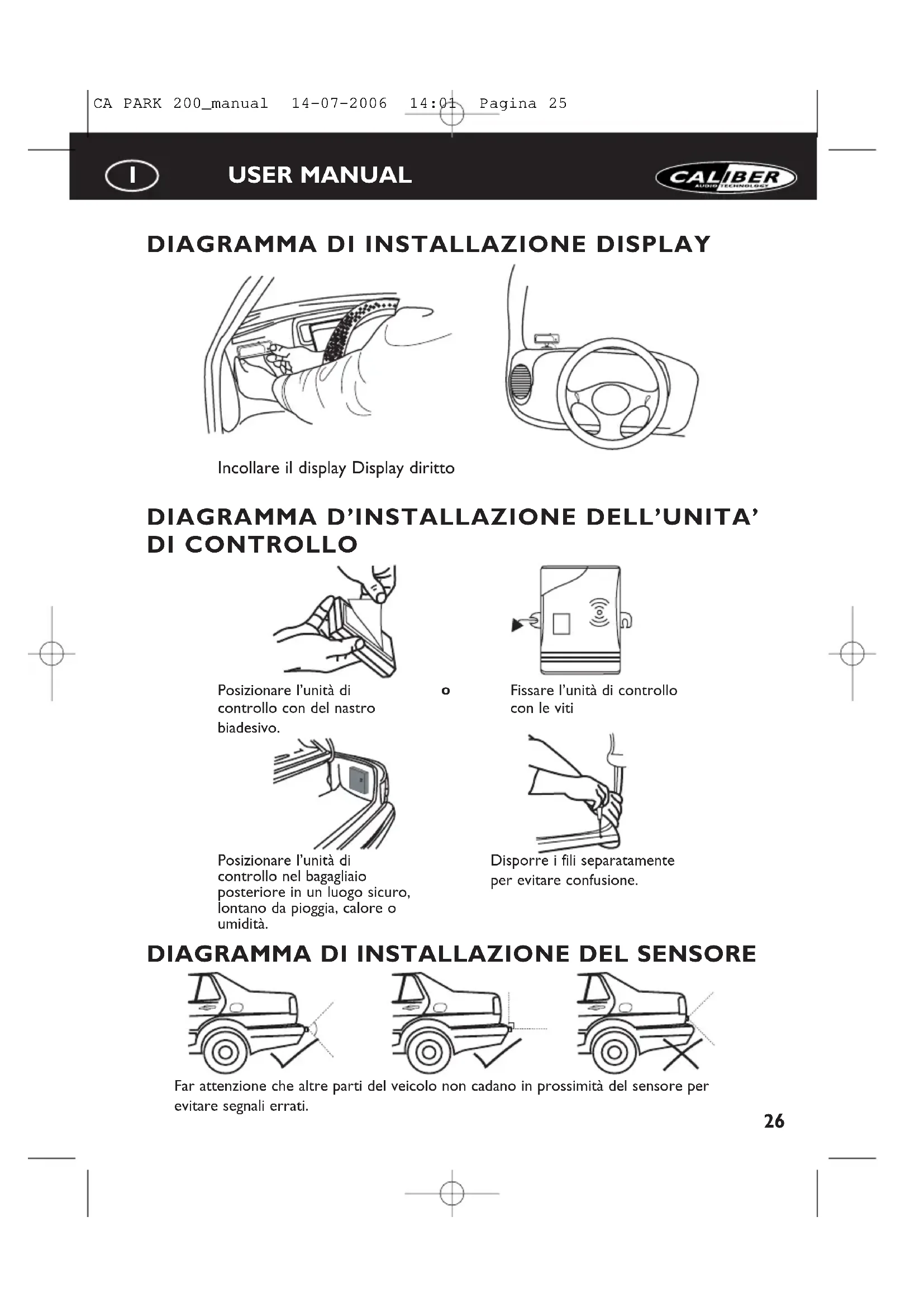Display Scatola di controllo Positivo + Luce di retromarcia Negativo - Sensore A Sensore B Sensore C Sensore D CA PARK 200_manual 14-07-2006 14:01 Pagina 2426 USER MANUAL