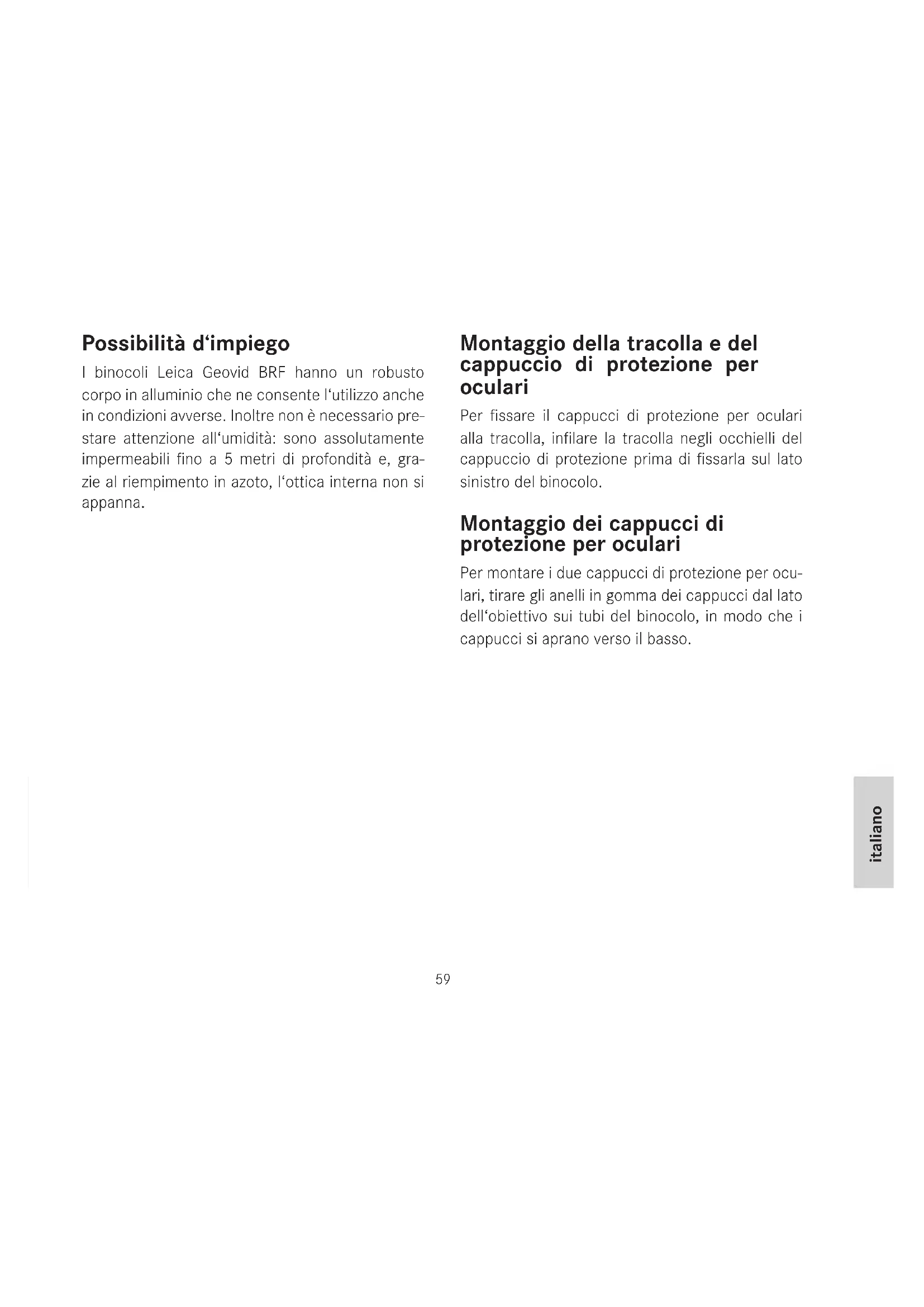 - Servizio assistenza clienti Leica Avvertenza: Come per ogni binocolo, anche con Leica Geovid BRF evitare l‘osservazione diretta delle sorgenti luminose per evitare lesioni agli occhi.59 italiano Possibilità d‘impiego I binocoli Leica Geovid BRF hanno un robusto corpo in alluminio che ne consente l‘utilizzo anche in condizioni avverse. Inoltre non è necessario pre- stare attenzione all‘umidità: sono assolutamente impermeabili fino a 5 metri di profondità e, gra- zie al riempimento in azoto, l‘ottica interna non si appanna. Montaggio della tracolla e del cappuccio di protezione per oculari Per fissare il cappucci di protezione per oculari alla tracolla, infilare la tracolla negli occhielli del cappuccio di protezione prima di fissarla sul lato sinistro del binocolo. Montaggio dei cappucci di protezione per oculari Per montare i due cappucci di protezione per ocu- lari, tirare gli anelli in gomma dei cappucci dal lato dell‘obiettivo sui tubi del binocolo, in modo che i cappucci si aprano verso il basso.60 Inserimento e sostituzione della bat- teria Per l‘alimentazione dei binocoli Leica Geovid BRF viene utilizzata una batteria al litio da 3 Volt (ad es. Duracell DL CR 2, Ucar CR 2, Varta CR2, o altri tipi CR 2). p. 69