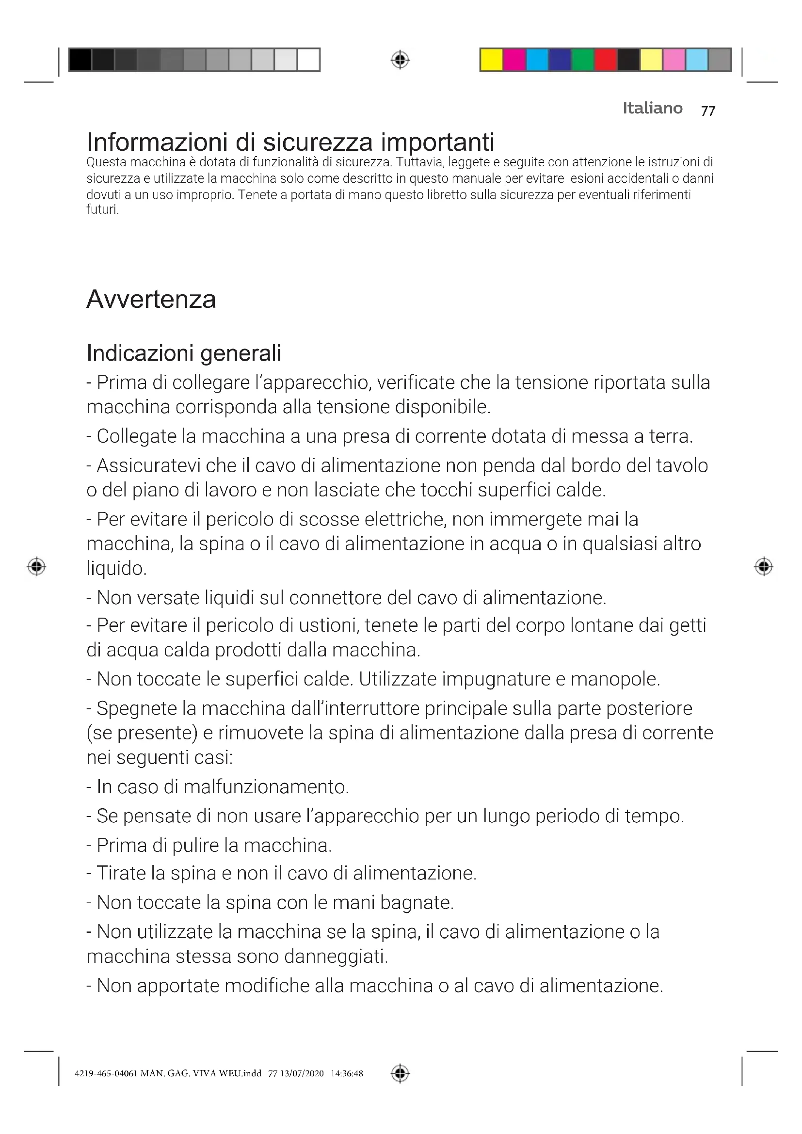 - La macchina è esposta continuamente a umidità, caffè e calcare. Pertanto è molto importante pulire regolarmente la macchina ed eseguire la manutenzione come descritto nel manuale dell’utente e mostrato sul sito WEB. Se non si eseguono queste procedure di pulizia e manutenzione, la macchina potrebbe anche smettere di funzionare. In questo caso un’eventuale riparazione non è coperta da garanzia. - Non lavate il portaltro pressurizzato in lavastoviglie e non utilizzate detersivi per piatti o detergenti, poiché potreste provocare il malfunzionamento del portaltro pressurizzato e il sapore del caffè potrebbe risentirne. - Non asciugate il gruppo infusore con panni per evitare l’accumulo di bre al suo interno. - Non ingerite mai la soluzione erogata durante il processo di rimozione del calcare. - Non disinseirire (togliere) mai il portaltro in pressione durante l’erogazione del caffè. Durante la fase di riscaldamento del gruppo erogazione caffè possono uscire gocce d’acqua calda. - La macchina non deve essere posizionata in un armadietto quando in uso. Macchine con il pannarello classico Avvertenza - Per evitare il pericolo di ustioni, prestate attenzione: l’erogazione potrebbe essere preceduta da piccoli getti di acqua calda. - Non toccate mai il pannarello classico a mani nude perché potrebbe diventare bollente. Utilizzate solo l’impugnatura protettiva appropriata. 4219-465-04061 MAN. GAG. VIVA WEU.indd 80 13/07/2020 14:36:4881 Italiano Attenzione - Dopo aver preparato la schiuma di latte, pulite velocemente il pannarello classico erogando una piccola quantità di acqua calda in un contenitore. Rimuovete quindi la parte esterna del pannarello classico e lavatela con acqua tiepida. Macchine con il pannarello automatico Avvertenza - Per evitare il pericolo di ustioni, prestate attenzione: l’erogazione potrebbe essere preceduta da piccoli getti di acqua calda. Non toccate mai l’erogatore di acqua calda/vapore a mani nude perché potrebbe diventare bollente. Utilizzate solo l’impugnatura protettiva appropriata. - Non ingerite mai la soluzione erogata durante la procedura di pulizia mensile del pannarello automatico. Attenzione - Per motivi di igiene, assicuratevi che la supercie esterna dell’erogatore di acqua calda/vapore sia pulita. - Dopo aver preparato la schiuma di latte, pulite velocemente il pannarello automatico erogando una piccola quantità di acqua calda. Seguite le istruzioni di pulizia riportate nel manuale per l’utente. - Prestate attenzione perché l’erogatore di acqua calda/vapore potrebbe essere bollente se la macchina è stata usata di recente. - Non spingete il supporto in gomma troppo avanti sull’erogatore di acqua calda/vapore quando lo inserite. In questo caso, il pannarello automatico non funzionerà correttamente poiché potrebbe non aspirare il latte. 4219-465-04061 MAN. GAG. VIVA WEU.indd 81 13/07/2020 14:36:48Italiano