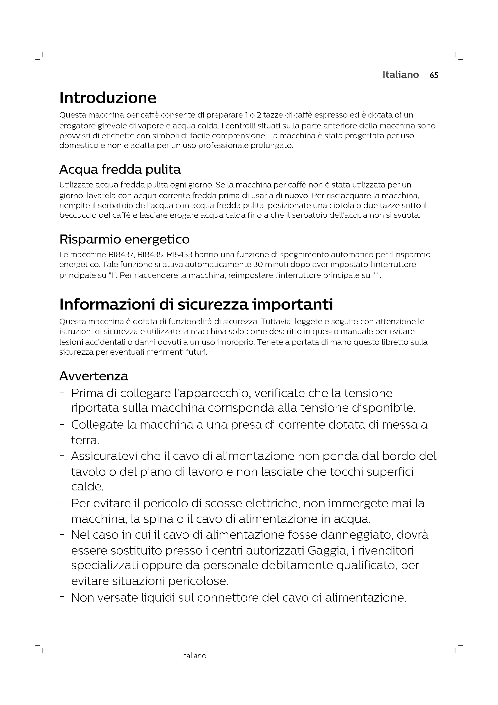 FrançaisItaliano Introduzione Questa macchina per caffè consente di preparare 1 o 2 tazze di caffè espresso ed è dotata di unerogatore girevole di vapore e acqua calda. I controlli situati sulla parte anteriore della macchina sonoprovvisti di etichette con simboli di facile comprensione. La macchina è stata progettata per usodomestico e non è adatta per un uso professionale prolungato. Acqua fredda pulita Utilizzate acqua fredda pulita ogni giorno. Se la macchina per caffè non è stata utilizzata per ungiorno, lavatela con acqua corrente fredda prima di usarla di nuovo. Per risciacquare la macchina,riempite il serbatoio dell'acqua con acqua fredda pulita, posizionate una ciotola o due tazze sotto ilbeccuccio del caffè e lasciare erogare acqua calda fino a che il serbatoio dell'acqua non si svuota. Risparmio energetico Le macchine RI8437, RI8435, RI8433 hanno una funzione di spegnimento automatico per il risparmioenergetico. Tale funzione si attiva automaticamente 30 minuti dopo aver impostato l'interruttoreprincipale su "I". Per riaccendere la macchina, reimpostare l'interruttore principale su "I". Informazioni di sicurezza importanti Questa macchina è dotata di funzionalità di sicurezza. Tuttavia, leggete e seguite con attenzione leistruzioni di sicurezza e utilizzate la macchina solo come descritto in questo manuale per evitarelesioni accidentali o danni dovuti a un uso improprio. Tenete a portata di mano questo libretto sullasicurezza per eventuali riferimenti futuri. Avvertenza