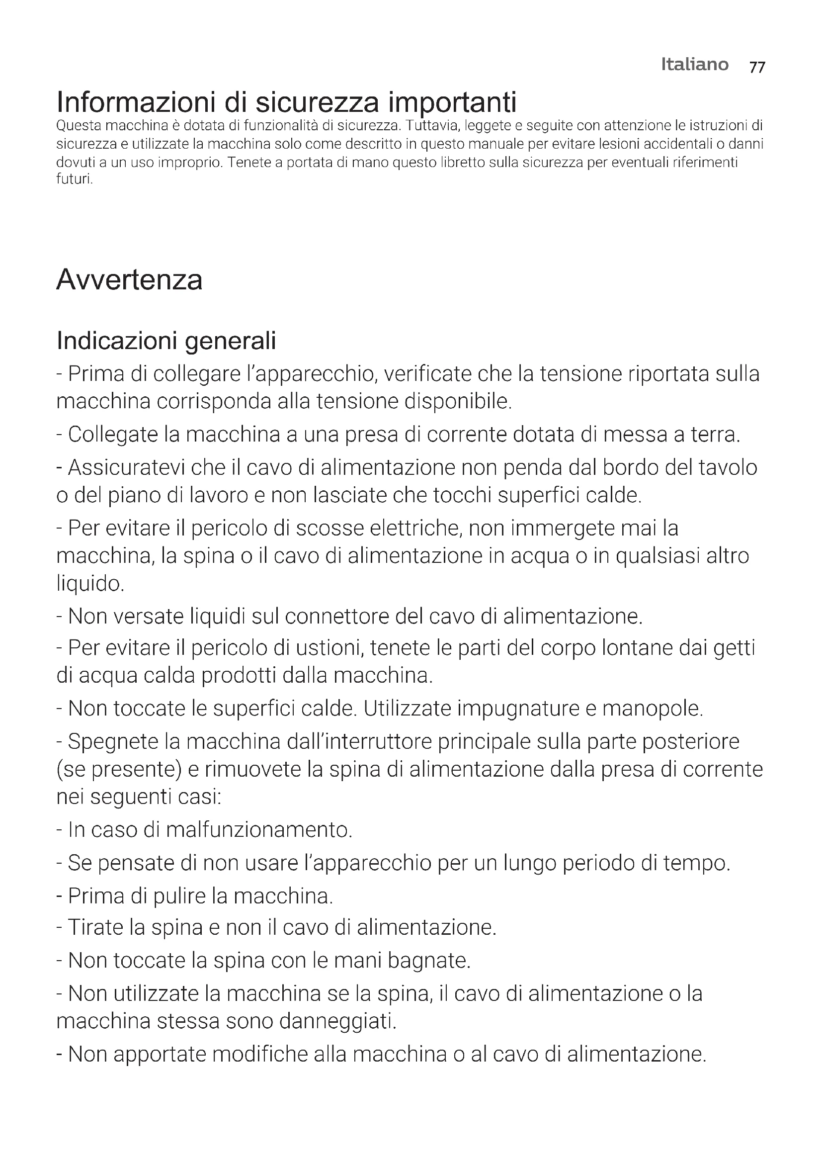 - La macchina è esposta continuamente a umidità, caffè e calcare. Pertanto è molto importante pulire regolarmente la macchina ed eseguire la manutenzione come descritto nel manuale dell’utente e mostrato sul sito WEB. Se non si eseguono queste procedure di pulizia e manutenzione, la macchina potrebbe anche smettere di funzionare. In questo caso un’eventuale riparazione non è coperta da garanzia. - Non lavate il portaltro pressurizzato in lavastoviglie e non utilizzate detersivi per piatti o detergenti, poiché potreste provocare il malfunzionamento del portaltro pressurizzato e il sapore del caffè potrebbe risentirne. - Non asciugate il gruppo infusore con panni per evitare l’accumulo di bre al suo interno. - Non ingerite mai la soluzione erogata durante il processo di rimozione del calcare. - Non disinseirire (togliere) mai il portaltro in pressione durante l’erogazione del caffè. Durante la fase di riscaldamento del gruppo erogazione caffè possono uscire gocce d’acqua calda. - La macchina non deve essere posizionata in un armadietto quando in uso. Macchine con il pannarello classico Avvertenza - Per evitare il pericolo di ustioni, prestate attenzione: l’erogazione potrebbe essere preceduta da piccoli getti di acqua calda. - Non toccate mai il pannarello classico a mani nude perché potrebbe diventare bollente. Utilizzate solo l’impugnatura protettiva appropriata.81 Italiano Attenzione - Dopo aver preparato la schiuma di latte, pulite velocemente il pannarello classico erogando una piccola quantità di acqua calda in un contenitore. Rimuovete quindi la parte esterna del pannarello classico e lavatela con acqua tiepida. Macchine con il pannarello automatico Avvertenza - Per evitare il pericolo di ustioni, prestate attenzione: l’erogazione potrebbe essere preceduta da piccoli getti di acqua calda. Non toccate mai l’erogatore di acqua calda/vapore a mani nude perché potrebbe diventare bollente. Utilizzate solo l’impugnatura protettiva appropriata. - Non ingerite mai la soluzione erogata durante la procedura di pulizia mensile del pannarello automatico. Attenzione - Per motivi di igiene, assicuratevi che la supercie esterna dell’erogatore di acqua calda/vapore sia pulita. - Dopo aver preparato la schiuma di latte, pulite velocemente il pannarello automatico erogando una piccola quantità di acqua calda. Seguite le istruzioni di pulizia riportate nel manuale per l’utente. - Prestate attenzione perché l’erogatore di acqua calda/vapore potrebbe essere bollente se la macchina è stata usata di recente. - Non spingete il supporto in gomma troppo avanti sull’erogatore di acqua calda/vapore quando lo inserite. In questo caso, il pannarello automatico non funzionerà correttamente poiché potrebbe non aspirare il latte.Italiano
