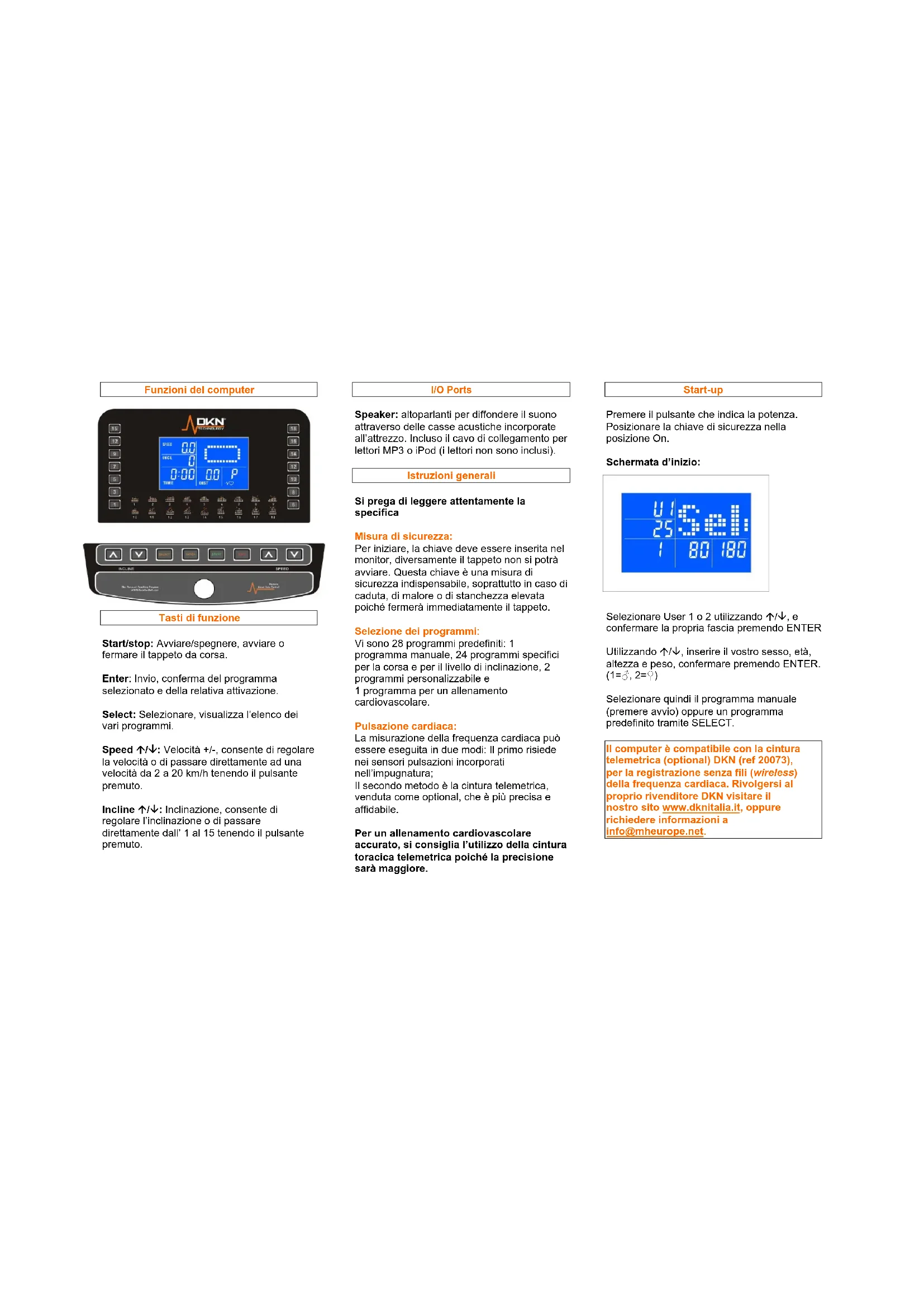 Il computer è compatibile con la cintura telemetrica (optional) DKN (ref 20073), per la registrazione senza fili (wireless) della frequenza cardiaca. Rivolgersi al proprio rivenditore DKN visitare il nostro sito www.dknitalia.it, oppure richiedere informazioni a info@mheurope.net.