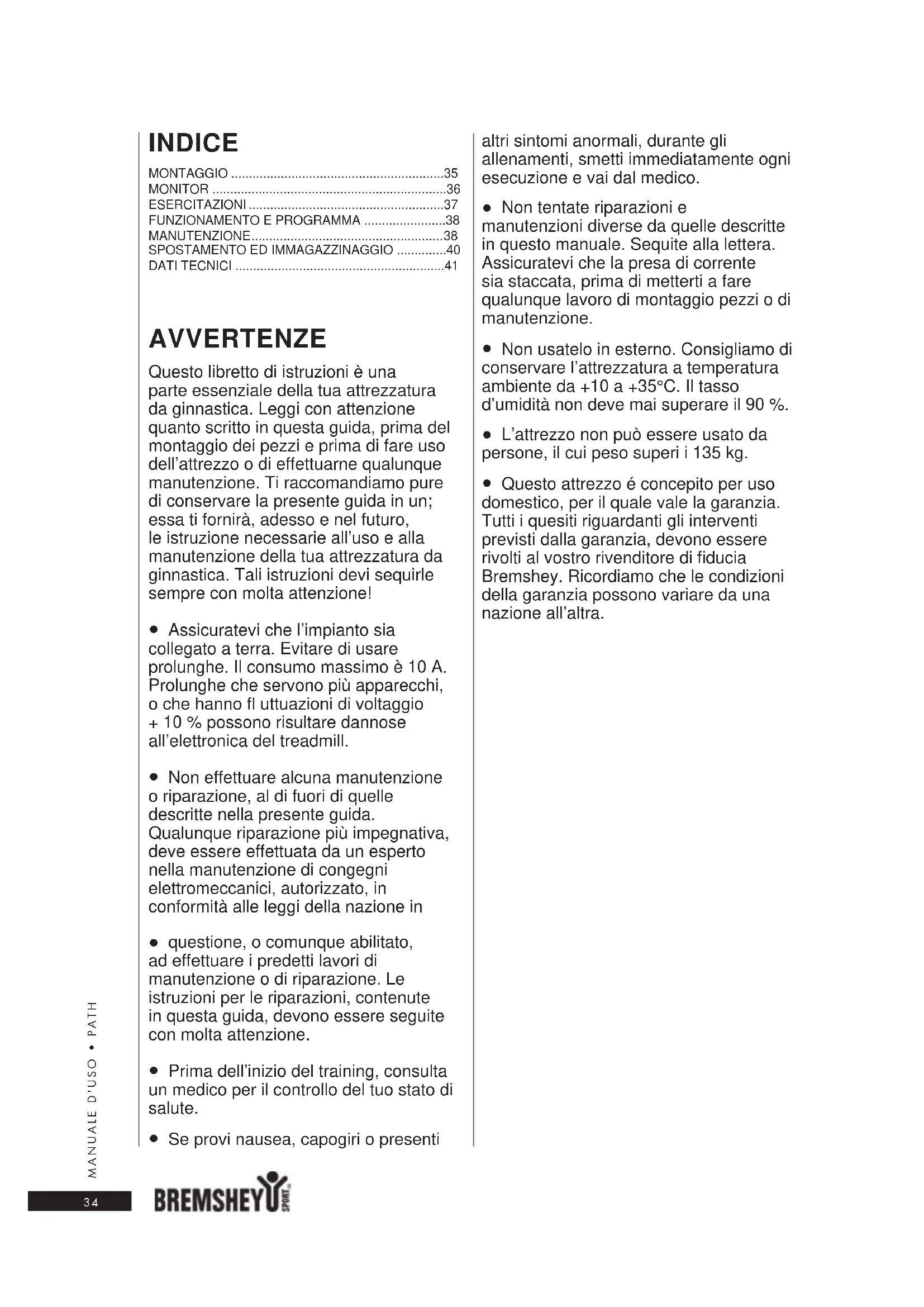 - Questo attrezzo è concepito per uso domestico, per il quale vale la garanzia. Tutti i quesiti riguardanti gli interventi previsti dalla garanzia, devono essere rivolti al vosto rivenditore di fiducia Bremshey. Ricordiamo che le condizioni della garanzia possono variate da una nazione all'altra.