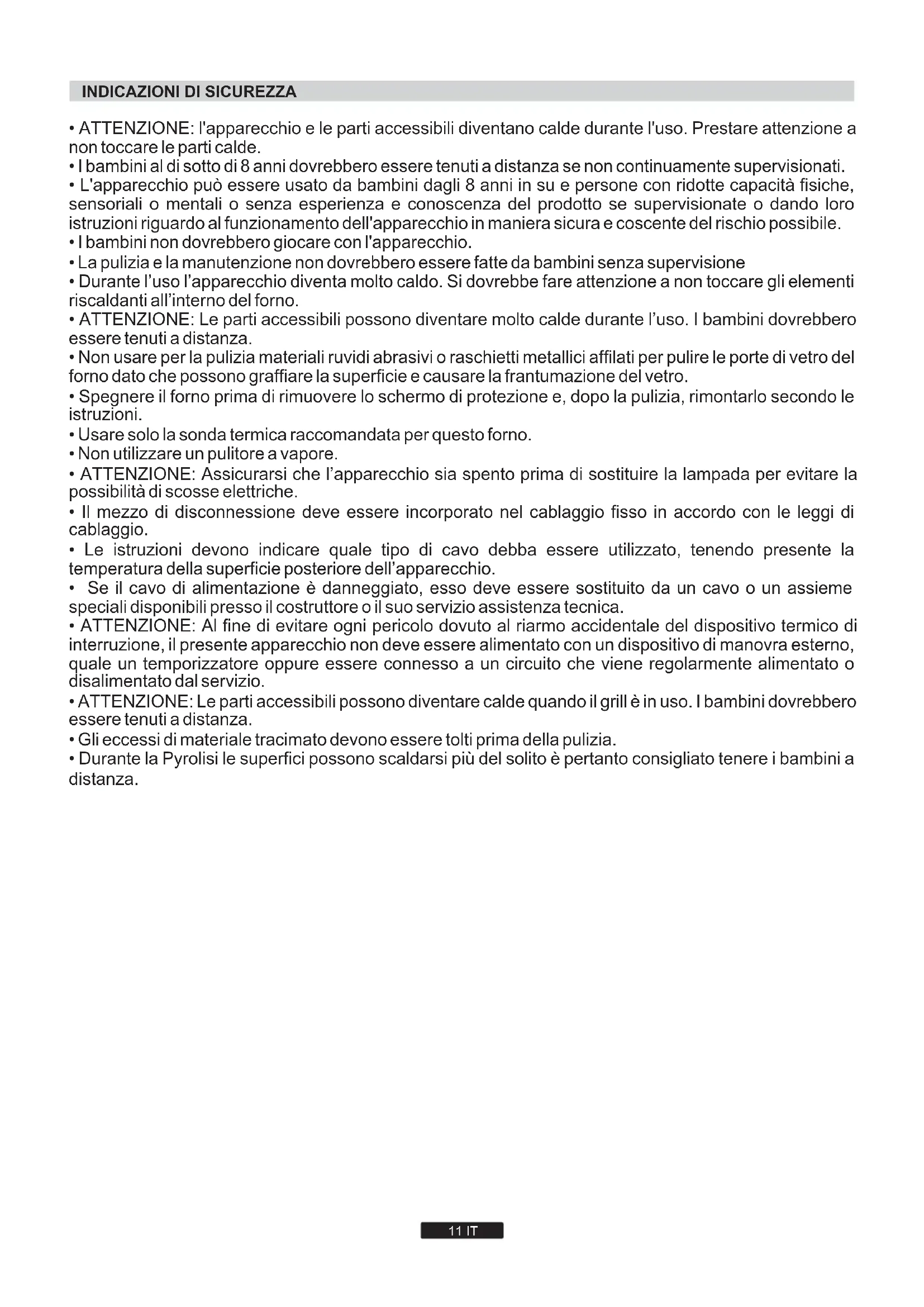 - Il produttore declina ogni responsabilità per eventuali danni dovuti a un uso improprio, errato o irragionevole del forno. Durante l'uso di elettrodomestici elettrici, è indispensabile attenersi ad alcune semplici regole di base: -Non tirare il cavo di alimentazione per staccare la spina dalla presa a muro -Non toccare il forno con mani o piedi bagnati o umidi -Non utilizzare i forno con i piedi scalzi - È generalmente sconsigliabile utilizzare adattatori, basette di alimentazione o prolunghe. - Se il forno si guasta o uno degli interruttori risulta difettoso, spegnerlo immediatamente e non utilizzarlo.