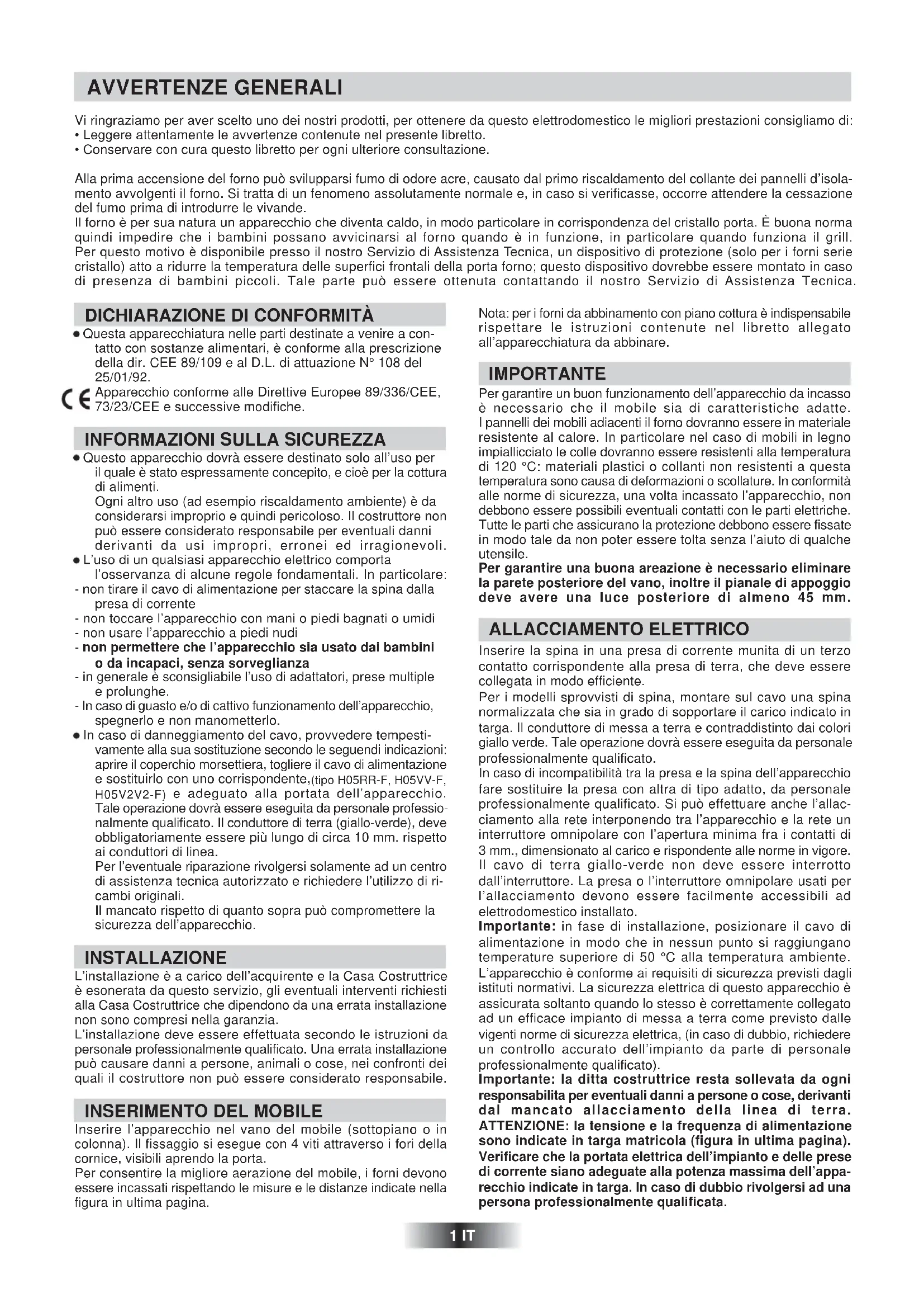 Inserire l’apparecchio nel vano del mobile (sottopiano o in colonna). Il fissaggio si esegue con 4 viti attraverso i fori della cornice, visibili aprendo la porta. Per consentire la migliore aerazione del mobile, i forni devono essere incassati rispettando le misure e le distanze indicate nella figura in ultima pagina. Nota: per i forni da abbinamento con piano cottura è indispensabile rispettare le istruzioni contenute nel libretto allegato all’apparecchiatura da abbinare. IMPORTANTE Per garantire un buon funzionamento dell’apparecchio da incasso è necessario che il mobile sia di caratteristiche adatte. I pannelli dei mobili adiacenti il forno dovranno essere in materiale resistente al calore. In particolare nel caso di mobili in legno impiallicciato le colle dovranno essere resistenti alla temperatura di 120 °C: materiali plastici o collanti non resistenti a questa temperatura sono causa di deformazioni o scollature. In conformità alle norme di sicurezza, una volta incassato l’apparecchio, non debbono essere possibili eventuali contatti con le parti elettriche. Tutte le parti che assicurano la protezione debbono essere fissate in modo tale da non poter essere tolta senza l’aiuto di qualche utensile. Per garantire una buona areazione è necessario eliminare la parete posteriore del vano, inoltre il pianale di appoggio deve avere una luce posteriore di almeno 45 mm. ALLACCIAMENTO ELETTRICO Inserire la spina in una presa di corrente munita di un terzo contatto corrispondente alla presa di terra, che deve essere collegata in modo efficiente. Per i modelli sprovvisti di spina, montare sul cavo una spina normalizzata che sia in grado di sopportare il carico indicato in targa. Il conduttore di messa a terra e contraddistinto dai colori giallo verde. Tale operazione dovrà essere eseguita da personale professionalmente qualificato. In caso di incompatibilità tra la presa e la spina dell’apparecchio fare sostituire la presa con altra di tipo adatto, da personale professionalmente qualificato. Si può effettuare anche l’allac- ciamento alla rete interponendo tra l’apparecchio e la rete un interruttore omnipolare con l’apertura minima fra i contatti di 3 mm., dimensionato al carico e rispondente alle norme in vigore. Il cavo di terra giallo-verde non deve essere interrotto dall’interruttore. La presa o l’interruttore omnipolare usati per l’allacciamento devono essere facilmente accessibili ad elettrodomestico installato. Importante: in fase di installazione, posizionare il cavo di alimentazione in modo che in nessun punto si raggiungano temperature superiore di 50 °C alla temperatura ambiente. L’apparecchio è conforme ai requisiti di sicurezza previsti dagli istituti normativi. La sicurezza elettrica di questo apparecchio è assicurata soltanto quando lo stesso è correttamente collegato ad un efficace impianto di messa a terra come previsto dalle vigenti norme di sicurezza elettrica, (in caso di dubbio, richiedere un controllo accurato dell’impianto da parte di personale professionalmente qualificato). Importante: la ditta costruttrice resta sollevata da ogni responsabilita per eventuali danni a persone o cose, derivanti dal mancato allacciamento della linea di terra. ATTENZIONE: la tensione e la frequenza di alimentazione sono indicate in targa matricola (figura in ultima pagina). Verificare che la portata elettrica dell’impianto e delle prese di corrente siano adeguate alla potenza massima dell’appa- recchio indicate in targa. In caso di dubbio rivolgersi ad una persona professionalmente qualificata. 1 ITCONSIGLI UTILI