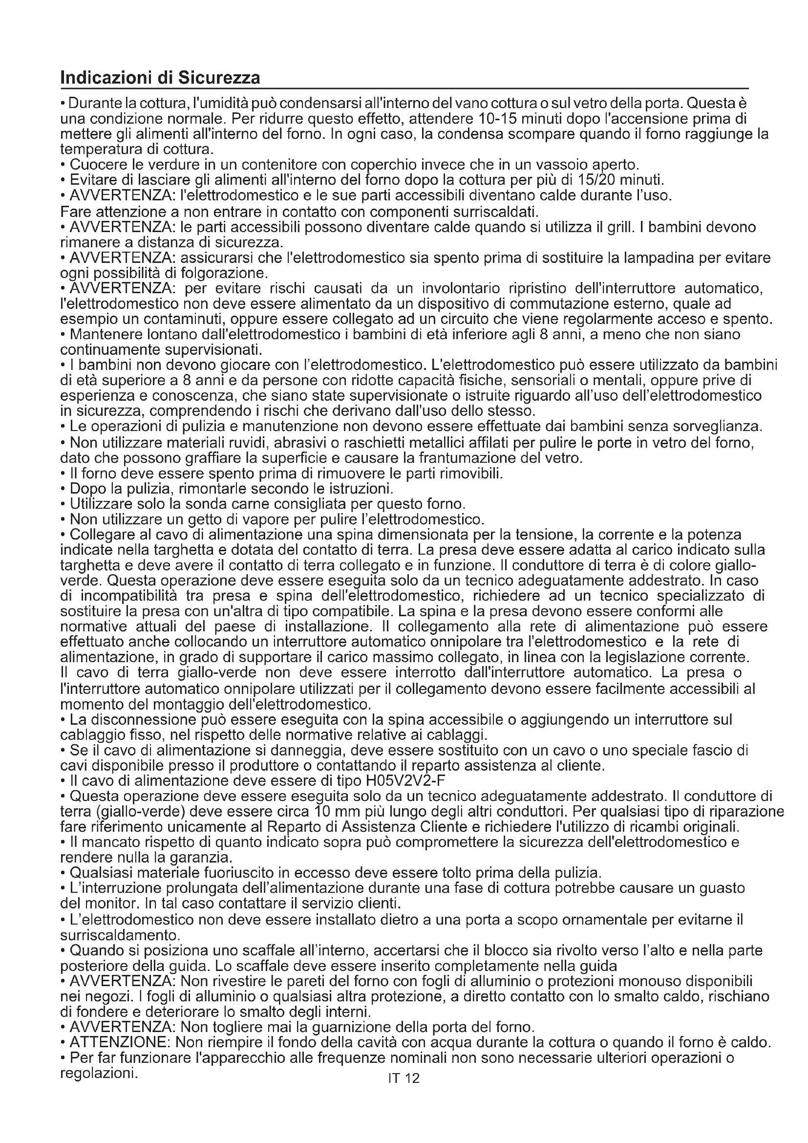 - ATTENZIONE: Non riempire il fondo della cavità con acqua durante la cottura o quando il forno è caldo. Indicazioni di Sicurezza IT 12Sommario Avvertenze Generali