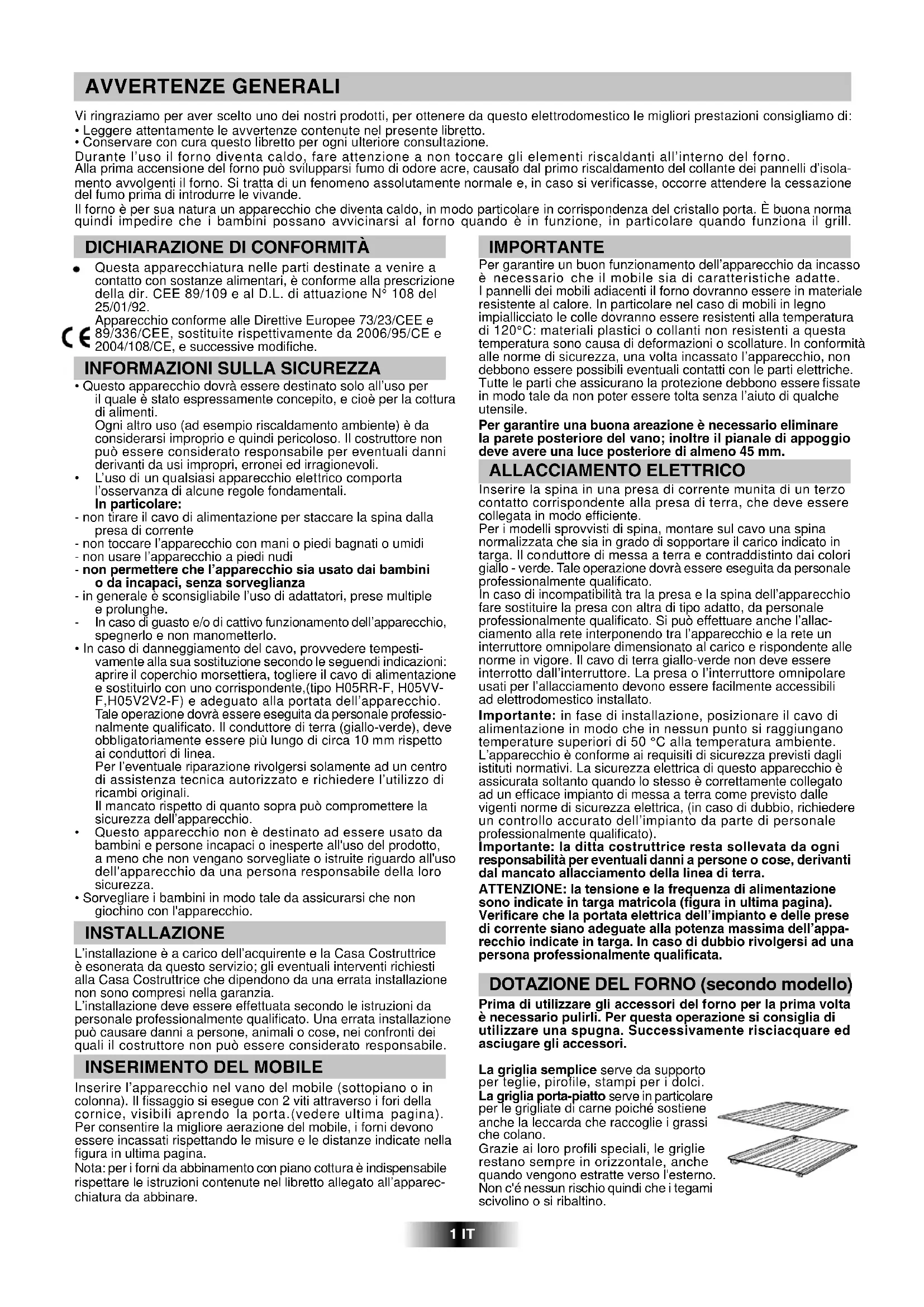 - Conservare con cura questo libretto per ogni ulteriore consultazione. Durante l’uso il forno diventa caldo, fare attenzione a non toccare gli elementi riscaldanti all’interno del forno. Alla prima accensione del forno può svilupparsi fumo di odore acre, causato dal primo riscaldamento del collante dei pannelli d’isola- mento avvolgenti il forno. Si tratta di un fenomeno assolutamente normale e, in caso si verificasse, occorre attendere la cessazione del fumo prima di introdurre le vivande. Il forno è per sua natura un apparecchio che diventa caldo, in modo particolare in corrispondenza del cristallo porta. È buona norma quindi impedire che i bambini possano avvicinarsi al forno quando è in funzione, in particolare quando funziona il grill. AVVERTENZE GENERALI 1 IT