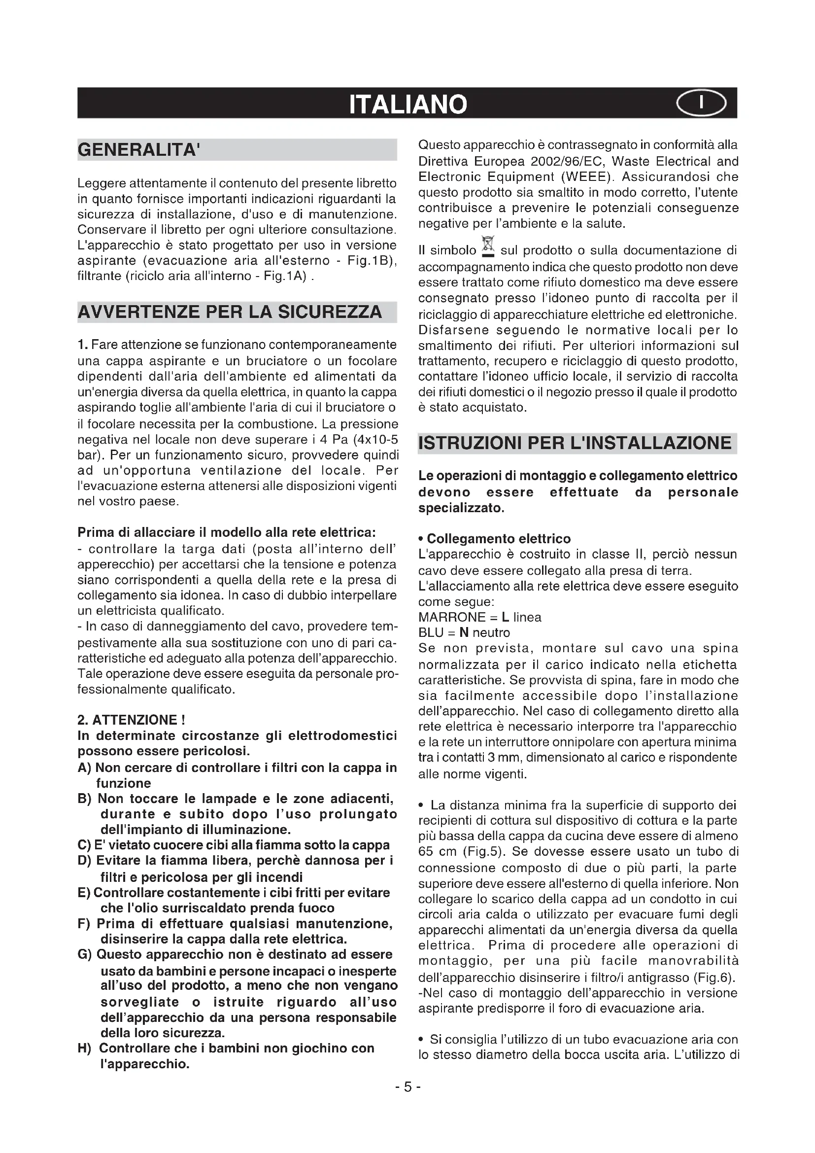 In determinate circostanze gli elettrodomestici possono essere pericolosi. A) Non cercare di controllare i filtri con la cappa in funzione B) Non toccare le lampade e le zone adiacenti, durante e subito dopo l’uso prolungato dell'impianto di illuminazione. C) E' vietato cuocere cibi alla fiamma sotto la cappa D) Evitare la fiamma libera, perchè dannosa per i filtri e pericolosa per gli incendi E) Controllare costantemente i cibi fritti per evitare che l'olio surriscaldato prenda fuoco F) Prima di effettuare qualsiasi manutenzione, disinserire la cappa dalla rete elettrica. G) Questo apparecchio non è destinato ad essere usato da bambini e persone incapaci o inesperte all’uso del prodotto, a meno che non vengano sorvegliate o istruite riguardo all’uso dell’apparecchio da una persona responsabile della loro sicurezza. H) Controllare che i bambini non giochino con l'apparecchio. Questo apparecchio è contrassegnato in conformità alla Direttiva Europea 2002/96/EC, Waste Electrical and Electronic Equipment (WEEE). Assicurandosi che questo prodotto sia smaltito in modo corretto, l’utente contribuisce a prevenire le potenziali conseguenze negative per l’ambiente e la salute. Il simbolo sul prodotto o sulla documentazione di accompagnamento indica che questo prodotto non deve essere trattato come rifiuto domestico ma deve essere consegnato presso l’idoneo punto di raccolta per il riciclaggio di apparecchiature elettriche ed elettroniche. Disfarsene seguendo le normative locali per lo smaltimento dei rifiuti. Per ulteriori informazioni sul trattamento, recupero e riciclaggio di questo prodotto, contattare l’idoneo ufficio locale, il servizio di raccolta dei rifiuti domestici o il negozio presso il quale il prodotto è stato acquistato.