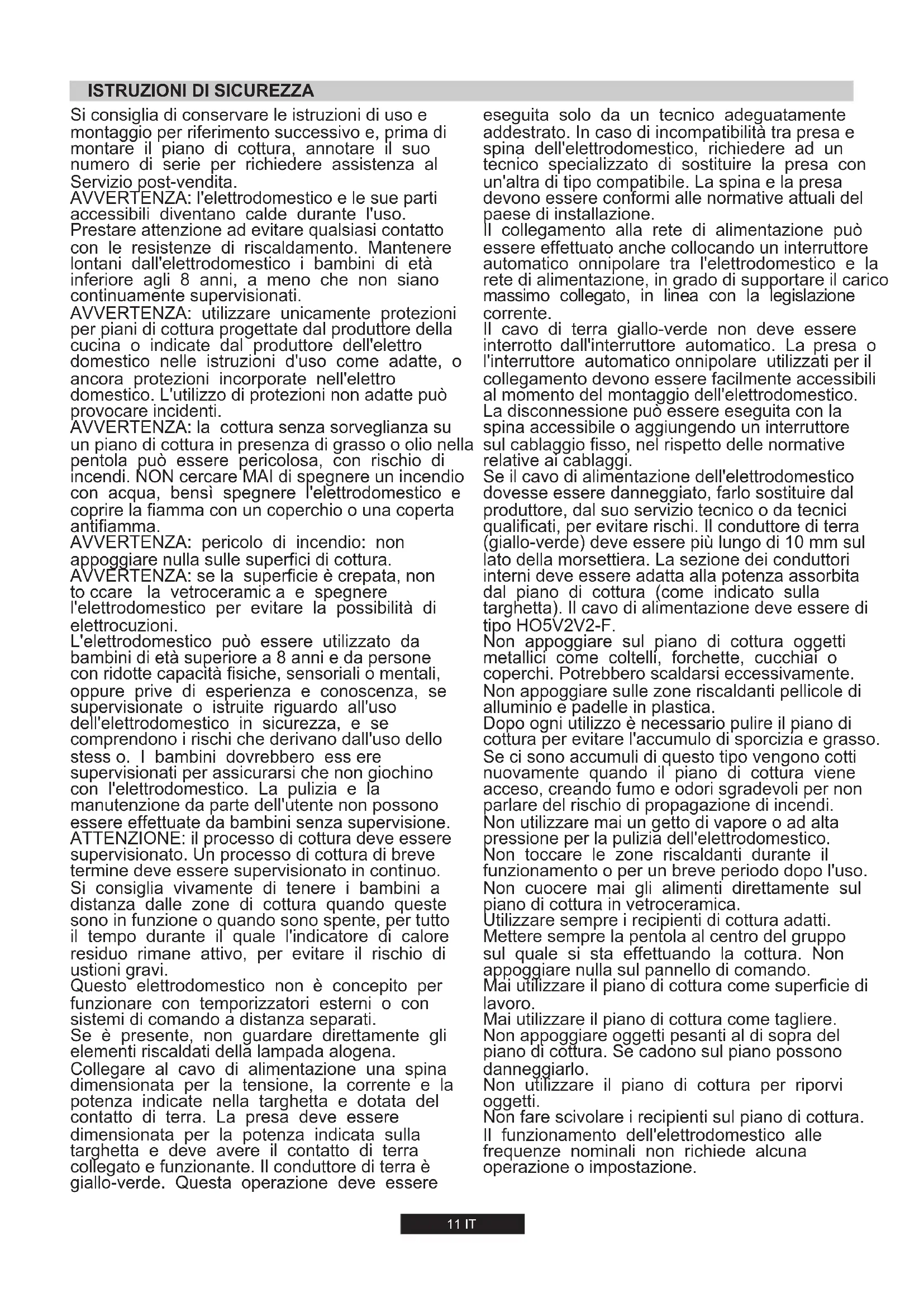 If error has occurred disconnected and connect again the cooktop to the power supply. If error persist, call after-sales service. If error appears suddenly in a normal operation, call after-sales service. Touch control software error. Wait until temperature goes down. Cook-top will automatically recovered when temperature reaches a normal value. Touch control zone is too hot and has turned off all the heaters. Wait until temperature goes down. If message persist when temperature reaches an environment value, call after-sales service. Touch control temperature sensor can be damaged. Wait until temperature goes down. If message persist when temperature reaches an environment value, call after-sales service. Touch control temperature sensor can be damaged. See if cook-top is mounted correctly. Be sure that keys touch correctly the glass surface. Excessive sensitivity on any key. This error is a keyboard auto-check. It disappears when autocheck return to secure value. If error persist, call after-sale service. Security keyboard error This error is a software auto-check. It disappears when auto-check return to secure value. If error persist, call after-sale service. Security software error This error is a software auto-check. It disappears when auto-check return to secure value. If error persist, call after-sale service. Security software error Any relay driver can have any problemn. Remove cook-top from the power supply, wait a minute and switch on again. If error persist, call after-sale service. Relays security error 10 GB11 IT AVVERTENZA: utilizzare unicamente protezioni per piani di cottura progettate dal produttore della cucina o indicate dal produttore dell'elettro domestico nelle istruzioni d'uso come adatte, o ancora protezioni incorporate nell'elettro domestico. L'utilizzo di protezioni non adatte può provocare incidenti. AVVERTENZA: l'elettrodomestico e le sue parti accessibili diventano calde durante l'uso. Prestare attenzione ad evitare qualsiasi contatto con le resistenze di riscaldamento. Mantenere lontani dall'elettrodomestico i bambini di età inferiore agli 8 anni, a meno che non siano continuamente supervisionati. Si consiglia di conservare le istruzioni di uso e montaggio per riferimento successivo e, prima di montare il piano di cottura, annotare il suo numero di serie per richiedere assistenza al Servizio post-vendita. AVVERTENZA: la cottura senza sorveglianza su un piano di cottura in presenza di grasso o olio nella pentola può essere pericolosa, con rischio di incendi. NON cercare MAI di spegnere un incendio con acqua, bensì spegnere l'elettrodomestico e coprire la fiamma con un coperchio o una coperta antifiamma. AVVERTENZA: pericolo di incendio: non appoggiare nulla sulle superfici di cottura. AVVERTENZA: se la superficie è crepata, non to ccare la vetroceramic a e spegnere l'elettrodomestico per evitare la possibilità di elettrocuzioni. L'elettrodomestico può essere utilizzato da bambini di età superiore a 8 anni e da persone con ridotte capacità fisiche, sensoriali o mentali, oppure prive di esperienza e conoscenza, se supervisionate o istruite riguardo all'uso dell'elettrodomestico in sicurezza, e se comprendono i rischi che derivano dall'uso dello stess o. I bambini dovrebbero ess ere supervisionati per assicurarsi che non giochino con l'elettrodomestico. La pulizia e la manutenzione da parte dell'utente non possono essere effettuate da bambini senza supervisione. ATTENZIONE: il processo di cottura deve essere supervisionato. Un processo di cottura di breve termine deve essere supervisionato in continuo. Si consiglia vivamente di tenere i bambini a distanza dalle zone di cottura quando queste sono in funzione o quando sono spente, per tutto il tempo durante il quale l'indicatore di calore residuo rimane attivo, per evitare il rischio di ustioni gravi. Se è presente, non guardare direttamente gli elementi riscaldati della lampada alogena. Collegare al cavo di alimentazione una spina dimensionata per la tensione, la corrente e la potenza indicate nella targhetta e dotata del contatto di terra. La presa deve essere dimensionata per la potenza indicata sulla targhetta e deve avere il contatto di terra collegato e funzionante. Il conduttore di terra è giallo-verde. Questa operazione deve essere Questo elettrodomestico non è concepito per funzionare con temporizzatori esterni o con sistemi di comando a distanza separati.
