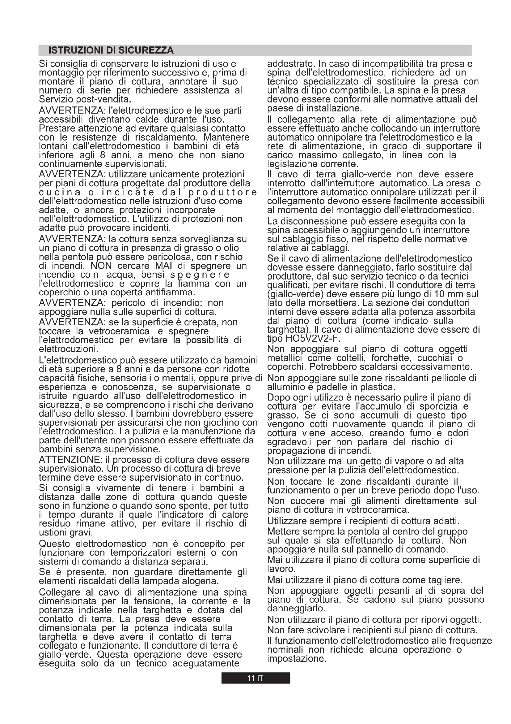 Se il cavo di alimentazione dell'elettrodomestico dovesse essere danneggiato, farlo sostituire dal produttore, dal suo servizio tecnico o da tecnici qualificati, per evitare rischi. Il conduttore di terra (giallo-verde) deve essere più lungo di 10 mm sul lato della morsettiera. La sezione dei conduttori interni deve essere adatta alla potenza assorbita dal piano di cottura (come indicato sulla targhetta). Il cavo di alimentazione deve essere di tipo HO5V2V2-F.