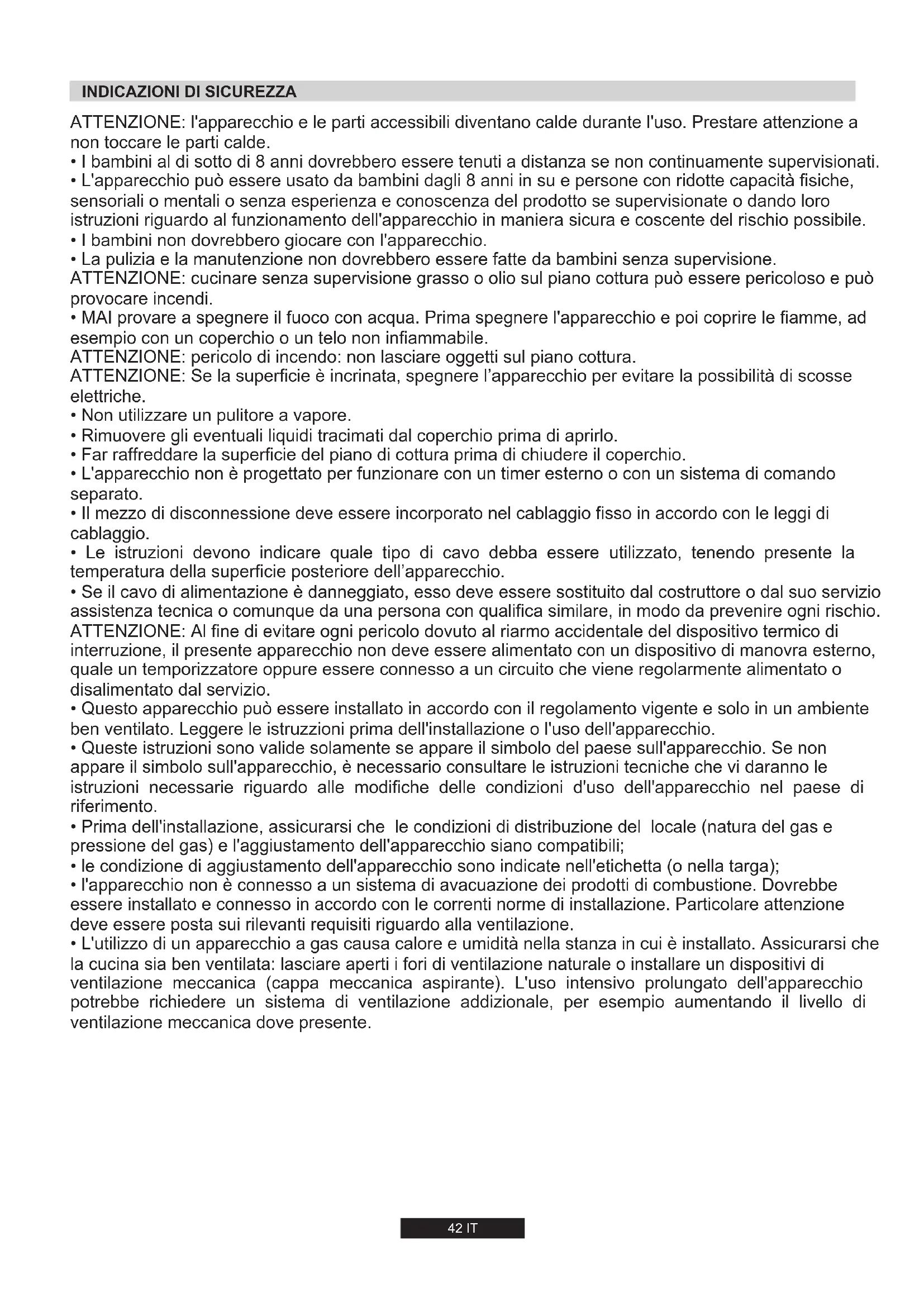 - MAI provare a spegnere il fuoco con acqua. Prima spegnere l'apparecchio e poi coprire le fiamme, ad esempio con un coperchio o un telo non infiammabile. ATTENZIONE: pericolo di incendo: non lasciare oggetti sul piano cottura. ATTENZIONE: Se la superficie è incrinata, spegnere l’apparecchio per evitare la possibilità di scosse elettriche.