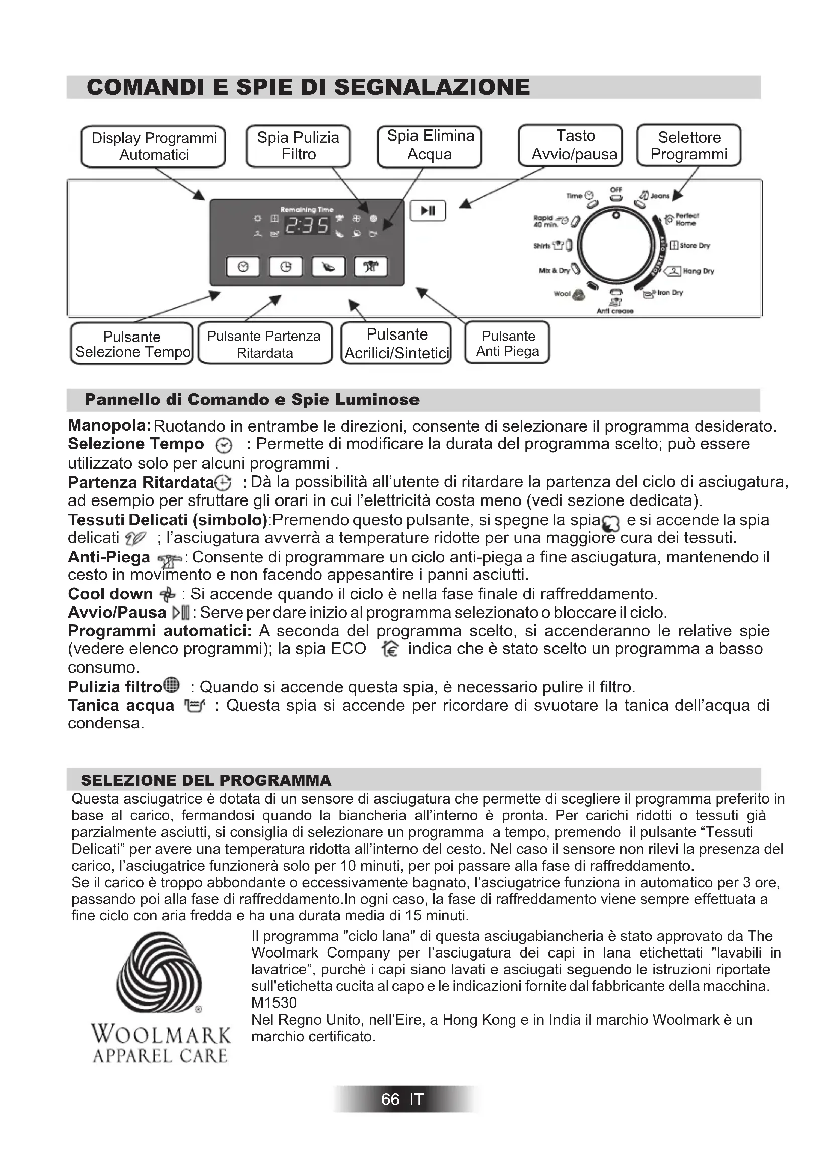 66 IT Il programma "ciclo lana" di questa asciugabiancheria è stato approvato da The Woolmark Company per l’asciugatura dei capi in lana etichettati "lavabili in lavatrice”, purchè i capi siano lavati e asciugati seguendo le istruzioni riportate sull'etichetta cucita al capo e le indicazioni fornite dal fabbricante della macchina. Nel Regno Unito, nell’Eire, a Hong Kong e in India il marchio Woolmark è un marchio certificato.