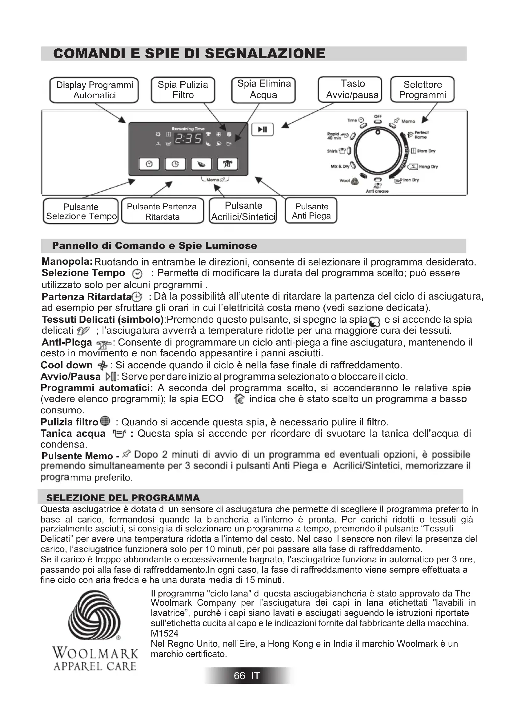 Pannello di Comando e Spie Luminose 66 IT Tasto Avvio/pausa Spia Pulizia Filtro Display Programmi Automatici Selettore Programmi Manopola: Selezione Tempo : Permette di modificare la durata del programma scelto; può essere utilizzato solo per alcuni programmi . Partenza Ritardata : ad esempio per sfruttare gli orari in cui l’elettricità costa meno (vedi sezione dedicata). Tessuti Delicati (simbolo):Premendo questo pulsante, si spegne la spia e si accende la spia delicati ; l’asciugatura avverrà a temperature ridotte per una maggiore cura dei tessuti. Anti-Piega : Consente di programmare un ciclo anti-piega a fine asciugatura, mantenendo il cesto in movimento e non facendo appesantire i panni asciutti. Cool down : Si accende quando il ciclo è nella fase finale di raffreddamento. Avvio/Pausa : Serve per dare inizio al programma selezionato o bloccare il ciclo. Programmi automatici: A seconda del programma scelto, si accenderanno le relative spie (vedere elenco programmi); la spia ECO indica che è stato scelto un programma a basso consumo. Pulizia filtro : Quando si accende questa spia, è necessario pulire il filtro. Tanica acqua : Questa spia si accende per ricordare di svuotare la tanica dell’acqua di condensa. Ruotando in entrambe le direzioni, consente di selezionare il programma desiderato. Dà la possibilità all’utente di ritardare la partenza del ciclo di asciugatura, Spia Elimina Acqua Pulsante Selezione Tempo Pulsante Acrilici/Sintetici Pulsante Anti PiegaPulsante Partenza Ritardata Pulsente Memo - mma preferito. Il programma "ciclo lana" di questa asciugabiancheria è stato approvato da The Woolmark Company per l’asciugatura dei capi in lana etichettati "lavabili in lavatrice”, purchè i capi siano lavati e asciugati seguendo le istruzioni riportate sull'etichetta cucita al capo e le indicazioni fornite dal fabbricante della macchina. M1524 Nel Regno Unito, nell’Eire, a Hong Kong e in India il marchio Woolmark è un marchio certificato.SELEZIONE DEL PROGRAMMA 67 IT