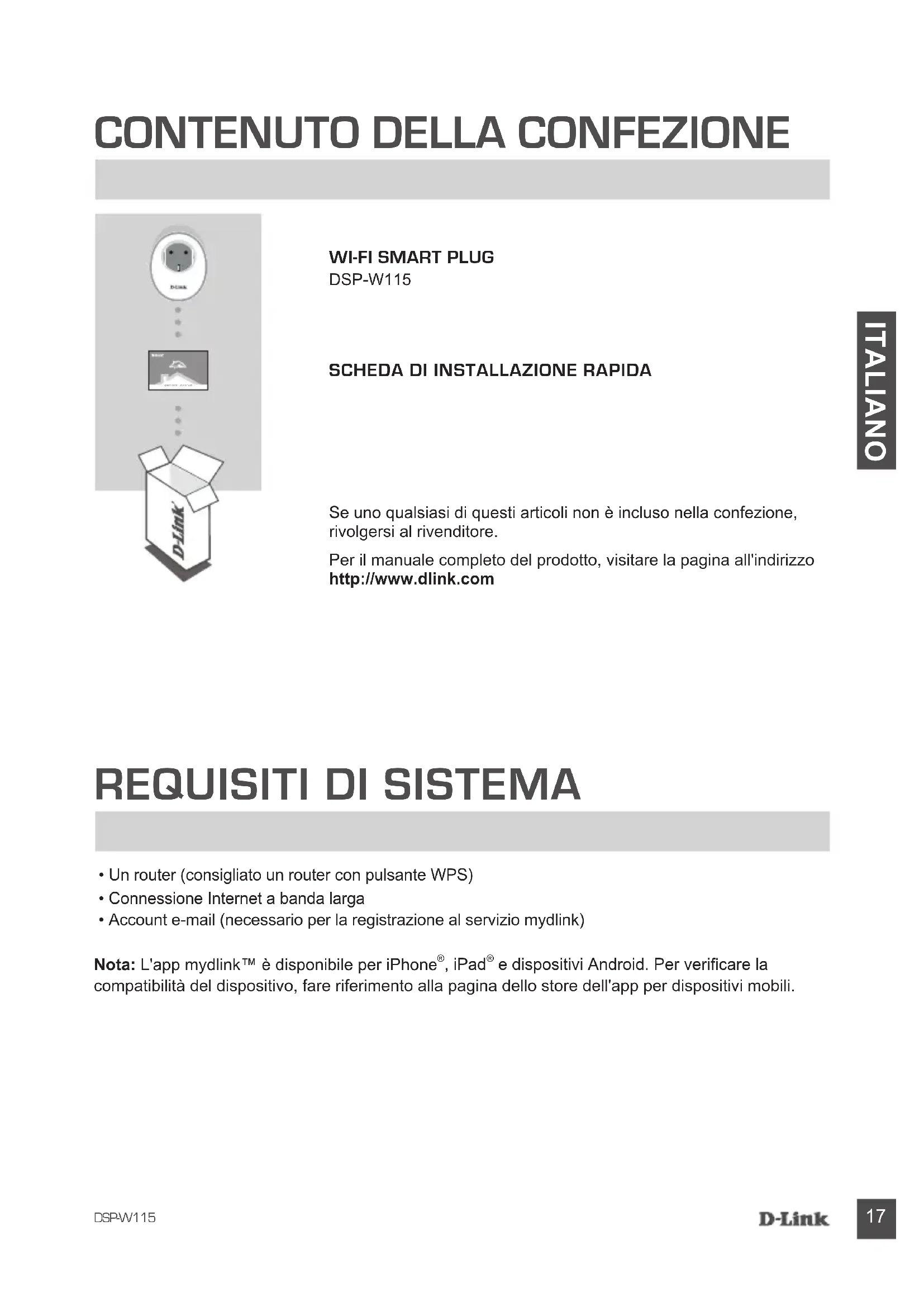 e dispositivi Android. Per vericare la compatibilità del dispositivo, fare riferimento alla pagina dello store dell'app per dispositivi mobili. Se uno qualsiasi di questi articoli non è incluso nella confezione, rivolgersi al rivenditore. Per il manuale completo del prodotto, visitare la pagina all'indirizzo http://www.dlink.com