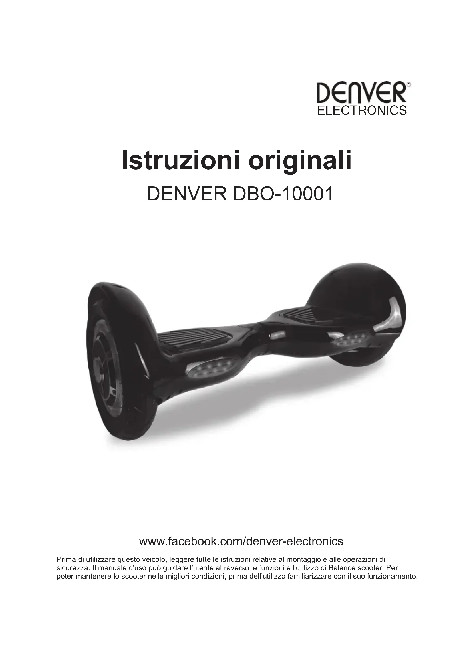 Danemark Omega 5A, Soeften, DK-8382 Hinnerup, FRA 8Istruzioni originali DENVER DBO-10001 www.facebook.com/denver-electronics Prima di utilizzare questo veicolo, leggere tutte le istruzioni relative al montaggio e alle operazioni di sicurezza. Il manuale d'uso può guidare l'utente attraverso le funzioni e l'utilizzo di Balance scooter. Per poter mantenere lo scooter nelle migliori condizioni, prima dell’utilizzo familiarizzare con il suo funzionamento.