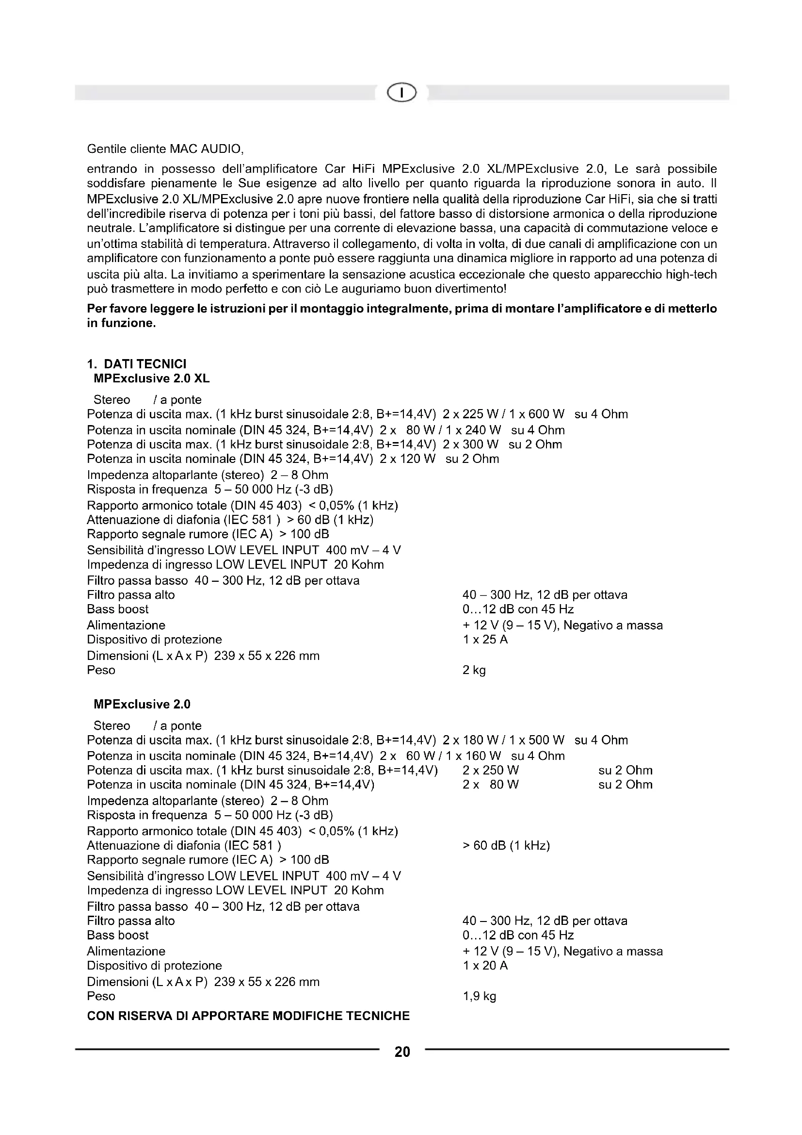 MPExclusive 2.0 XL Stereo / a ponte Potenza di uscita max. (1 kHz burst sinusoidale 2:8, B+=14,4V) 2 x 225 W / 1 x 600 W su 4 Ohm Potenza in uscita nominale (DIN 45 324, B+=14,4V) 2 x 80 W / 1 x 240 W su 4 Ohm Potenza di uscita max. (1 kHz burst sinusoidale 2:8, B+=14,4V) 2 x 300 W su 2 Ohm Potenza in uscita nominale (DIN 45 324, B+=14,4V) 2 x 120 W su 2 Ohm Impedenza altoparlante (stereo) 2 – 8 Ohm Risposta in frequenza 5 – 50 000 Hz (-3 dB) Rapporto armonico totale (DIN 45 403) < 0,05% (1 kHz) Attenuazione di diafonia (IEC 581 ) > 60 dB (1 kHz) Rapporto segnale rumore (IEC A) > 100 dB Sensibilità d’ingresso LOW LEVEL INPUT 400 mV – 4 V Impedenza di ingresso LOW LEVEL INPUT 20 Kohm Filtro passa basso 40 – 300 Hz, 12 dB per ottava Filtro passa alto 40 – 300 Hz, 12 dB per ottava Bass boost 0…12 dB con 45 Hz Alimentazione + 12 V (9 – 15 V), Negativo a massa Dispositivo di protezione 1 x 25 A Dimensioni (L x A x P) 239 x 55 x 226 mm Peso 2 kg MPExclusive 2.0 Stereo / a ponte Potenza di uscita max. (1 kHz burst sinusoidale 2:8, B+=14,4V) 2 x 180 W / 1 x 500 W su 4 Ohm Potenza in uscita nominale (DIN 45 324, B+=14,4V) 2 x 60 W / 1 x 160 W su 4 Ohm Potenza di uscita max. (1 kHz burst sinusoidale 2:8, B+=14,4V) 2 x 250 W su 2 Ohm Potenza in uscita nominale (DIN 45 324, B+=14,4V) 2 x 80 W su 2 Ohm Impedenza altoparlante (stereo) 2 – 8 Ohm Risposta in frequenza 5 – 50 000 Hz (-3 dB) Rapporto armonico totale (DIN 45 403) < 0,05% (1 kHz) Attenuazione di diafonia (IEC 581 ) > 60 dB (1 kHz) Rapporto segnale rumore (IEC A) > 100 dB Sensibilità d’ingresso LOW LEVEL INPUT 400 mV – 4 V Impedenza di ingresso LOW LEVEL INPUT 20 Kohm Filtro passa basso 40 – 300 Hz, 12 dB per ottava Filtro passa alto 40 – 300 Hz, 12 dB per ottava Bass boost 0…12 dB con 45 Hz Alimentazione + 12 V (9 – 15 V), Negativo a massa Dispositivo di protezione 1 x 20 A Dimensioni (L x A x P) 239 x 55 x 226 mm Peso 1,9 kg