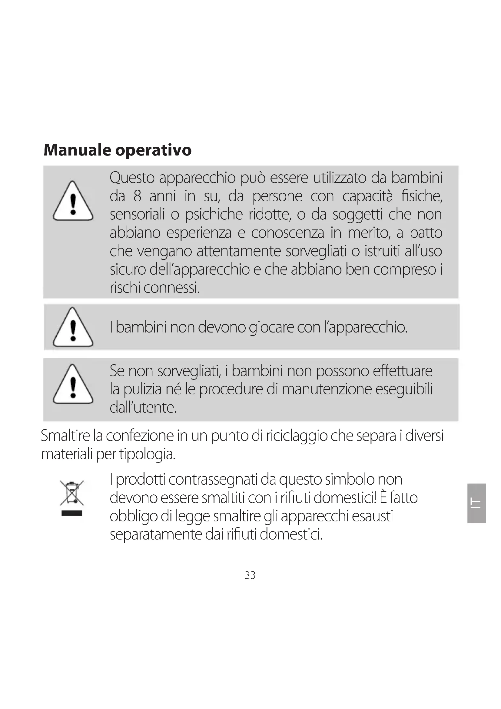 Questo apparecchio può essere utilizzato da bambini da 8 anni in su, da persone con capacità fisiche, sensoriali o psichiche ridotte, o da soggetti che non abbiano esperienza e conoscenza in merito, a patto che vengano attentamente sorvegliati o istruiti all'uso sicuro dell'apparecchio e che abbiano ben compreso i rischi connessi.