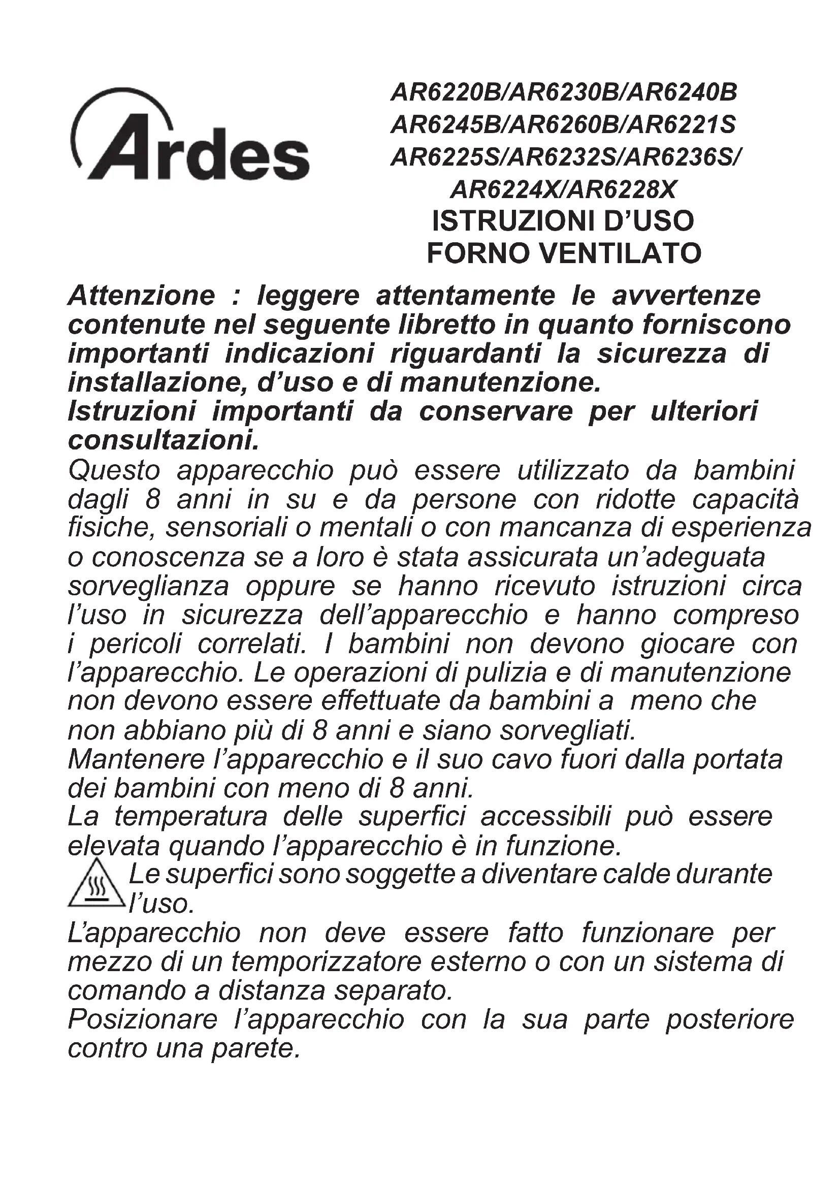 Attenzione : leggere attentamente le avvertenze contenute nel seguente libretto in quanto forniscono importanti indicazioni riguardanti la sicurezza di installazione, d’uso e di manutenzione. Istruzioni importanti da conservare per ulteriori consultazioni. Questo apparecchio può essere utilizzato da bambini dagli 8 anni in su e da persone con ridotte capacità siche, sensoriali o mentali o con mancanza di esperienza o conoscenza se a loro è stata assicurata un’adeguata sorveglianza oppure se hanno ricevuto istruzioni circa l’uso in sicurezza dell’apparecchio e hanno compreso i pericoli correlati. I bambini non devono giocare con l’apparecchio. Le operazioni di pulizia e di manutenzione non devono essere eettuate da bambini a meno che non abbiano più di 8 anni e siano sorvegliati. Mantenere l’apparecchio e il suo cavo fuori dalla portata dei bambini con meno di 8 anni. La temperatura delle superci accessibili può essere elevata quando l’apparecchio è in funzione. Le superci sono soggette a diventare calde durante l’uso. L’apparecchio non deve essere fatto funzionare per mezzo di un temporizzatore esterno o con un sistema di comando a distanza separato. Posizionare l’apparecchio con la sua parte posteriore contro una parete. AR6220B/AR6230B/AR6240B AR6245B/AR6260B/AR6221S AR6225S/AR6232S/AR6236S/ AR6224X/AR6228X
