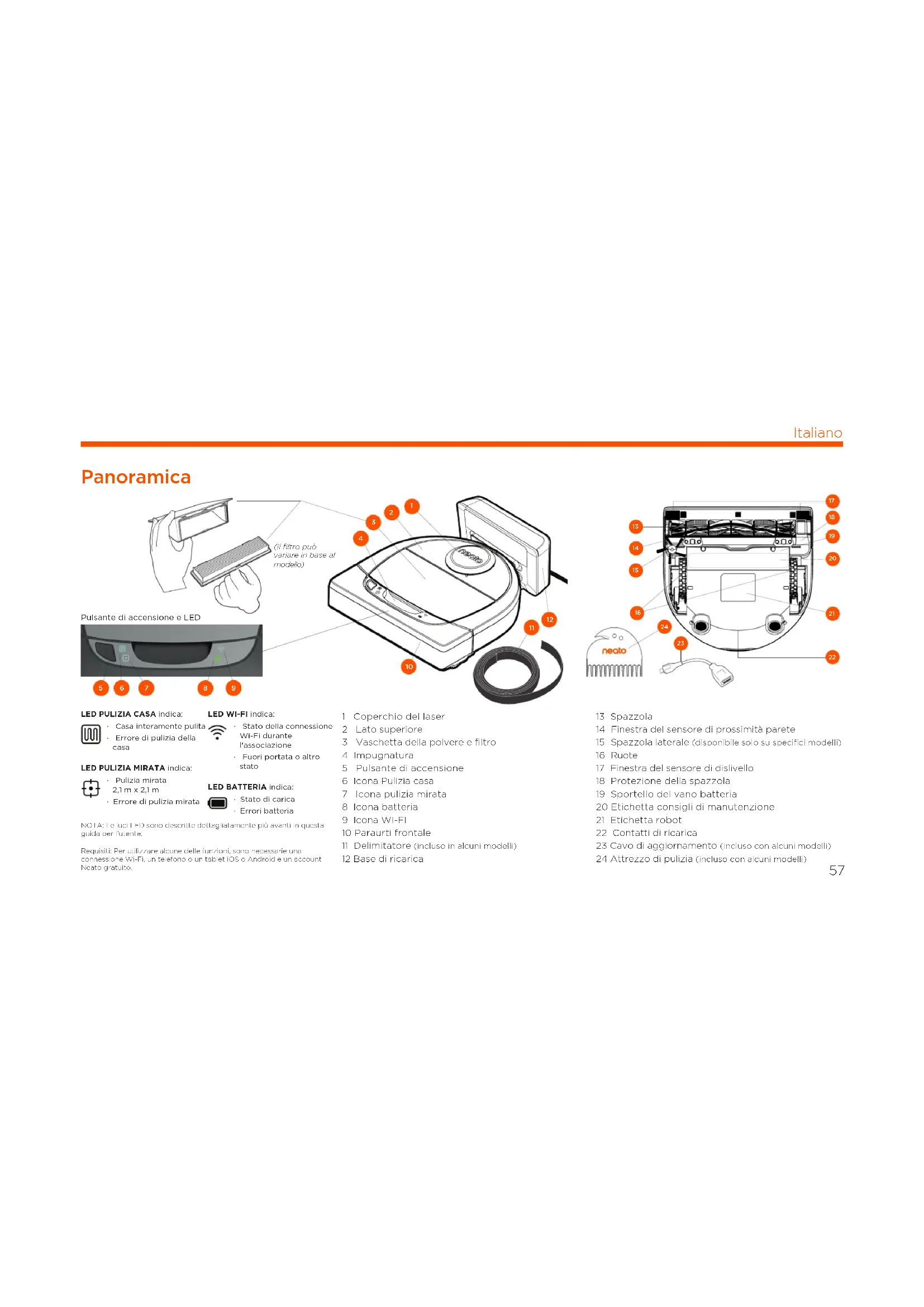 - Analogamente, la spazzola rotante del robot Neato agisce come un normale aspirapolvere verticale, quindi non utilizzate il robot Neato su pavimenti o tappeti (per es. con frange) su cui non usereste un normale aspirapolvere verticale. La Neato Robotics non è responsabile per eventuali danni arrecati a mobili, oggetti, tappeti o pavimenti. Importante: Leggere prima di procedere con l'installazione Italiano56 Sommario Volete vedere come si fa? Video sull'installazione e suggerimenti sono disponibili sul sito www.NeatoRobotics.com/Support. Panoramica ..................................................................................... 57 Considerazioni importanti e suggerimenti ...................... 58 Pulsante di accensione e LED ................................................ 59 Funzionamento del robot Neato .......................................... 60 Utilizzo dell'app Neato .............................................................. 61 Neato FloorPlanner con linee di demarcazione ............ 63 Utilizzo del robot Neato senza l'app Neato .................... 65 Manutenzione del robot Neato ............................................. 66 Ulteriori informazioni .................................................................. 67 Risoluzione dei problemi .......................................................... 68 Il robot Neato ................................................................................. 7257 Panoramica