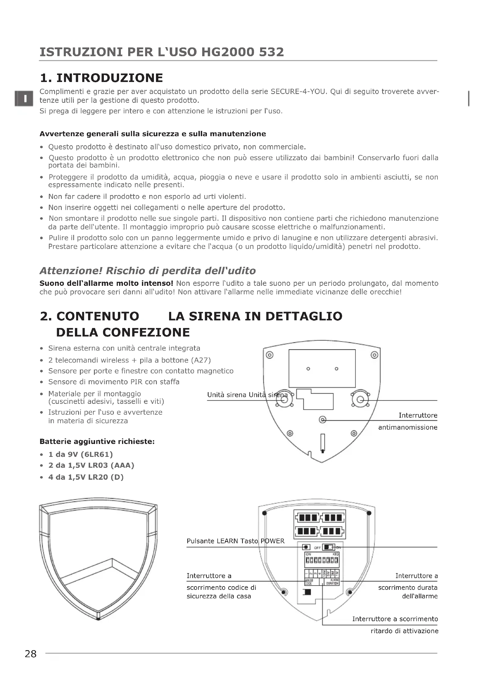 - 4 da 1,5V LR20 (D) Unità sirena Unità sirena Interruttore antimanomissione Pulsante LEARN Tasto POWER Interruttore a scorrimento durata dell‘allarme Interruttore a scorrimento codice di sicurezza della casa Interruttore a scorrimento ritardo di attivazione29
