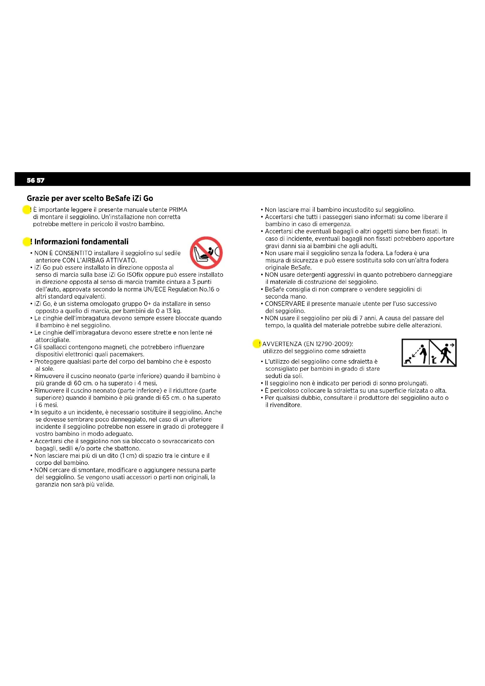 - NON cercare di smontare, modificare o aggiungere nessuna parte del seggiolino. Se vengono usati accessori o parti non originali, la garanzia non sarà più valida. Grazie per aver scelto BeSafe iZi Go ! È importante leggere il presente manuale utente PRIMA di montare il seggiolino. Un’installazione non corretta potrebbe mettere in pericolo il vostro bambino. ! AVVERTENZA (EN 12790-2009): utilizzo del seggiolino come sdraietta