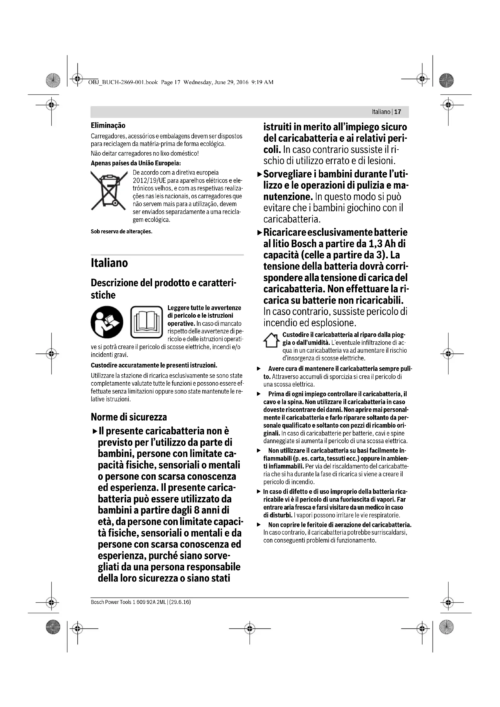 Peso conforme EPTA-Procedure 01:2014 kg 0,46 Classe de proteção / II OBJ_BUCH-2869-001.book Page 15 Wednesday, June 29, 2016 9:19 AM16 | Português 1 609 92A 2ML | (29.6.16) Bosch Power Tools Significado dos elementos de indicação Luz verde intermitente de indicação da carga do acumula- dor 4 O processo de carga rápido é sinalizado pe- lo piscar verde da indicação de carga do acumulador 4. Nota: O processo de carga rápida só pode ser realizado se a temperatura do acumulador estiver dentro da faixa de tempe- ratura de carga admissível, veja trecho “Dados técnicos”. Luz permanente verde de indicação da carga do acumula- dor 4 A iluminação permanente verde da indi- cação de carga do acumulador 4 indica, que o acumulador está completamente carrega- do. Em seguida o acumulador pode ser colocado imediatamente em funcionamento. Quando o acumulador não está introduzido, a Luz permanen- te da indicação de carga do acumulador 4 sinaliza que a ficha de rede está introduzida na tomada e que o carregador está pronto para funcionar. Luz permanente vermelha de indicação da carga do acu- mulador 3 A luz permanente vermelha da indicação de carga do acumulador 3 sinaliza, que a temperatura do acumulador está além da faixa de temperatura de carga admissível, veja capítulo “Dados técnicos”. Assim que a faixa de tempera- tura admissível for alcançada, o carregador comutar-se-á au- tomaticamente para o carregamento rápido. Luz intermitente vermelha de indicação da carga do acu- mulador 3 A luz intermitente vermelha da indicação de carga do acumulador 3 sinaliza uma ou- tra avaria do processo de carga, veja capítu- lo “Avaria – Causas e ações corretivas”. Avaria – Causas e ações corretivas Indicações de trabalho No caso de contínuos e repetidos ciclos de carga, sem inter- rupção, é possível que o carregador se esquente. Isto no en- tanto não tem importância e não apresenta qualquer defeito técnico do carregador. Um período de funcionamento reduzido após o carregamen- to, indica que o acumulador está gasto e que deve ser substi- tuído. Manutenção e serviço Se for necessário substituir o cabo de conexão, isto deverá ser realizado pela Bosch ou por uma oficina de serviço pós- venda autorizada para todas as ferramentas elétricas Bosch para evitar riscos de segurança. Serviço pós-venda e consultoria de aplicação O serviço pós-venda responde às suas perguntas a respeito de serviços de reparação e de manutenção do seu produto, assim como das peças sobressalentes. Desenhos explodidos e informações sobre peças sobressalentes encontram-se em: www.bosch-pt.com A nossa equipa de consultoria de aplicação Bosch esclarece com prazer todas as suas dúvidas a respeito da compra, apli- cação e ajuste dos produtos e acessórios. Indique para todas as questões e encomendas de peças so- bressalentes a referência de 10 dígitos de acordo com a placa de caraterísticas do produto. Portugal Robert Bosch LDA Avenida Infante D. Henrique Lotes 2E – 3E 1800 Lisboa Para efetuar o seu pedido online de peças entre na página www.ferramentasbosch.com. Tel.: 21 8500000 Fax: 21 8511096 Brasil Robert Bosch Ltda. Caixa postal 1195 13065-900 Campinas Tel.: (0800) 7045446 www.bosch.com.br/contacto Causa Solução Indicação vermelha da carga do acumulador 3 pisca Nenhum processo de carga possível O acumulador não foi (corre- tamente) colocado Colocar o acumulador corre- tamente no carregador Contactos do acumulador sujos Limpar os contactos do acu- mulador, p. ex. colocando e retirando repetidamente o acumulador, se necessário substituir o acumulador Acumulador com defeito Substituir o acumulador As indicações de carga do acumulador 4 ou 3 não se ilu- minam A ficha de rede do carregador não está (corretamente) introduzida Introduzir a ficha de rede (to- talmente) na tomada Tomada, cabo de rede ou car- regador com defeito Controlar a tensão de rede, se necessário, permitir que o carregador seja controlado por uma oficina de serviço au- torizada para ferramentas elétricas Bosch Causa Solução OBJ_BUCH-2869-001.book Page 16 Wednesday, June 29, 2016 9:19 AMItaliano | 17 Bosch Power Tools 1 609 92A 2ML | (29.6.16) Eliminação Carregadores, acessórios e embalagens devem ser dispostos para reciclagem da matéria-prima de forma ecológica. Não deitar carregadores no lixo doméstico! Apenas países da União Europeia: De acordo com a diretiva europeia 2012/19/UE para aparelhos elétricos e ele- trónicos velhos, e com as respetivas realiza- ções nas leis nacionais, os carregadores que não servem mais para a utilização, devem ser enviados separadamente a uma recicla- gem ecológica. Sob reserva de alterações. Italiano Descrizione del prodotto e caratteri- stiche Leggere tutte le avvertenze di pericolo e le istruzioni operative. In caso di mancato rispetto delle avvertenze di pe- ricolo e delle istruzioni operati- ve si potrà creare il pericolo di scosse elettriche, incendi e/o incidenti gravi. Custodire accuratamente le presenti istruzioni. Utilizzare la stazione di ricarica esclusivamente se sono state completamente valutate tutte le funzioni e possono essere ef- fettuate senza limitazioni oppure sono state mantenute le re- lative istruzioni. Norme di sicurezza Il presente caricabatteria non è previsto per l’utilizzo da parte di bambini, persone con limitate ca- pacità fisiche, sensoriali o mentali o persone con scarsa conoscenza ed esperienza. Il presente carica- batteria può essere utilizzato da bambini a partire dagli 8 anni di età, da persone con limitate capaci- tà fisiche, sensoriali o mentali e da persone con scarsa conoscenza ed esperienza, purché siano sorve- gliati da una persona responsabile della loro sicurezza o siano stati istruiti in merito all’impiego sicuro del caricabatteria e ai relativi peri- coli. In caso contrario sussiste il ri- schio di utilizzo errato e di lesioni. Sorvegliare i bamb