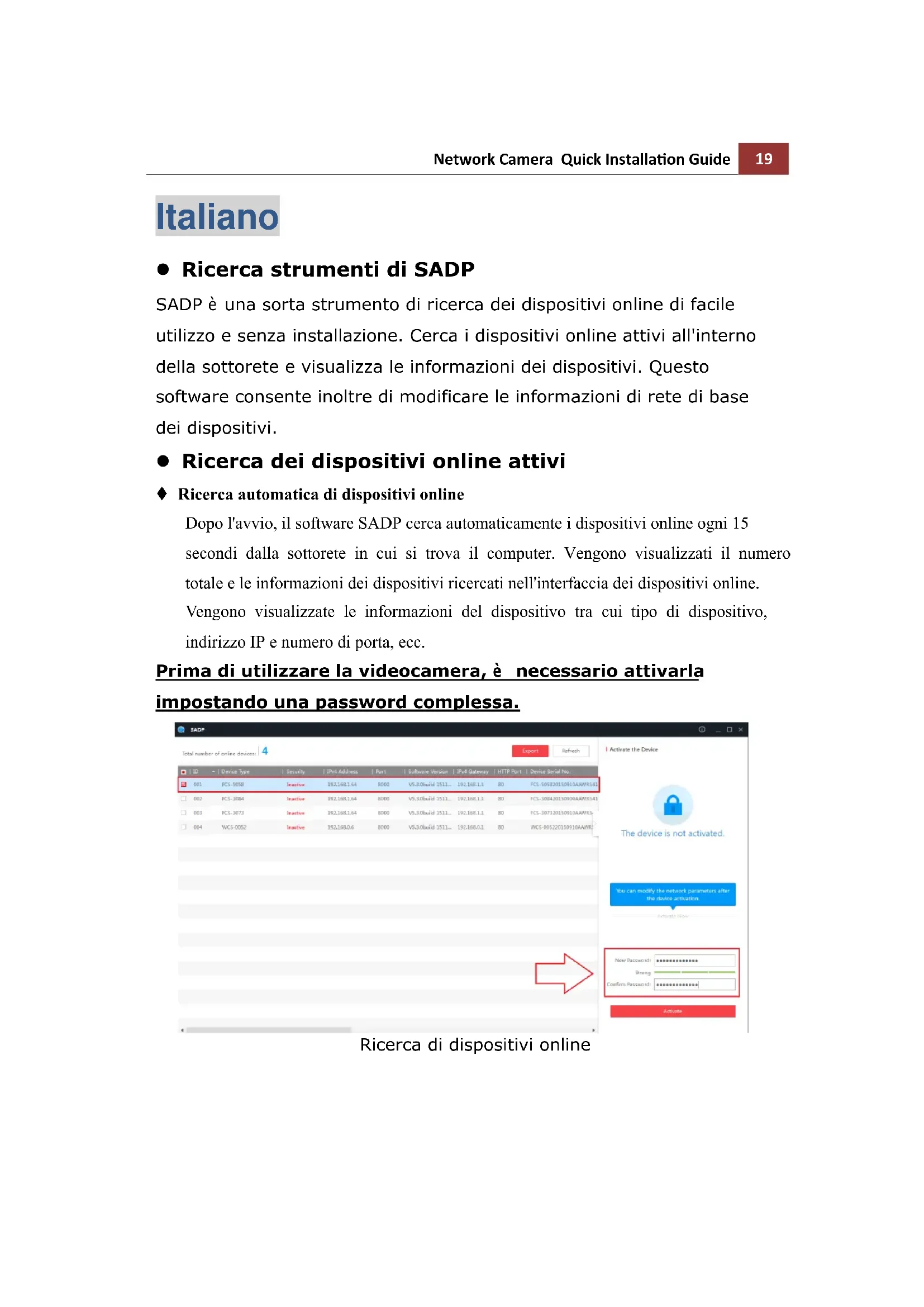 Italiano Ricerca strumenti di SADP SADP è una sorta strumento di ricerca dei dispositivi online di facile utilizzo e senza installazione. Cerca i dispositivi online attivi all'interno della sottorete e visualizza le informazioni dei dispositivi. Questo software consente inoltre di modificare le informazioni di rete di base dei dispositivi. Ricerca dei dispositivi online attivi Ricerca automatica di dispositivi online Dopo l'avvio, il software SADP cerca automaticamente i dispositivi online ogni 15 secondi dalla sottorete in cui si trova il computer. Vengono visualizzati il numero totale e le informazioni dei dispositivi ricercati nell'interfaccia dei dispositivi online. Vengono visualizzate le informazioni del dispositivo tra cui tipo di dispositivo, indirizzo IP e numero di porta, ecc. Prima di utilizzare la videocamera, è necessario attivarla impostando una password complessa. Ricerca di dispositivi online20 Network Camera Quick Installation Guide