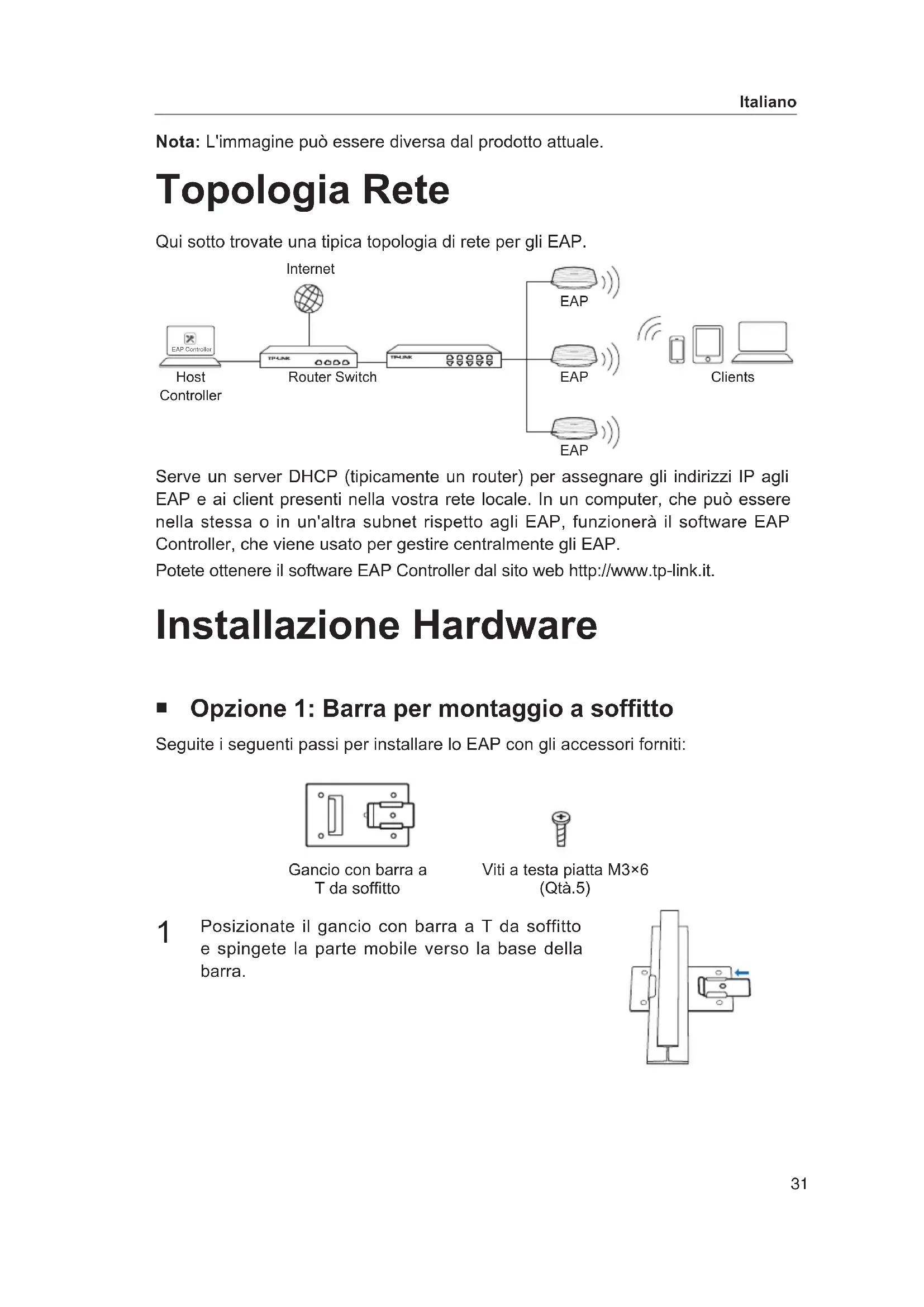 Posizionate il gancio con barra a T da soffitto e spingete la parte mobile verso la base della barra. Host ControllerRouter SwitchClients Gancio con barra a T da softto Viti a testa piatta M3×6 (Qtà.5) Internet EAP EAP EAP32 Italiano