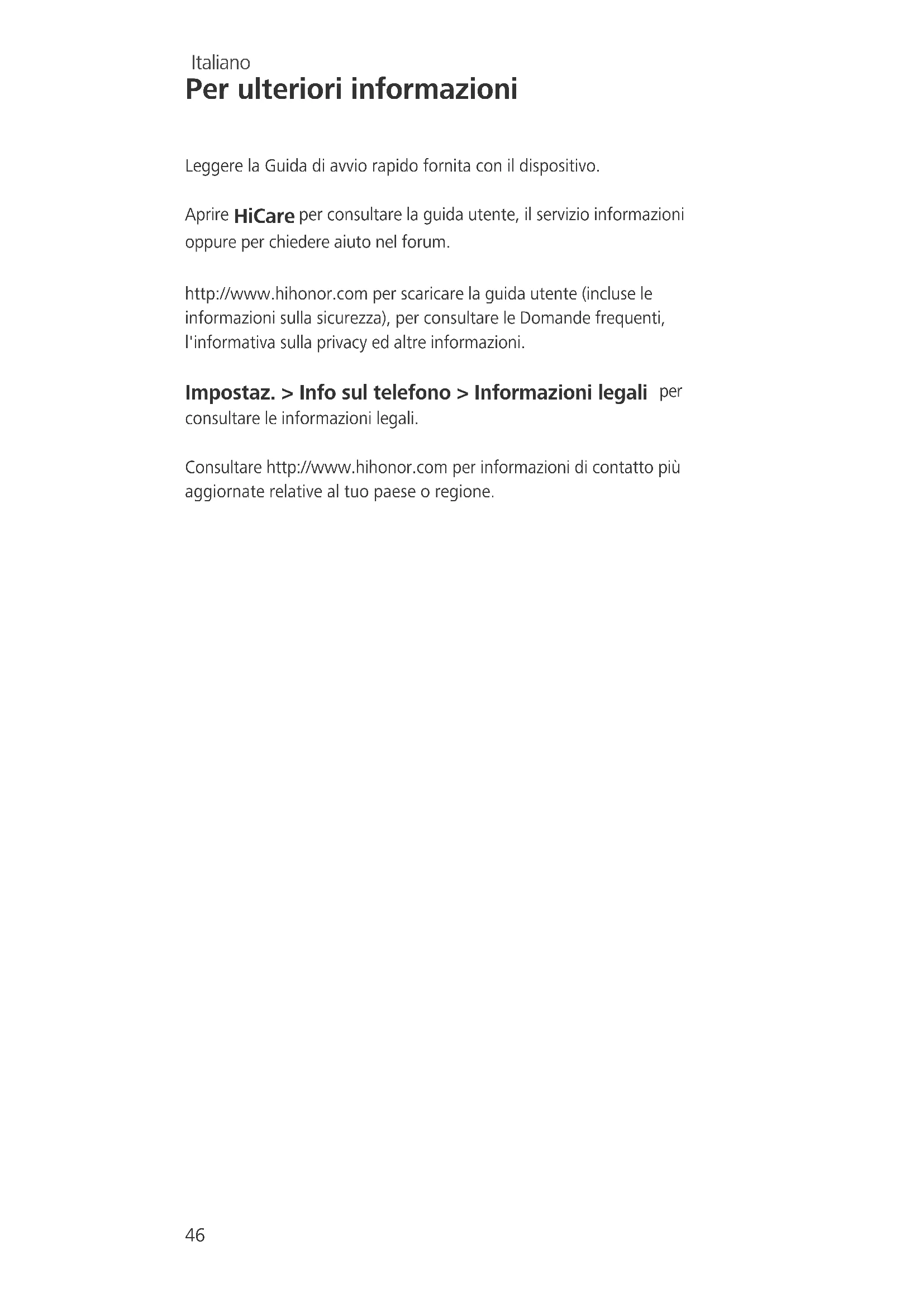 Se il dispositivo si rompe dopo un urto, smettere immediatamente di utilizzarlo. Non toccare né tentare di rimuovere le parti rotte. Rivolgersi tempestivamente a un centro di assistenza autorizzato. Chiamate di emergenza La disponibilità ad effettuare chiamate di emergenza è soggetta alla qualità della rete cellulare in uso, ai criteri adottati dall'operatore e alle leggi e alle regolamentazioni locali. È consigliabile non affidarsi unicamente al dispositivo per effettuare comunicazioni di importanza critica, come ad esempio nel caso di un'emergenza medica. Informazioni sullo smaltimento e sul riciclo Questo simbolo (con o senza una barra continua) sul dispositivo, sulle batterie (se incluse) e/o sulla confezione, indica che il dispositivo, i suoi accessori elettrici (ad esempio auricolare, adattatore, cavo) e le batterie non devono essere smaltiti insieme ai rifiuti domestici. Questi elementi non vanno smaltiti nei rifiuti cittadini indifferenziati e vanno conferiti presso appositi punti di raccolta autorizzati per il riciclo o il corretto smaltimento. Per informazioni più dettagliate sul riciclo del dispositivo e delle batterie, rivolgersi all'ufficio locale preposto, all'ente per lo smaltimento dei rifiuti o al punto di acquisto. Lo smaltimento del dispositivo e delle batterie (se incluse) è regolamentato dalla Direttiva WEEE (Direttiva 2012/19/UE) e dalla Direttiva sulle batterie (Direttiva 2006/66/CE). Per ridurre al minimo il potenziale impatto ambientale sulla salute dovuto alle sostanze pericolose in essi contenuti, i RAEE e le batterie devono essere smaltiti separatamente dagli altri rifiuti.55 Riduzione delle sostanze pericolose Il dispositivo è conforme alla Regolamentazione REACH [Regolamentazione (CE) n. 1907/2006] e alla Direttiva RoHS (Direttiva 2011/65/UE). Le batterie (se incluse) sono conformi alla Direttiva per le batterie (Direttiva 2006/66/ CE). Per le informazioni più recenti in tema di conformità a REACH e RoHS, visitare il sito Web http://www.hihonor.com. Conformità alla normativa UE Utilizzo a contatto con il corpo Il dispositivo è conforme alle specifiche RF quando viene utilizzato accostato all'orecchio o a una distanza di 1,5 cm dal corpo. Verificare che gli accessori del dispositivo, come astucci o custodie, non abbiano componenti metalliche. Mantenere sempre il dispositivo lontano dal corpo per rispettare i requisiti sulla distanza. Informazioni sulla certificazione (SAR) Questo dispositivo soddisfa i requisiti stabiliti dalle direttive sull'esposizione alle onde radio. Questo è un dispositivo di ricezione e trasmissione a bassa potenza. È stato progettato in modo da non superare i limiti di esposizione alle onde radio raccomandati dalle direttive internazionali. Tali direttive sono state sviluppate dall'ICNIRP (International Commission on Non-Ionizing Radiation Protection), un'organizzazione scientifica indipendente, e prevedono misure di sicurezza destinate a garantire la protezione di tutte le persone, indipendentemente dall'età e dalle condizioni di salute. Il tasso di assorbimento specifico (SAR) è l'unità di misura della quantità di frequenze radio assorbite dal corpo durante l'utilizzo di un dispositivo. Il valore SAR è determinato in base al livello massimo di potenza osservato in laboratorio. Il livello di SAR effettivo raggiunto durante l'utilizzo del dispositivo può tuttavia rivelarsi inferiore. Ciò avviene perché il dispositivo è progettato per funzionare al livello minimo di potenza richiesto per connettersi alla rete. Il limite SAR adottato in Europa è 2,0 W/kg su una media di 10 grammi di tessuto e il valore SAR più elevato di questo dispositivo soddisfa questo limite. In questo caso, il valore massimo di SAR riportato per questo tipo di dispositivo è di 1,13 W/kg per l'uso all'orecchio, e di 0,52 W/kg quando portato in prossimità del corpo. Dichiarazione Con il presente documento, Huawei Technologies Co., Ltd. dichiara che questo dispositivo è conforme ai requisiti essenziali e alle altre disposizioni applicabili della direttiva 1999/5/CE e alla Direttiva 2011/65/EU. Per la dichiarazione di conformità, visitare il sito Web http://www.hihonor.com.56 Nel prodotto è inclusa la seguente dicitura: Questo dispositivo può essere usato in tutti gli stati membri dell'Unione Europea. Rispettare le leggi nazionali e locali durante l'uso del dispositivo. L'uso del dispositivo può essere limitato sulla base della rete locale. Limitazioni nella banda dei 2,4 GHz: Norvegia : questa sottosezione non si applica all'area geografica entro un raggio di 20 km dal centro di Ny-Ålesund. Limitazioni nella banda dei 5 GHz: la funzione WLAN di questo dispositivo è limitata al solo uso in interni quando funzionante nella gamma di frequenza compresa tra 5150 e 5350 MHz. Sicurezza delle informazioni e dei dati personali L'uso di alcune funzioni o di applicazioni di terze parti sul dispositivo potrebbe generare la perdita delle proprie informazioni e dati personali o la possibilità di accesso ad esse da parte di altri. Per proteggere le informazioni personali e quelle riservate, sono consigliate numerose misure.