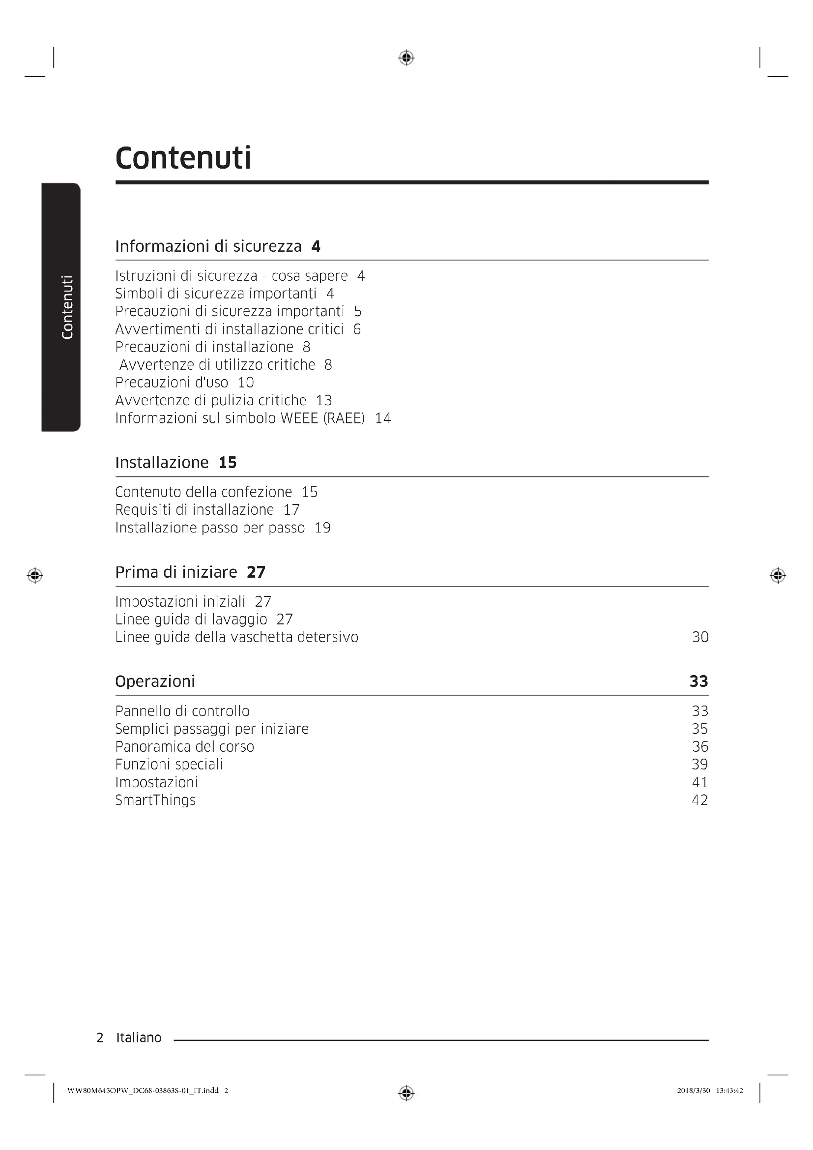 (0800-SAMSUNG) www.samsung.com/ch/support (German) www.samsung.com/ch_fr/support (French) DC68-03863S-01 WW80M645OPW_DC68-03863S-01_FR.indd 70 2018/3/30 13:44:44Lavatrice Manuale dell'utente WW90M6***** / WW80M6***** WW80M645OPW_DC68-03863S-01_IT.indd 1 2018/3/30 13:43:422 Italiano Contenuti Contenuti Informazioni di sicurezza 4 Istruzioni di sicurezza - cosa sapere 4 Simboli di sicurezza importanti 4 Precauzioni di sicurezza importanti 5 Avvertimenti di installazione critici 6 Precauzioni di installazione 8 Avvertenze di utilizzo critiche 8 Precauzioni d'uso 10 Avvertenze di pulizia critiche 13 Informazioni sul simbolo WEEE (RAEE) 14 Installazione 15 Contenuto della confezione 15 Requisiti di installazione 17 Installazione passo per passo 19 Prima di iniziare 27 Impostazioni iniziali 27 Linee guida di lavaggio 27 Linee guida della vaschetta detersivo 30 Operazioni 33 Pannello di controllo 33 Semplici passaggi per iniziare 35 Panoramica del corso 36 Funzioni speciali 39 Impostazioni 41 SmartThings 42 WW80M645OPW_DC68-03863S-01_IT.indd 2 2018/3/30 13:43:42Italiano 3 Contenuti Manutenzione 47 Eco pulizia cestello