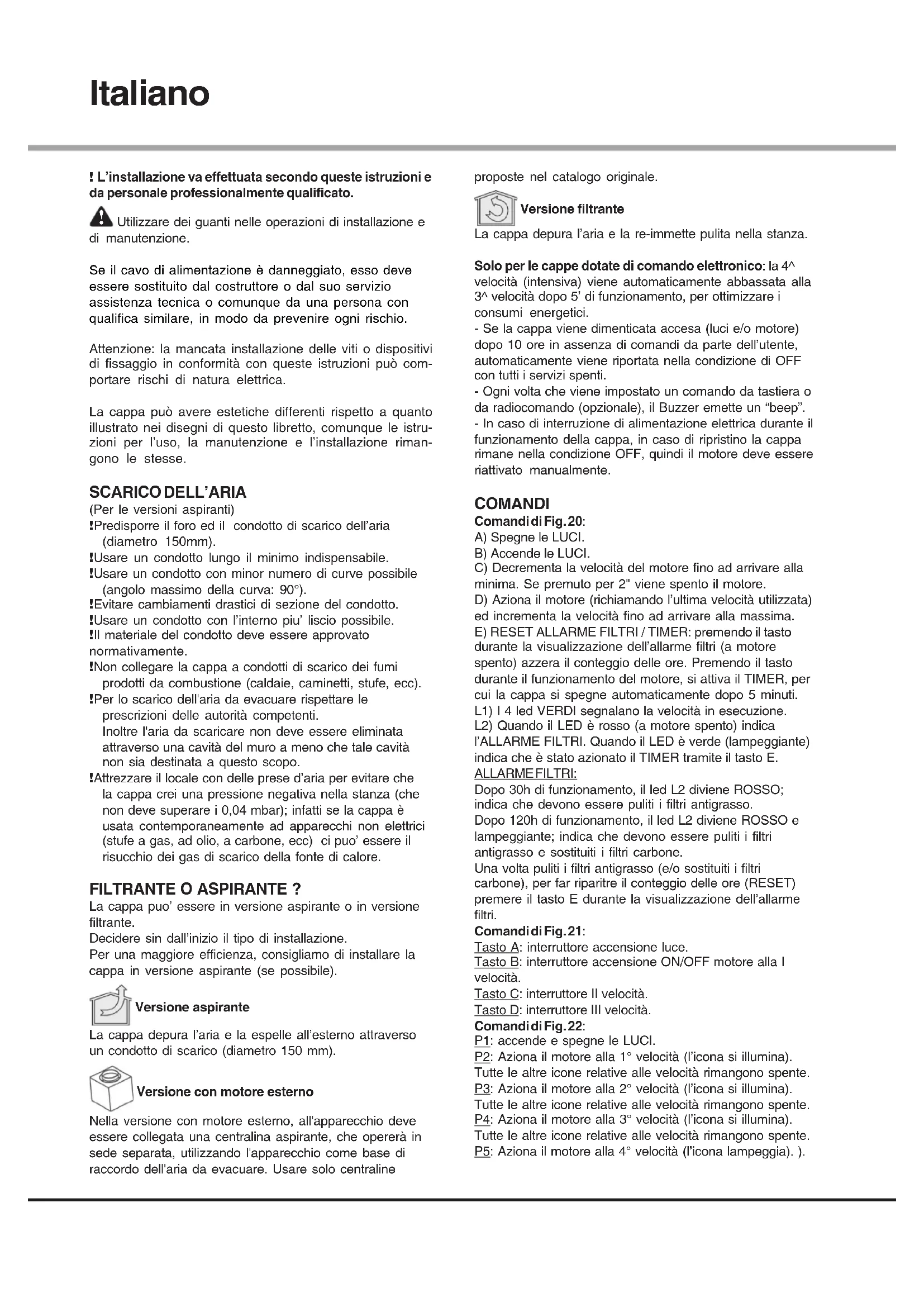 (Per le versioni aspiranti) ! Predisporre il foro ed il condotto di scarico dell’aria (diametro 150mm). ! Usare un condotto lungo il minimo indispensabile. ! Usare un condotto con minor numero di curve possibile (angolo massimo della curva: 90°). ! Evitare cambiamenti drastici di sezione del condotto. ! Usare un condotto con l’interno piu’ liscio possibile. ! Il materiale del condotto deve essere approvato normativamente. ! Non collegare la cappa a condotti di scarico dei fumi prodotti da combustione (caldaie, caminetti, stufe, ecc). ! Per lo scarico dell'aria da evacuare rispettare le prescrizioni delle autorità competenti. Inoltre l'aria da scaricare non deve essere eliminata attraverso una cavità del muro a meno che tale cavità non sia destinata a questo scopo. ! Attrezzare il locale con delle prese d’aria per evitare che la cappa crei una pressione negativa nella stanza (che non deve superare i 0,04 mbar); infatti se la cappa è usata contemporaneamente ad apparecchi non elettrici (stufe a gas, ad olio, a carbone, ecc) ci puo’ essere il risucchio dei gas di scarico della fonte di calore. FILTRANTE O ASPIRANTE ? La cappa puo’ essere in versione aspirante o in versione filtrante. Decidere sin dall’inizio il tipo di installazione. Per una maggiore efficienza, consigliamo di installare la cappa in versione aspirante (se possibile). Versione aspirante La cappa depura l’aria e la espelle all’esterno attraverso un condotto di scarico (diametro 150 mm). Versione con motore esterno Nella versione con motore esterno, all'apparecchio deve essere collegata una centralina aspirante, che opererà in sede separata, utilizzando l'apparecchio come base di raccordo dell'aria da evacuare. Usare solo centraline proposte nel catalogo originale. Versione filtrante La cappa depura l’aria e la re-immette pulita nella stanza. Solo per le cappe dotate di comando elettronico: la 4^ velocità (intensiva) viene automaticamente abbassata alla 3^ velocità dopo 5’ di funzionamento, per ottimizzare i consumi energetici. - Se la cappa viene dimenticata accesa (luci e/o motore) dopo 10 ore in assenza di comandi da parte dell’utente, automaticamente viene riportata nella condizione di OFF con tutti i servizi spenti. - Ogni volta che viene impostato un comando da tastiera o da radiocomando (opzionale), il Buzzer emette un “beep”. - In caso di interruzione di alimentazione elettrica durante il funzionamento della cappa, in caso di ripristino la cappa rimane nella condizione OFF, quindi il motore deve essere riattivato manualmente. COMANDI Comandi di Fig. 20: A) Spegne le LUCI. B) Accende le LUCI. C) Decrementa la velocità del motore fino ad arrivare alla minima. Se premuto per 2" viene spento il motore. D) Aziona il motore (richiamando l’ultima velocità utilizzata) ed incrementa la velocità fino ad arrivare alla massima. E) RESET ALLARME FILTRI / TIMER: premendo il tasto durante la visualizzazione dell’allarme filtri (a motore spento) azzera il conteggio delle ore. Premendo il tasto durante il funzionamento del motore, si attiva il TIMER, per cui la cappa si spegne automaticamente dopo 5 minuti. L1) I 4 led VERDI segnalano la velocità in esecuzione. L2) Quando il LED è rosso (a motore spento) indica l’ALLARME FILTRI. Quando il LED è verde (lampeggiante) indica che è stato azionato il TIMER tramite il tasto E. ALLARME FILTRI: Dopo 30h di funzionamento, il led L2 diviene ROSSO; indica che devono essere puliti i filtri antigrasso. Dopo 120h di funzionamento, il led L2 diviene ROSSO e lampeggiante; indica che devono essere puliti i filtri antigrasso e sostituiti i filtri carbone. Una volta puliti i filtri antigrasso (e/o sostituiti i filtri carbone), per far riparitre il conteggio delle ore (RESET) premere il tasto E durante la visualizzazione dell’allarme filtri. Comandi di Fig. 21: Tasto A: interruttore accensione luce. Tasto B: interruttore accensione ON/OFF motore alla I velocità. Tasto C: interruttore II velocità. Tasto D: interruttore III velocità. Comandi di Fig. 22: P1: accende e spegne le LUCI. P2: Aziona il motore alla 1° velocità (l’icona si illumina). Tutte le altre icone relative alle velocità rimangono spente. P3: Aziona il motore alla 2° velocità (l’icona si illumina). Tutte le altre icone relative alle velocità rimangono spente. P4: Aziona il motore alla 3° velocità (l’icona si illumina). Tutte le altre icone relative alle velocità rimangono spente. P5: Aziona il motore alla 4° velocità (l’icona lampeggia). ).Tutte le altre icone relative alle velocità rimangono spente. La massima velocità è temporizzata ad un massimo di 5 minuti dopo di che viene automaticamente impostata la 3° velocità. P6: Aziona il TIMER (l’icona si illumina). Azionando il Timer (5 minuti), il motore si arresta automaticamente dopo 5 minuti. P7: ALLARME FILTRI. Dopo 30h di funzionamento l’icona si illumina per indicare che bisogna pulire il filtro antigrasso. Dopo 120h di funzionamento l’icona si illumina per indicare che bisogna pulire il filtro antigrasso e sostituire i filtri al carbone. Per fare il RESET dell’allarme si deve premere l’icona mentre è illuminata (o mentre lampeggia). Comandi di Fig. 23-24: Pulsante TC1 (Luci): accende / spegne la luce principale ON/OFF. Quando la luce principale è accesa, BL1 cambia colore e diventa attivo. Con la pressione lunga, accende / spegne le luci di cortesia (opzionali). Pulsante TC2 (Motore-V1). ON/OFF Motore - Attiva il motore in 1° velocità. Pulsante TC3 (Motore-V2). Attiva il motore in 2° velocità. Pulsante TC4 (Motore-V3). Attiva il motore in 3° velocità. Pulsante TC5 (Motore-V4). Attiva il motore in 4° velocità. La massima velocità è temporizzata ad un massimo di 5 min. dopo di che viene automaticamente impostata la 3° velocità. Quando il motore è attivo, il LED dell’ultimo tasto (TC2-TC5) selezionato diventa attivo per segnalare quale velocità è impostata. Pulsante TC6 (TIMER autospegn