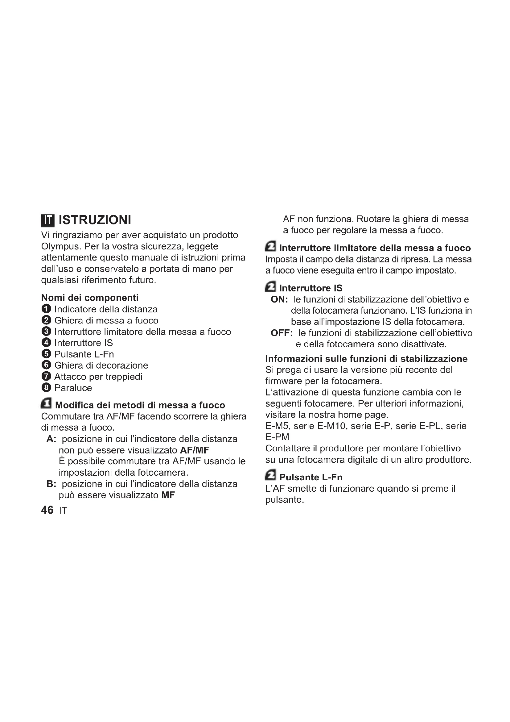 - 46 IT ISTRUZIONI Vi ringraziamo per aver acquistato un prodotto Olympus. Per la vostra sicurezza, leggete attentamente questo manuale di istruzioni prima dell’uso e conservatelo a portata di mano per qualsiasi riferimento futuro. Nomi dei componenti 1 Indicatore della distanza 2 Ghiera di messa a fuoco 3 Interruttore limitatore della messa a fuoco 4 Interruttore IS 5 Pulsante L-Fn 6 Ghiera di decorazione 7 Attacco per treppiedi 8 Paraluce Modifica dei metodi di messa a fuoco Commutare tra AF/MF facendo scorrere la ghiera di messa a fuoco. A: posizione in cui l’indicatore della distanza non può essere visualizzato AF/MF È possibile commutare tra AF/MF usando le impostazioni della fotocamera. B: posizione in cui l’indicatore della distanza può essere visualizzato MF AF non funziona. Ruotare la ghiera di messa a fuoco per regolare la messa a fuoco. Interruttore limitatore della messa a fuoco Imposta il campo della distanza di ripresa. La messa a fuoco viene eseguita entro il campo impostato. Interruttore IS ON: le funzioni di stabilizzazione dell’obiettivo e della fotocamera funzionano. L’IS funziona in base all’impostazione IS della fotocamera. OFF: le funzioni di stabilizzazione dell’obiettivo e della fotocamera sono disattivate. Informazioni sulle funzioni di stabilizzazione Si prega di usare la versione più recente del firmware per la fotocamera. L’attivazione di questa funzione cambia con le seguenti fotocamere. Per ulteriori informazioni, visitare la nostra home page. E-M5, serie E-M10, serie E-P, serie E-PL, serie E-PM Contattare il produttore per montare l’obiettivo su una fotocamera digitale di un altro produttore. Pulsante L-Fn L’AF smette di funzionare quando si preme il pulsante. ITIT 47 Rimozione dell’attacco per treppiedi e installazione della ghiera di decorazione Rimozione dell’attacco per treppiedi: Ruotare la manopola dell’attacco per treppiedi verso sinistra per allentarla 1. Ruotare l’attacco per treppiedi verso sinistra, allinearlo con il segno 2, quindi rimuoverlo dal corpo dell’obiettivo 3. Installazione della ghiera di decorazione: Allineare i segni e inserire la ghiera di decorazione 1, quindi ruotarla a destra finché non si arresta 2. Come utilizzare il paraluce Tirarlo verso l’esterno finché non si arresta 1, quindi ruotarlo a destra 2. Il paraluce non può essere rimosso dall’obiettivo. Note sulla ripresa