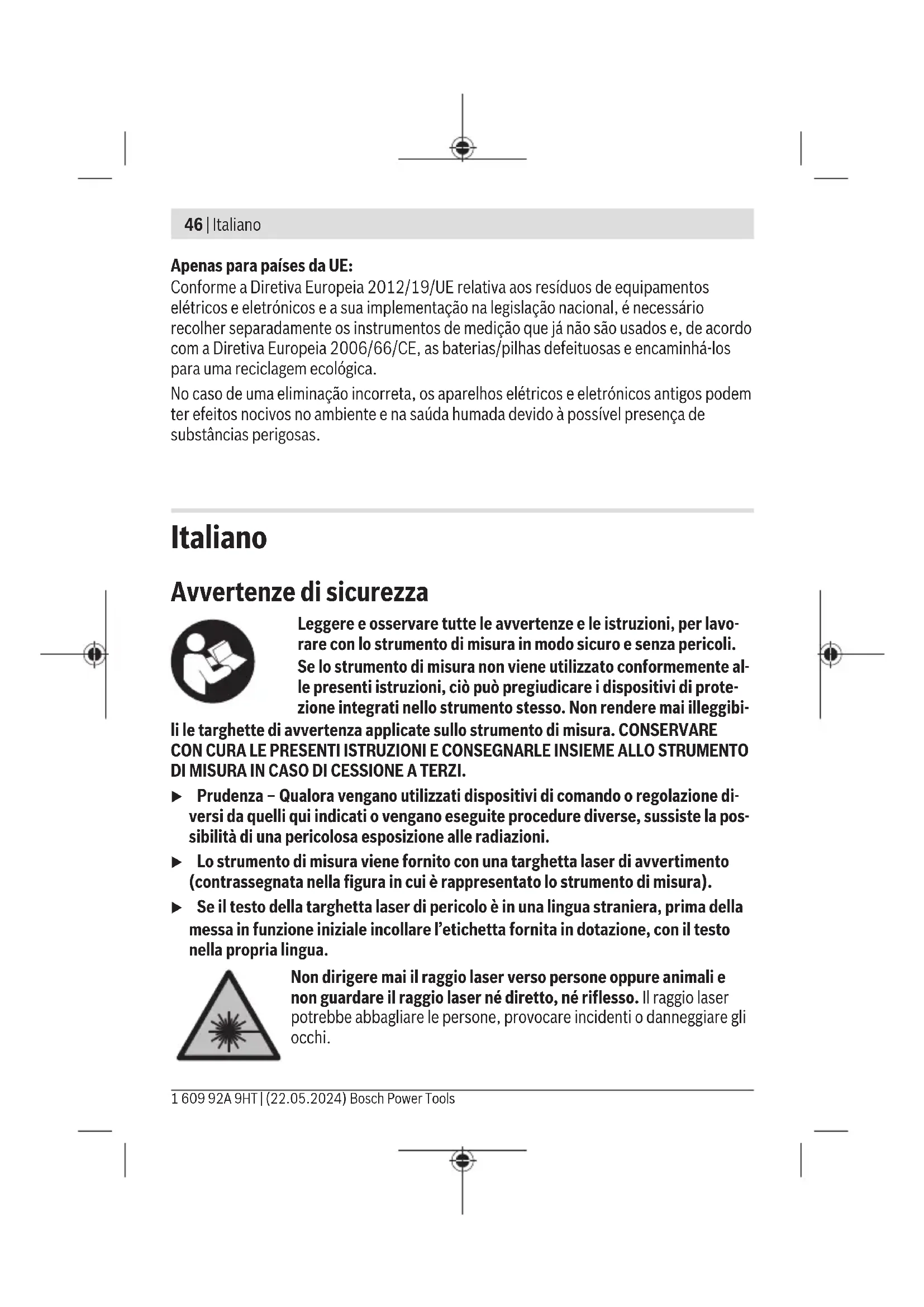 con 20–25°C C) I valori indicati presuppongono condizioni ambientali normali e/o favorevoli (ad esempio assen- za di vibrazioni, nebbia, fumo, nessuna irradiazione solare diretta). In seguito a violente oscilla- zioni di temperatura è possibile che si riscontrino perdite di precisione. D) Presenza esclusivamente di contaminazioni non conduttive, ma che, in alcune occasioni, posso- no essere rese temporaneamente conduttive dalla condensa. E) Peso senza pile/batterie Per un’identificazione univoca dello strumento di misura, consultare il numero di serie (10) riportato sulla targhetta identificativa. Montaggio Introduzione/sostituzione delle pile Per il funzionamento dello strumento di misura, si consiglia di utilizzare pile alcaline al manganese, oppure batterie. Bosch Power Tools 1 609 92A 9HT | (22.05.2024)50 | Italiano Per aprire il coperchio vano pile(8), premere sul dispositivo di bloccaggio(7) e preleva- re il coperchio vano pile. Introdurre le pile o le batterie ricaricabili. Durante tale fase, prestare attenzione alla corretta polarità, riportata sul lato interno del vano batterie. Se le pile o le batterie sono esaurite, l’indicatore di stato(3) si illuminerà con luce rossa e i raggi laser verranno disattivati. Spegnere lo strumento di misura e sostituire le pile o le batterie. Sostituire sempre contemporaneamente tutte le pile, o tutte le batterie. Utilizzare esclu- sivamente pile o batterie dello stesso produttore e della stessa capacità. u Se lo strumento di misura non viene impiegato per lunghi periodi, prelevare le pi- le o le batterie dallo strumento stesso. Se lasciate a lungo all’interno dello strumen- to di misura, le pile e le batterie potrebbero corrodersi. Utilizzo Messa in funzione u Proteggere lo strumento di misura da liquidi e dall’esposizione diretta ai raggi solari. u Non esporre lo strumento di misura a temperature o ad oscillazioni termiche estreme. Ad esempio, evitare di lasciarlo per lungo tempo all’interno dell’auto. In ca- so di forti oscillazioni di temperatura, lasciare che lo strumento di misura raggiunga la normale temperatura prima di metterlo in funzione. Temperature oppure sbalzi di temperatura estremi possono pregiudicare la precisione dello strumento di misura. u Evitare di urtare violentemente o di far cadere lo strumento di misura. Eventuali danno allo strumento di misura possono comprometterne la precisione. Dopo un urto violento o una caduta, a scopo di controllo confrontare la linea laser con una linea di riferimento nota, orizzontale o verticale, oppure con punti a piombo verificati. u Spegnere lo strumento di misura, quando occorra trasportalo. Spegnendo lo stru- mento, viene bloccata l’unità oscillante che altrimenti potrebbe venire danneggiata in caso di movimenti violenti. Avio/arresto Per accendere lo strumento di misura, spingere l’interruttore di avvio/arresto(5) in po- sizione ON. Subito dopo l’accensione, lo strumento di misura proietterà linee laser dall’apertura di uscita anteriore (1). u Non dirigere mai il raggio laser su persone oppure su animali e non rivolgere lo sguardo in direzione del raggio laser stesso, neanche da grande distanza. 1 609 92A 9HT | (22.05.2024) Bosch Power ToolsItaliano | 51 Per spegnere lo strumento di misura, spingere l’interruttore di accensione/spegnimento (5) in posizione OFF. In fase di spegnimento, l’unità oscillante verrà bloccata. u Non lasciare incustodito lo strumento di misura quando è acceso e spegnerlo sempre dopo l’uso. Altre persone potrebbero essere abbagliate dal raggio laser. Modalità Lo strumento di misura dispone di modalità di funzionamento, fra le quali è sempre pos- sibile scegliere: – Modalità a linee incrociate (vedere figg.A−B): genera una linea laser orizzontale e una verticale, – Modalità a linee incrociate e punto a piombo (vedere fig.C): genera una linea laser orizzontale e una verticale e un punto a piombo verso l’alto e verso il basso, – Modalità punto a piombo: genera rispettivamente un punto a piombo verso l’alto e verso il basso. Dopo l’accensione lo strumento di misura si trova nel modo operativo a linee incrociate con funzione di autolivellamento. Per cambiare modalità, premere il tasto di modalità laser(4) fino a quando i raggi laser vengano proiettati nella modalità desiderata. Tutte le modalità operative sono disponibili sia con funzione di autolivellamento, sia con funzione di inclinazione. Livellamento automatico Funzionamento con il sistema di autolivellamento (vederefigg.AeC) Durante il lavoro con la funzione di autolivellamento l’indicatore di stato(3) non può illu- minarsi. All’occorrenza attivare nuovamente la funzione di autolivellamento premendo il tasto funzione di inclinazione(2), in modo che l’indicatore di stato scompaia. Posizionare lo strumento di misura su un supporto stabile ed orizzontale oppure fissarlo sul treppiede(11). Il livellamento automatico compenserà automaticamente le irregolarità, entro il campo di autolivellamento di ±4°. Il livellamento sarà terminato quando le linee laser cesseranno di spostarsi. Se il livellamento automatico non è disponibile, ad esempio perché il piano di appoggio dello strumento di misura si discosta di oltre 4° dalla retta orizzontale, i raggi laser inizia- no a lampeggiare. In tale caso, sistemare lo strumento di misura orizzontalmente e attendere l’autolivella- mento. Non appena lo strumento di misura si trova all’interno del campo di autolivella- mento di ±4°, i raggi laser si illuminano in modo permanente. Bosch Power Tools 1 609 92A 9HT | (22.05.2024)52 | Italiano Al di fuori del campo di autolivellamento di ±4° non è possibile lavorare con la funzione di autolivellamento, poiché altrimenti né la precisione di livellamento dei raggi laser, né l’angolo destro tra i raggi laser possono essere garantiti. In caso di vibrazioni o variazioni di lunghezza durante il funzionamento, il livellamento dello strumento di misura verr