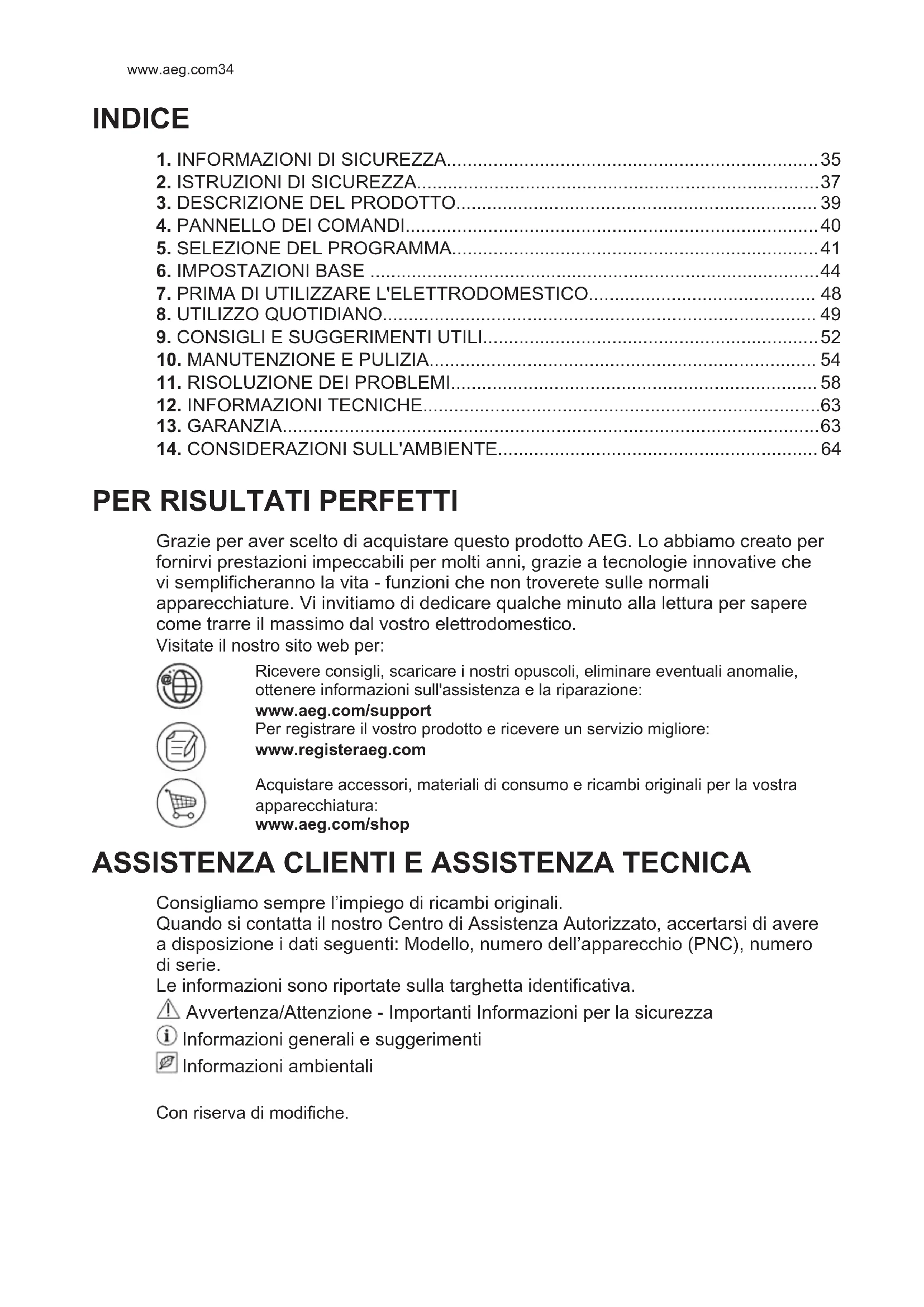 Grazie per aver scelto di acquistare questo prodotto AEG. Lo abbiamo creato per fornirvi prestazioni impeccabili per molti anni, grazie a tecnologie innovative che vi semplificheranno la vita - funzioni che non troverete sulle normali apparecchiature. Vi invitiamo di dedicare qualche minuto alla lettura per sapere come trarre il massimo dal vostro elettrodomestico. Visitate il nostro sito web per: Ricevere consigli, scaricare i nostri opuscoli, eliminare eventuali anomalie, ottenere informazioni sull'assistenza e la riparazione: www.aeg.com/support Per registrare il vostro prodotto e ricevere un servizio migliore: www.registeraeg.com Acquistare accessori, materiali di consumo e ricambi originali per la vostra apparecchiatura: www.aeg.com/shop