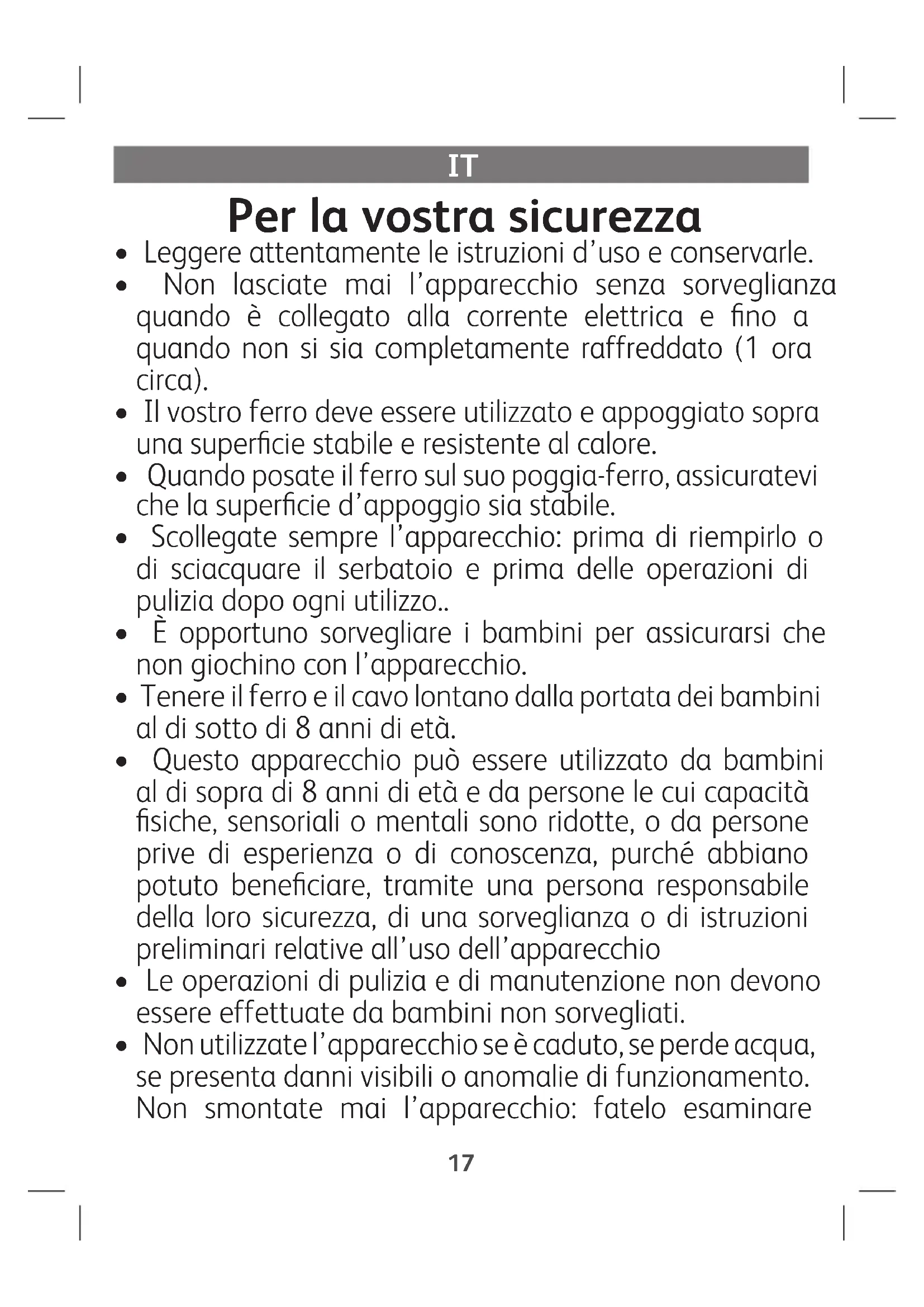 - Tenere il ferro e il cavo lontano dalla portata dei bambini al di sotto di 8 anni di età.