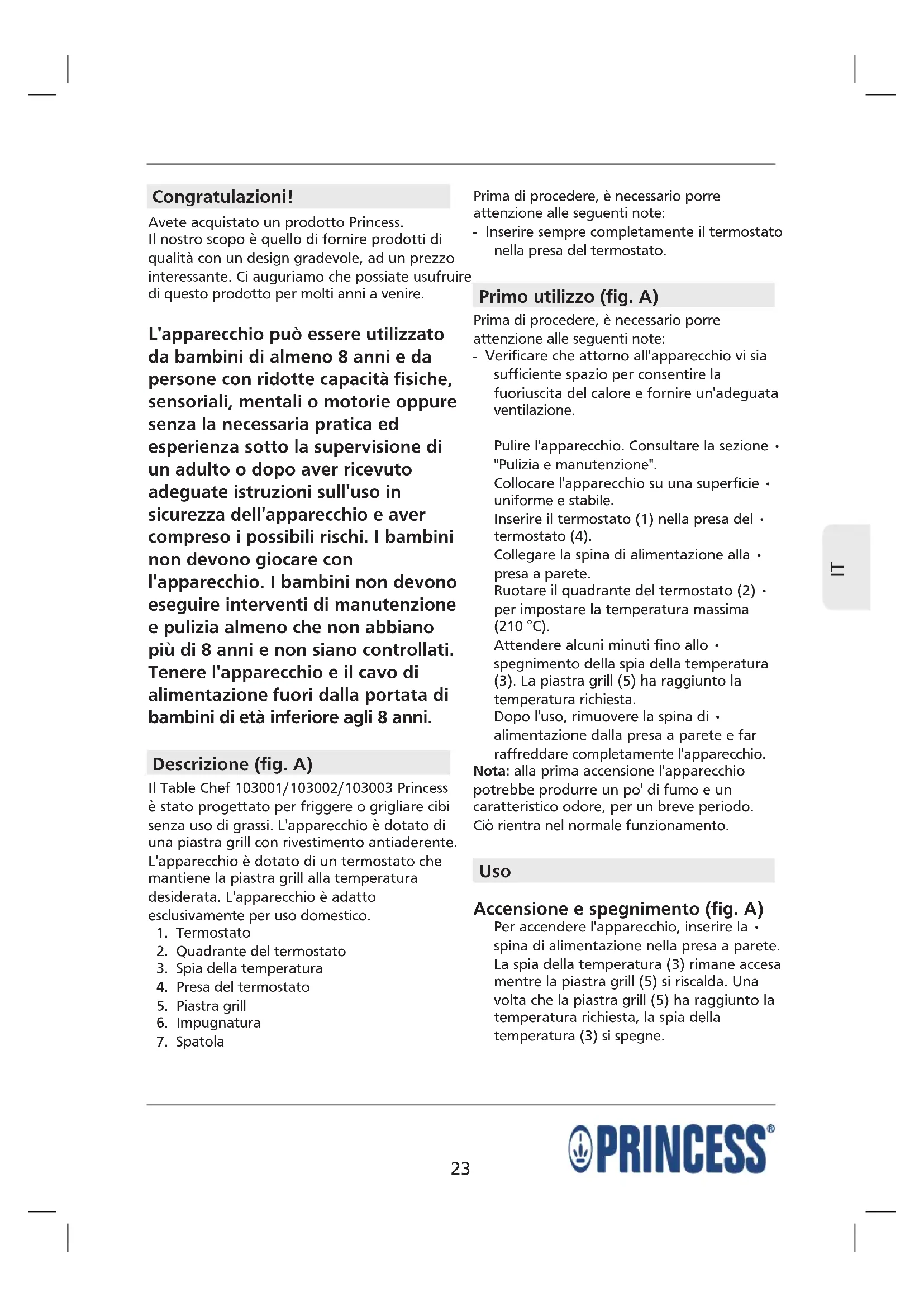 Congratulazioni! Avete acquistato un prodotto Princess. Il nostro scopo è quello di fornire prodotti di qualità con un design gradevole, ad un prezzo interessante. Ci auguriamo che possiate usufruire di questo prodotto per molti anni a venire. L'apparecchio può essere utilizzato da bambini di almeno 8 anni e da persone con ridotte capacità fisiche, sensoriali, mentali o motorie oppure senza la necessaria pratica ed esperienza sotto la supervisione di un adulto o dopo aver ricevuto adeguate istruzioni sull'uso in sicurezza dell'apparecchio e aver compreso i possibili rischi. I bambini non devono giocare con l'apparecchio. I bambini non devono eseguire interventi di manutenzione e pulizia almeno che non abbiano più di 8 anni e non siano controllati. Tenere l'apparecchio e il cavo di alimentazione fuori dalla portata di bambini di età inferiore agli 8 anni. Descrizione (fig. A) Il Table Chef 103001/103002/103003 Princess è stato progettato per friggere o grigliare cibi senza uso di grassi. L'apparecchio è dotato di una piastra grill con rivestimento antiaderente. L'apparecchio è dotato di un termostato che mantiene la piastra grill alla temperatura desiderata. L'apparecchio è adatto esclusivamente per uso domestico.