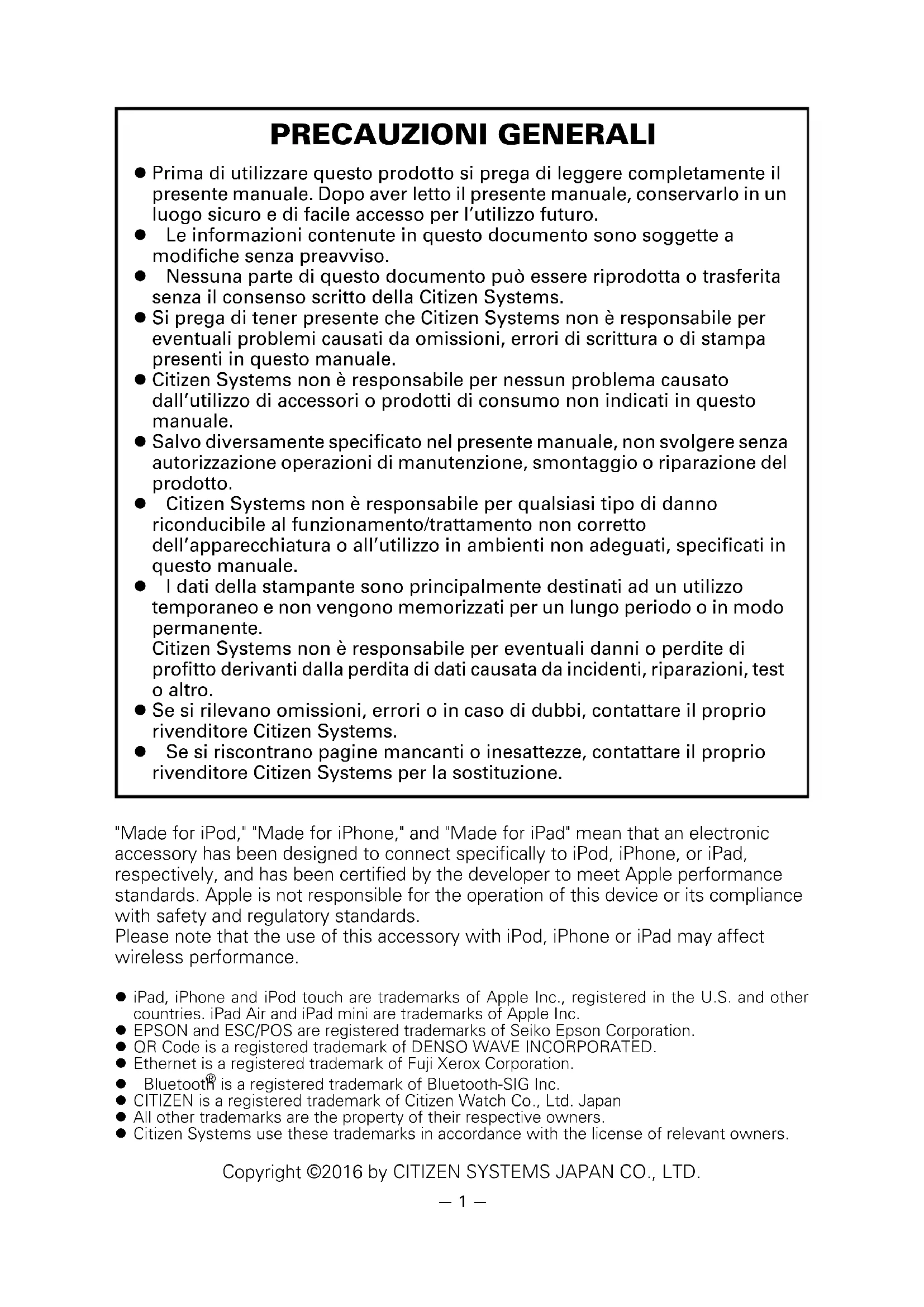 is a registered trademark of Bluetooth-SIG Inc. CITIZEN is a registered trademark of Citizen Watch Co., Ltd. Japan All other trademarks are the property of their respective owners. Citizen Systems use these trademarks in accordance with the license of relevant owners. Copyright ©2016 by CITIZEN SYSTEMS JAPAN CO., LTD.—2— Prima di utilizzare il prodotto per la prima volta, leggere attentamente le PRECAUZIONI DI SICUREZZA, l’uso improprio può causare incidenti (incendio, scariche elettriche e lesioni). Per evitare il rischio di lesioni ad operatori e a terzi o danni ad oggetti, nel presente manuale vengono usati speciali simboli di avvertenza per indicare i punti importanti che richiedono una stretta osservanza. Dopo aver letto il presente manuale, conservarlo in un luogo sicuro e di facile accesso per l’utilizzo futuro. Alcune delle descrizioni contenute in questo manuale potrebbero non essere rilevanti per alcuni modelli di stampante. Quanto segue è la descrizione del livello di rischio e di danno che potrebbe verificarsi se la stampante non viene usata correttamente, ignorando le istruzioni fornite dai simboli di avvertenza.