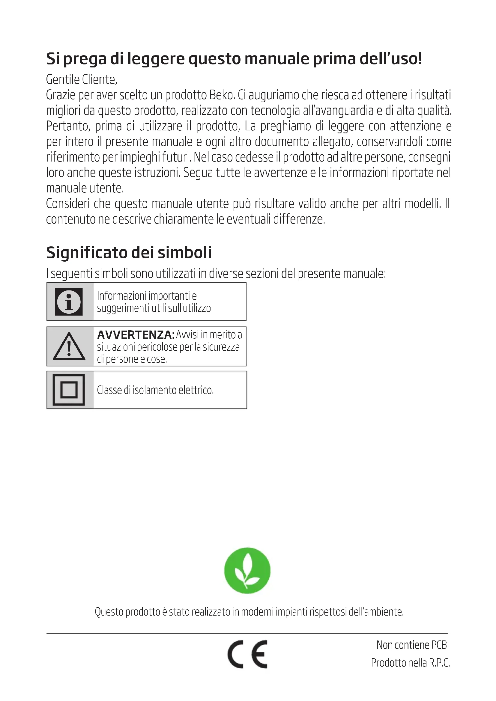 - Toute chute de l’appareil peut le rendre non opérationnel ou l’endommager de façon permanente. SGA7126PSGA7124BSteam StatonUser Manual01M-8834133200-4716-0501M-8834593200-4716-05ENDE FR TRESPLHR RO THSi prega di leggere questo manuale prima dell’uso! Gentile Cliente, Grazie per aver scelto un prodotto Beko. Ci auguriamo che riesca ad ottenere i risultati migliori da questo prodotto, realizzato con tecnologia all’avanguardia e di alta qualità. Pertanto, prima di utilizzare il prodotto, La preghiamo di leggere con attenzione e per intero il presente manuale e ogni altro documento allegato, conservandoli come riferimento per impieghi futuri. Nel caso cedesse il prodotto ad altre persone, consegni loro anche queste istruzioni. Segua tutte le avvertenze e le informazioni riportate nel manuale utente. Consideri che questo manuale utente può risultare valido anche per altri modelli. Il contenuto ne descrive chiaramente le eventuali differenze. Significato dei simboli I seguenti simboli sono utilizzati in diverse sezioni del presente manuale: