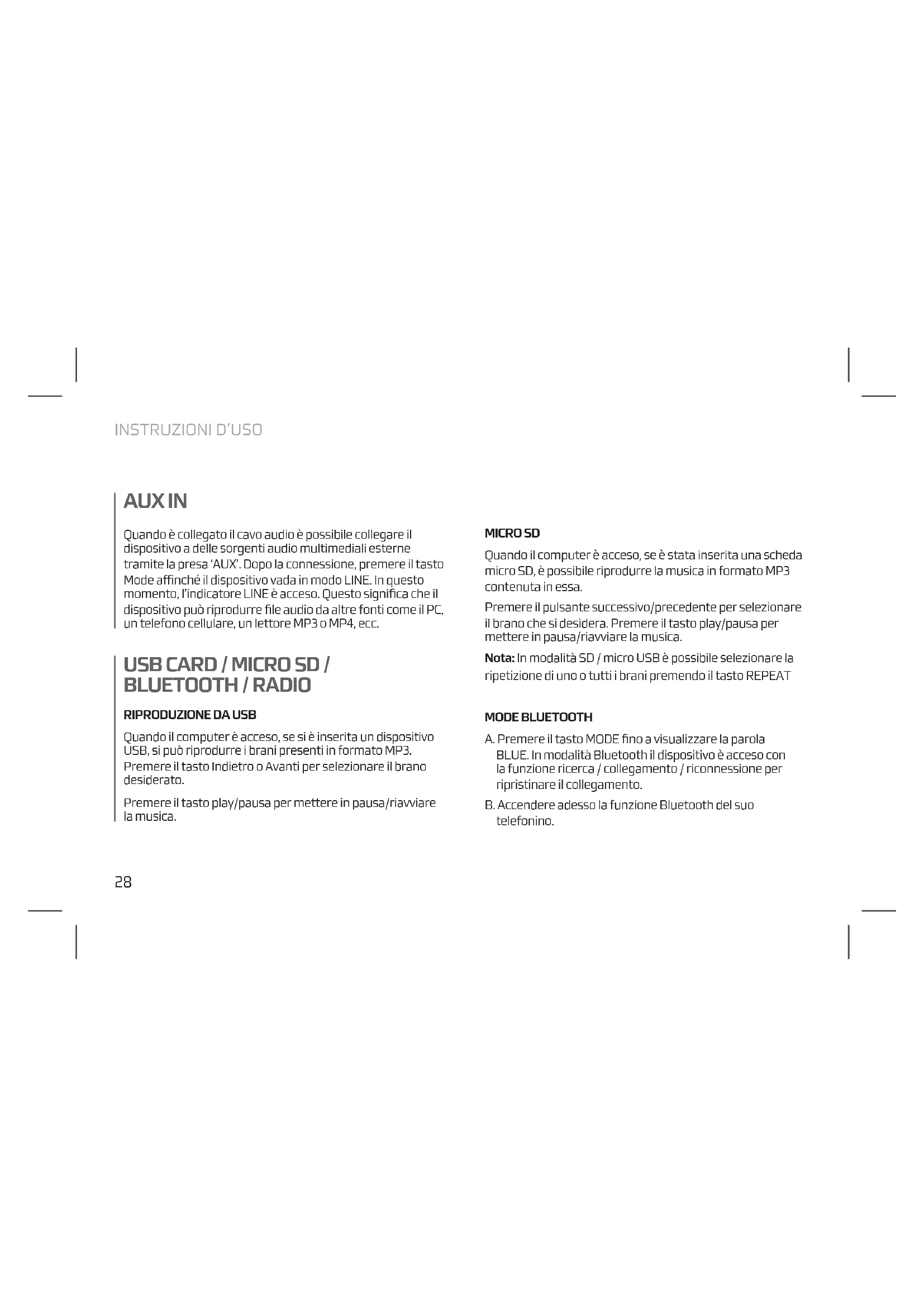 BLUETOOTH / RADIO AUX IN Quando è collegato il cavo audio è possibile collegare il dispositivo a delle sorgenti audio multimediali esterne tramite la presa ‘AUX’. Dopo la connessione, premere il tasto Mode affinché il dispositivo vada in modo LINE. In questo momento, l’indicatore LINE è acceso. Questo significa che il dispositivo può riprodurre file audio da altre fonti come il PC, un telefono cellulare, un lettore MP3 o MP4, ecc.