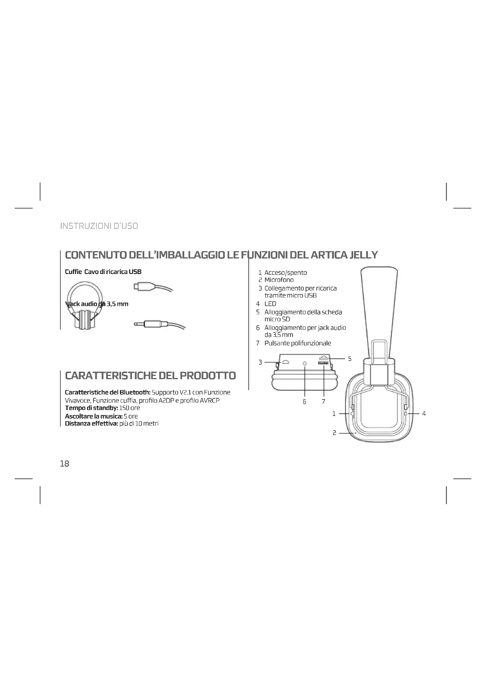 Acceso/spento Microfono Collegamento per ricarica tramite micro USB LED Alloggiamento della scheda micro SD Alloggiamento per jack audio da 3,5 mm Pulsante polifunzionaleITALIANO