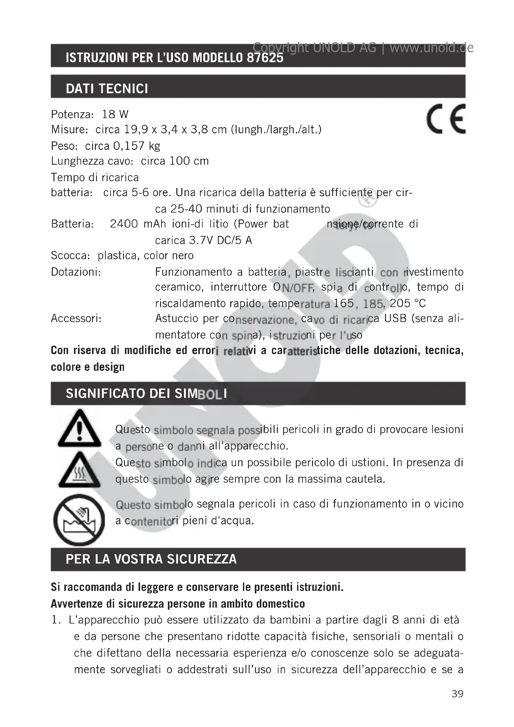 e da persone che presentano ridotte capacità fisiche, sensoriali o mentali o che difettano della necessaria esperienza e/o conoscenze solo se adeguata- mente sorvegliati o addestrati sull’uso in sicurezza dell’apparecchio e se a Potenza: 18 W Misure: circa 19,9 x 3,4 x 3,8 cm (lungh./largh./alt.) Peso: circa 0,157 kg Lunghezza cavo: circa 100 cm Tempo di ricarica batteria: circa 5-6 ore. Una ricarica della batteria è sufficiente per cir- ca 25-40 minuti di funzionamento Batteria: 2400 mAh ioni-di litio (Power battery) tensione/corrente di carica 3.7V DC/5 A Scocca: plastica, color nero Dotazioni: Funzionamento a batteria, piastre liscianti con rivestimento ceramico, interruttore ON/OFF, spia di controllo, tempo di riscaldamento rapido, temperatura 165, 185, 205 °C Accessori: Astuccio per conservazione, cavo di ricarica USB (senza ali- mentatore con spina), istruzioni per l’uso Con riserva di modifiche ed errori relativi a caratteristiche delle dotazioni, tecnica, colore e design Copyright UNOLD AG | www.unold.de40 conoscenza dei rischi correlati. L’apparecchio non è un giocattolo. La pulizia e la manutenzione dell’apparecchio possono essere effettuate da bambini sol- tanto sotto sorveglianza.