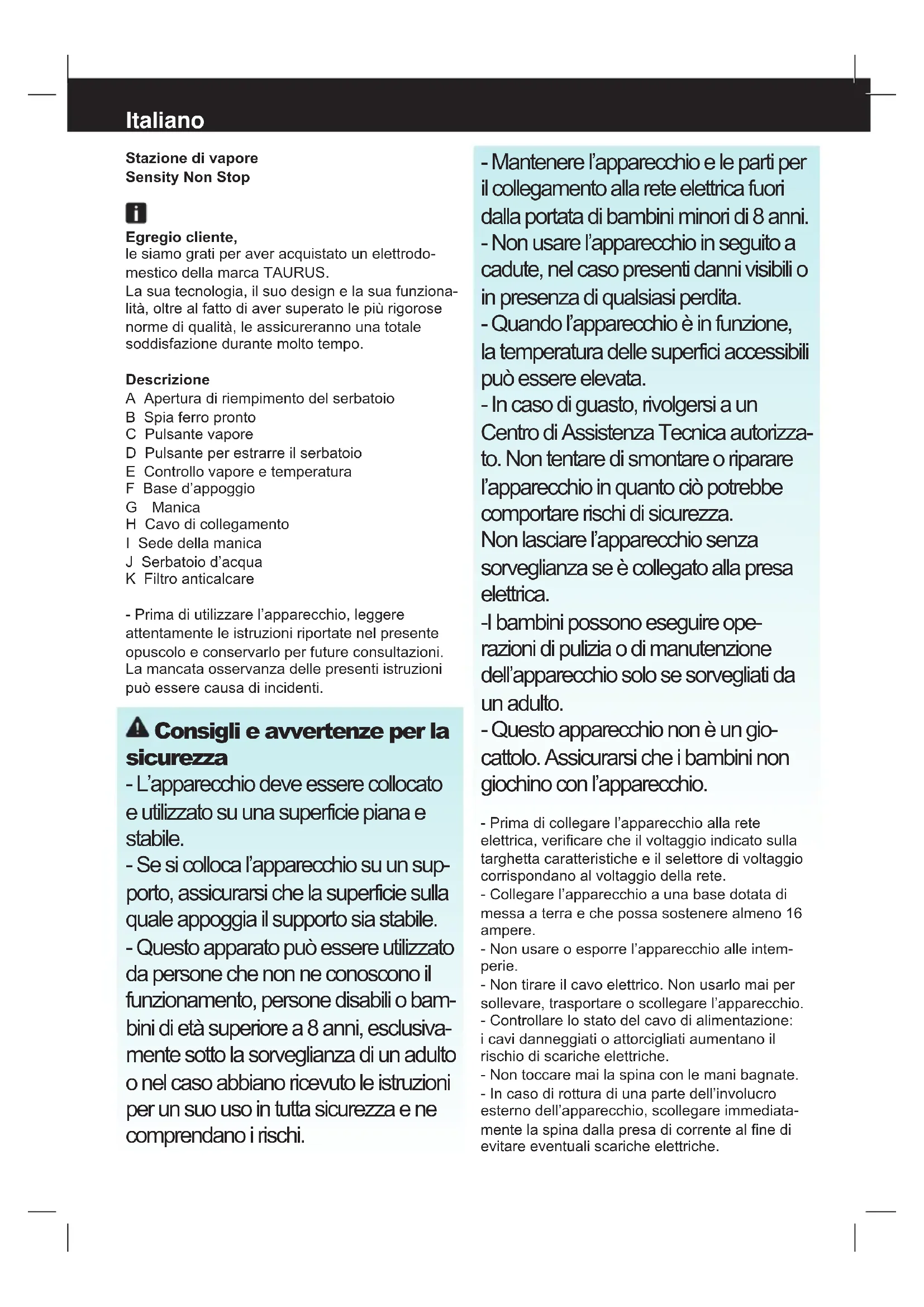 - Wiederholen Sie den Reinigungsvorgang min- destens zweimal. ** Wir empfehlen den Prozess einmal im Monat durchzuführen, um die Lebensdauer des Büge- lzentrums zu verlängern. Wenn das Wasser in Ihrer Gegend sehr hart ist oder wenn beim Büge- ln, Kalk aus der Bügelsohle kommt, verwenden Sie diese Funktion öfter.Anomalien und Reparatur - Bei Schäden und Störungen bringen Sie das Gerät zu einem zugelassenen Technischen Kun- dendienst. Versuchen Sie nicht, das Gerät selbst auseinanderzubauen und zu reparieren. Dabei kann es zu Gefahrensituationen kommen. Für die EU-Ausführungen des Produkts und/oder für Länder, in denen diese Vorschriften anzuwen- den sind: Ökologie und Recycling des Produkts - Die zur Herstellung des Verpackungsmaterials dieses Geräts verwendeten Materialien sind im Sammel-, Klassizierungs- und Recyclingsystem integriert. Wenn Sie es entsorgen möchten, so können Sie die öffentlichen Container für die betreffenden Materialarten verwenden. - Das Produkt enthält keine Konzentration von Substanzen, die als umweltschädigend zu de- nieren sind. Dieses Symbol weist darauf hin, dass das Produkt, wenn Sie es am Ende seiner Lebensdauer entsorgen wollen, in geeigneter Weise bei einer zugelassenen Entsorgungsstelle abzugeben ist, um die getrennte Sammlung von Elektro- und Elektronikgeräte-Abfall (WEEE) sicherzustellen. Dieses Symbol bedeutet, dass die Oberäche beim Gebrauch sehr heiß werden kann. Dieses Gerät erfüllt die Richtlinie 2014/35/EU über Niederspannung, die Richtlinie 2014/30/ EU über elektromagnetische Verträglichkeit und die Richtlinie 2011/65/EU zur Beschränkung der Verwendung bestimmter gefährlicher Stoffe in Elektro- und Elektronikgeräten..Italiano Stazione di vapore Sensity Non Stop Egregio cliente, le siamo grati per aver acquistato un elettrodo- mestico della marca TAURUS. La sua tecnologia, il suo design e la sua funziona- lità, oltre al fatto di aver superato le più rigorose norme di qualità, le assicureranno una totale soddisfazione durante molto tempo. Descrizione A Apertura di riempimento del serbatoio B Spia ferro pronto C Pulsante vapore D Pulsante per estrarre il serbatoio E Controllo vapore e temperatura F Base d’appoggio G Manica H Cavo di collegamento I Sede della manica J Serbatoio d’acqua K Filtro anticalcare - Prima di utilizzare l’apparecchio, leggere attentamente le istruzioni riportate nel presente opuscolo e conservarlo per future consultazioni. La mancata osservanza delle presenti istruzioni può essere causa di incidenti. Consigli e avvertenze per la sicurezza - L’apparecchio deve essere collocato e utilizzato su una superficie piana e stabile. - Se si colloca l’apparecchio su un sup- porto, assicurarsi che la superficie sulla quale appoggia il supporto sia stabile. - Questo apparato può essere utilizzato da persone che non ne conoscono il funzionamento, persone disabili o bam- bini di età superiore a 8 anni, esclusiva- mente sotto la sorveglianza di un adulto o nel caso abbiano ricevuto le istruzioni per un suo uso in tutta sicurezza e ne comprendano i rischi. - Mantenere l’apparecchio e le parti per il collegamento alla rete elettrica fuori dalla portata di bambini minori di 8 anni. - Non usare l’apparecchio in seguito a cadute, nel caso presenti danni visibili o in presenza di qualsiasi perdita. - Quando l’apparecchio è in funzione, la temperatura delle superfici accessibili può essere elevata. - In caso di guasto, rivolgersi a un Centro di Assistenza Tecnica autorizza- to. Non tentare di smontare o riparare l’apparecchio in quanto ciò potrebbe comportare rischi di sicurezza. Non lasciare l’apparecchio senza sorveglianza se è collegato alla presa elettrica. -I bambini possono eseguire ope- razioni di pulizia o di manutenzione dell’apparecchio solo se sorvegliati da un adulto. - Questo apparecchio non è un gio- cattolo. Assicurarsi che i bambini non giochino con l’apparecchio. - Prima di collegare l’apparecchio alla rete elettrica, vericare che il voltaggio indicato sulla targhetta caratteristiche e il selettore di voltaggio corrispondano al voltaggio della rete. - Collegare l’apparecchio a una base dotata di messa a terra e che possa sostenere almeno 16 ampere. - Non usare o esporre l’apparecchio alle intem- perie. - Non tirare il cavo elettrico. Non usarlo mai per sollevare, trasportare o scollegare l’apparecchio. - Controllare lo stato del cavo di alimentazione: i cavi danneggiati o attorcigliati aumentano il rischio di scariche elettriche. - Non toccare mai la spina con le mani bagnate. - In caso di rottura di una parte dell’involucro esterno dell’apparecchio, scollegare immediata- mente la spina dalla presa di corrente al ne di evitare eventuali scariche elettriche.- Non toccare le parti riscaldate dell’apparecchio perché potrebbero provocare gravi ustioni. Precauzioni d’uso: - Prima di ogni utilizzo, svolgere completamente il cavo dell’apparecchio. - Non usare l’apparecchio se gli accessori o con- sumibili non sono accoppiati correttamente. - Utilizzare il manico/i per prendere o spostare l’apparecchio. - Fare attenzione il livello MASSIMO(Fig. 2. - Scollegare la spina dalla presa di corrente quan- do l’apparecchio non è in uso e prima di eseguire qualsiasi operazione di pulizia. - Questo apparecchio è destinato unicamente all’uso domestico, non professionale o industriale. -Questo apparecchio non deve essere utilizzato da persone (inclusi bambini) con problemi sici, mentali o di sensibilità o con mancanza di espe- rienza e conoscenza - Non riporre l’apparecchio quando ancora caldo. - Per un corretto funzionamento, mantenere la piastra liscia, non applicarla su oggetti meta- llici (per esempio sulla tavola da stiro, bottoni, cerniere...) - IMPORTANTE: Sostituire il ltro ANTICALCARE ogni 30 riempimenti del serbatoio circa o usare acqua demineralizzata con il ltro esaurito. - Si consiglia l’uso di acqua demineralizzata, spe- cialmente se l’