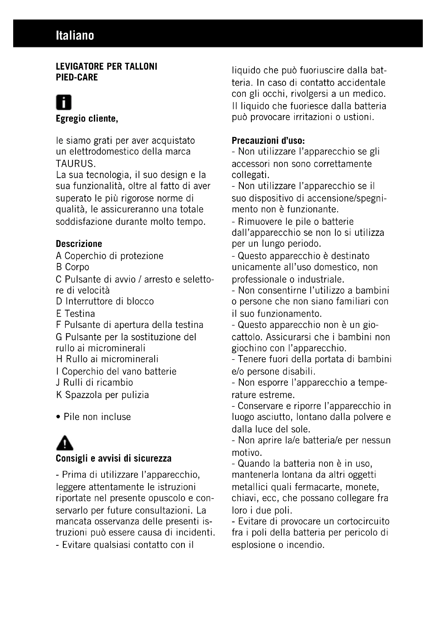 PIED-CARE Egregio cliente, le siamo grati per aver acquistato un elettrodomestico della marca TAURUS. La sua tecnologia, il suo design e la sua funzionalità, oltre al fatto di aver superato le più rigorose norme di qualità, le assicureranno una totale soddisfazione durante molto tempo. Descrizione A Coperchio di protezione B Corpo C Pulsante di avvio / arresto e seletto- re di velocità D Interruttore di blocco E Testina F Pulsante di apertura della testina G Pulsante per la sostituzione del rullo ai microminerali H Rullo ai microminerali I Coperchio del vano batterie J Rulli di ricambio K Spazzola per pulizia